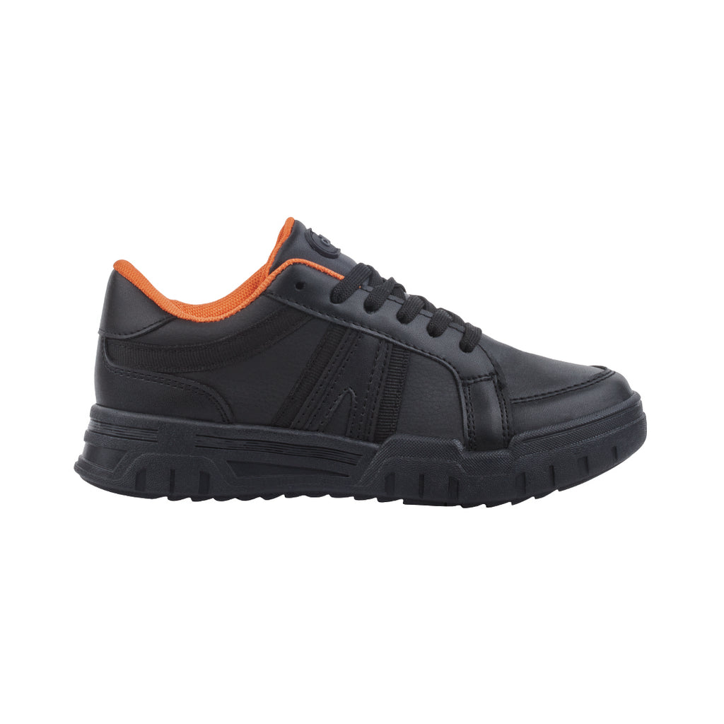 Dúo de tenis escolar de corte sintético y suela inyectada de piso color blanco y negro; detalles laterales con forro marino y naranja. Material: Sintético.