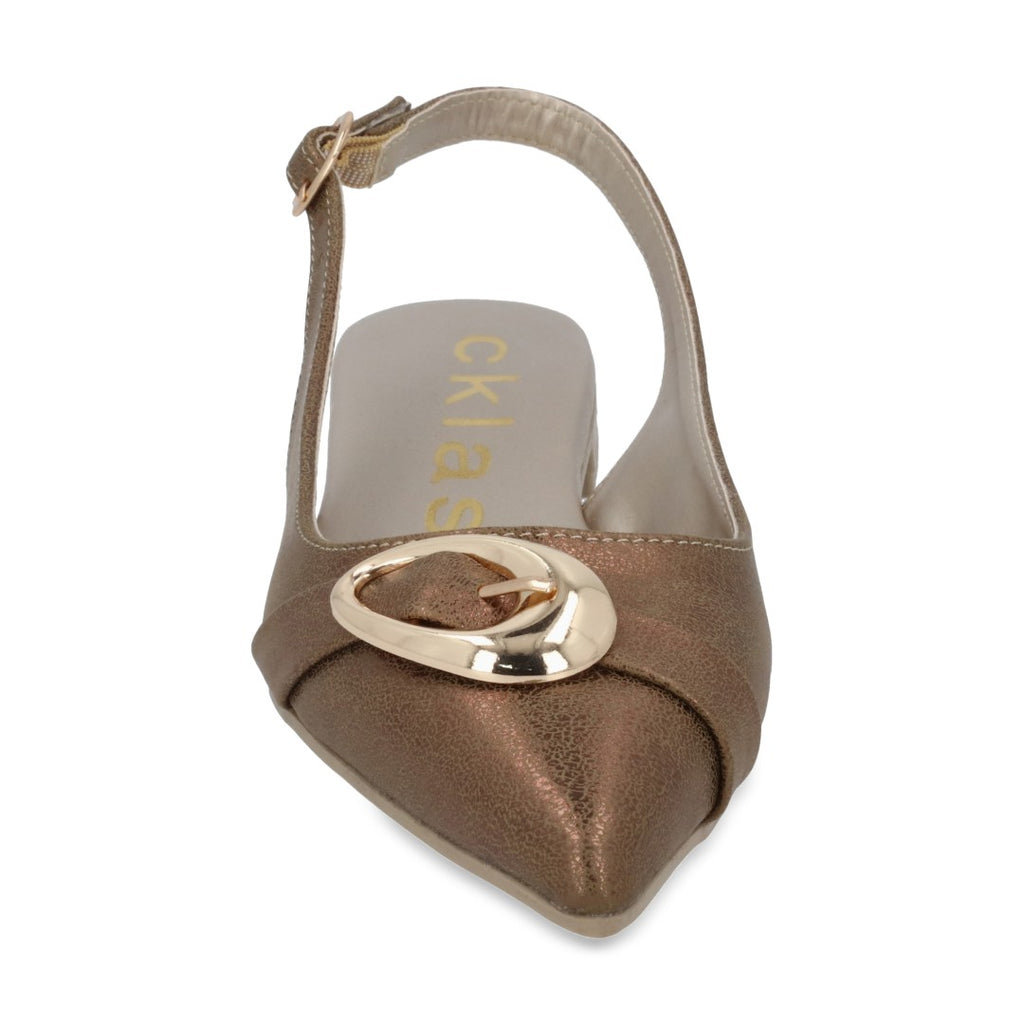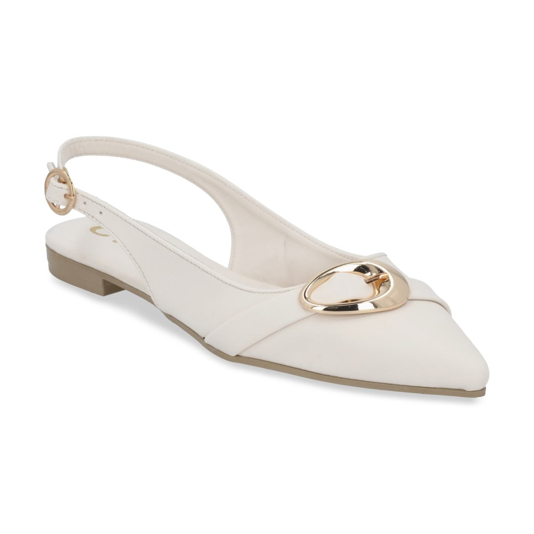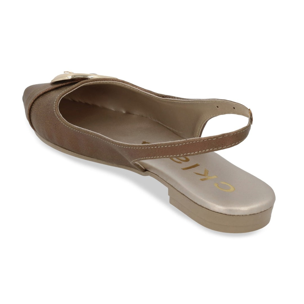 Dúo de balerinas color bronce y hueso destalonada con hebilla ajustable. Detalle de herraje decorativo. Material: Sintético.