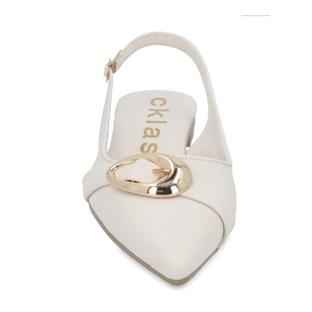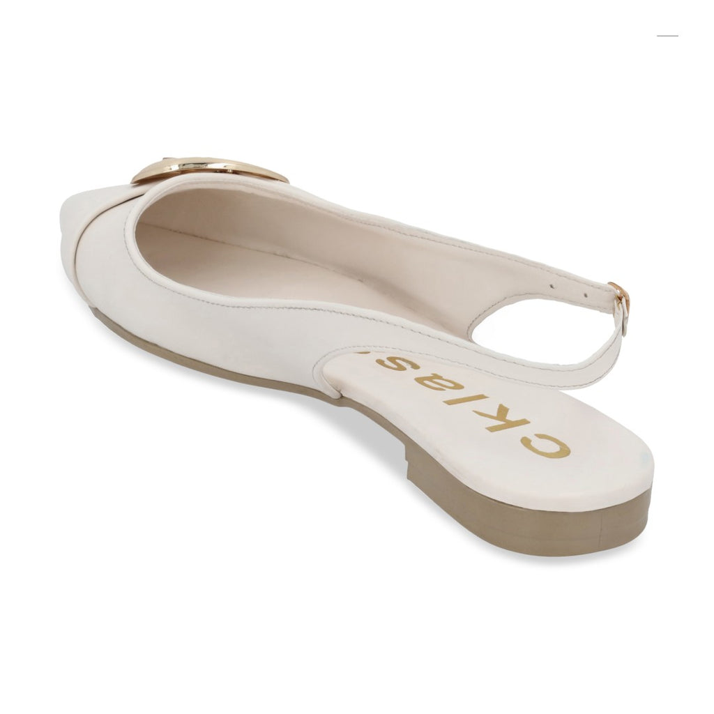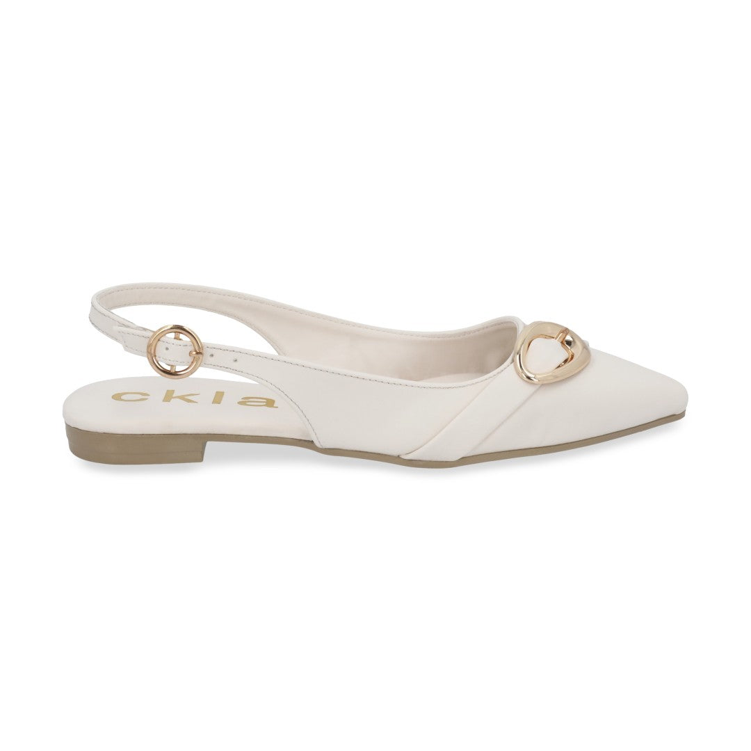 Dúo de balerinas color bronce y hueso destalonada con hebilla ajustable. Detalle de herraje decorativo. Material: Sintético.