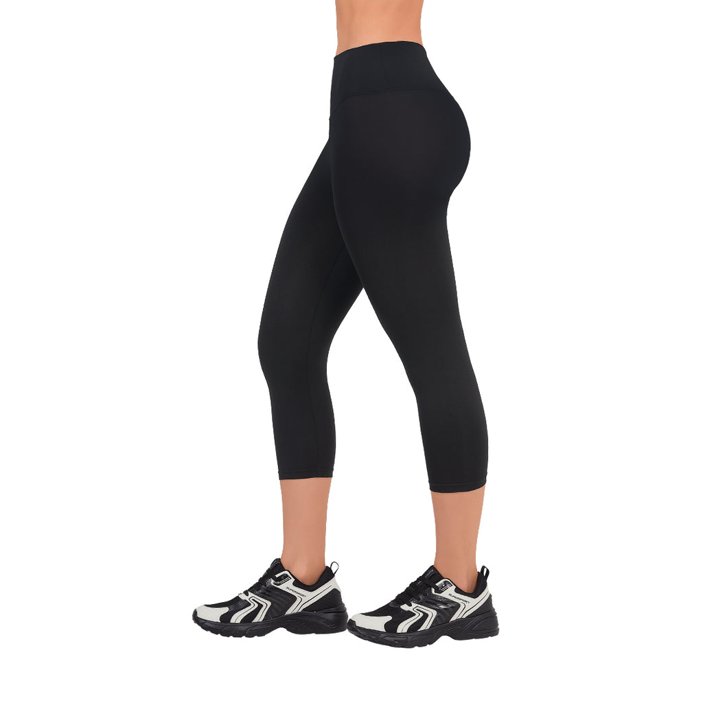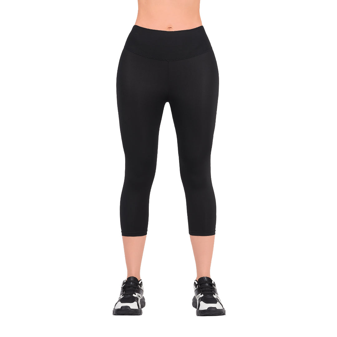 Leggings capri negro con pretina ancha para soporte. Materiales: Poliamida/Elastano.