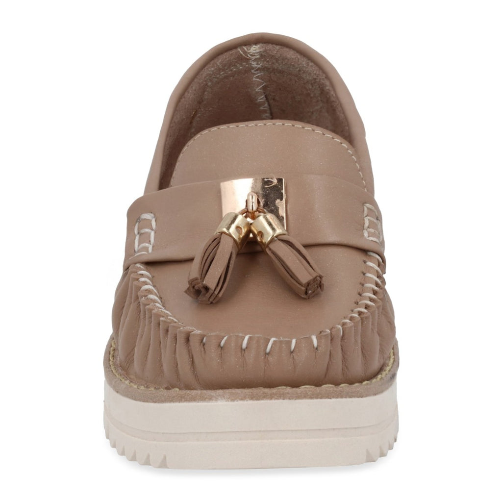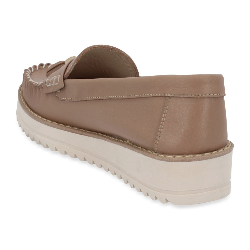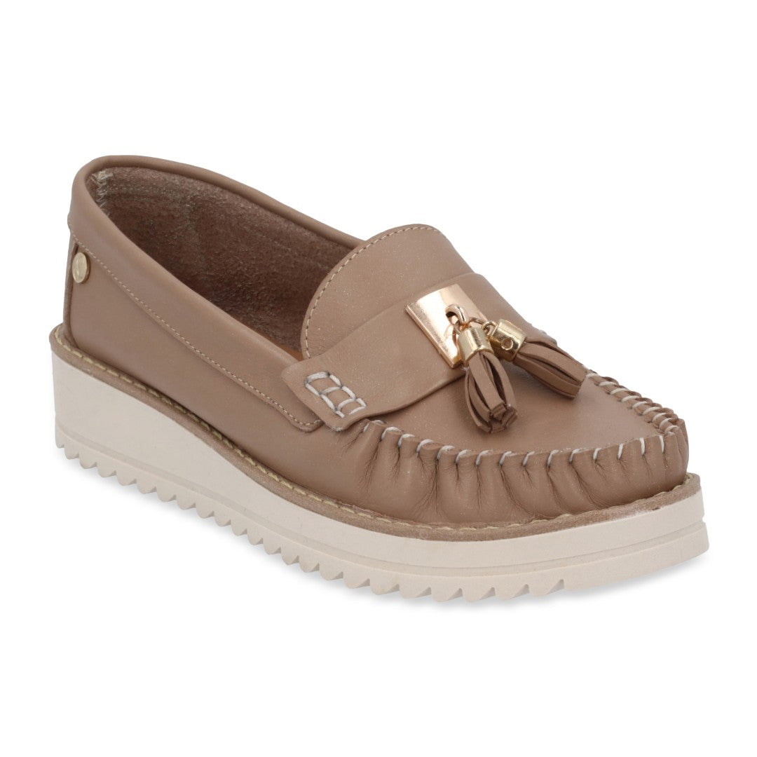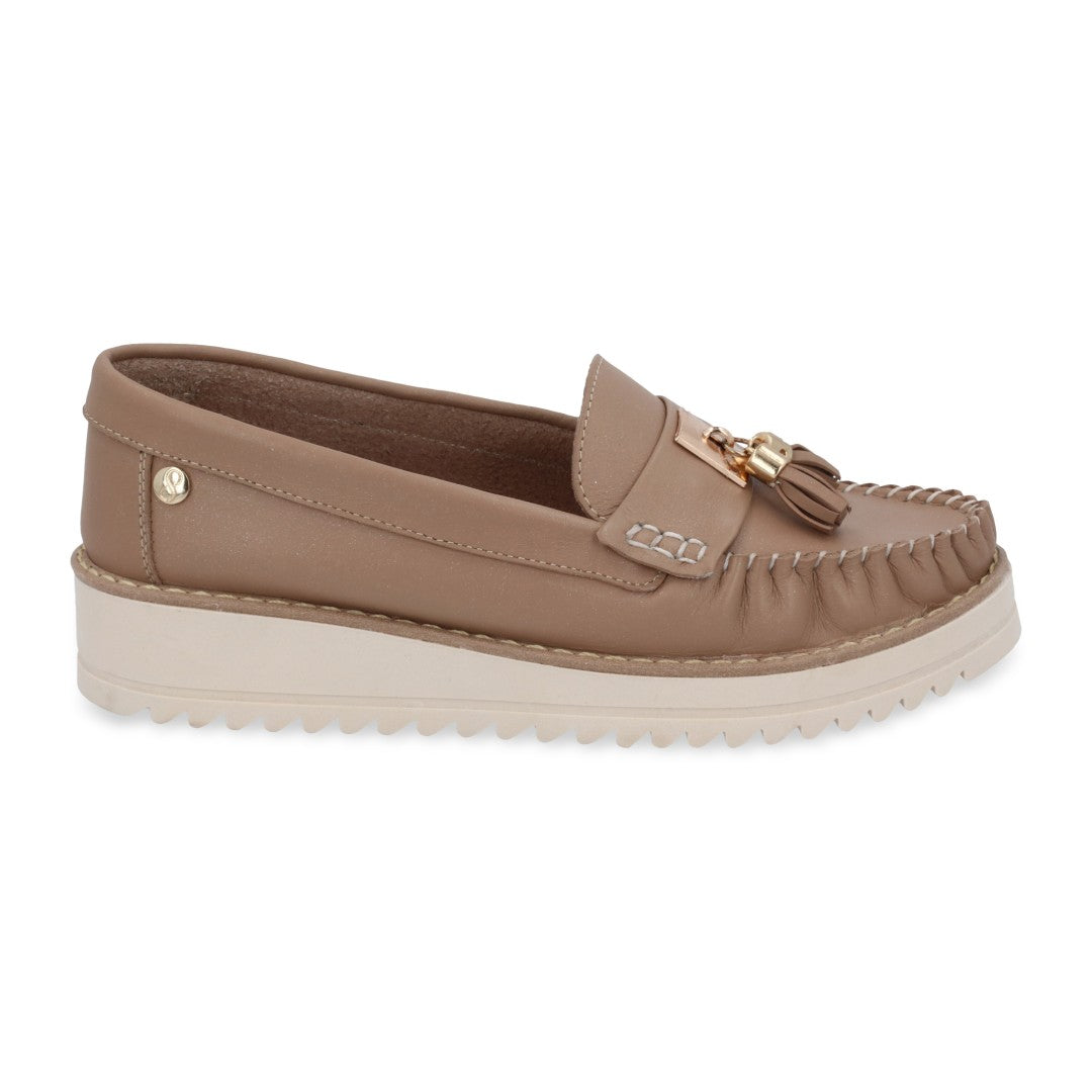 Mocasín casual color beige, con altura de 3.5 cm., detalle de herraje con borlas en antifaz y plantilla de piel. Material: 100% Piel Vacuno.