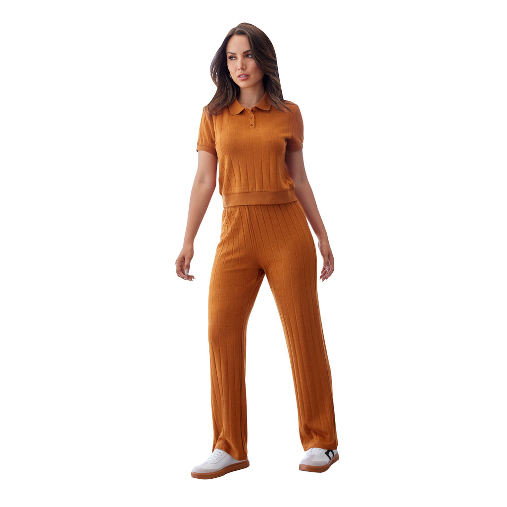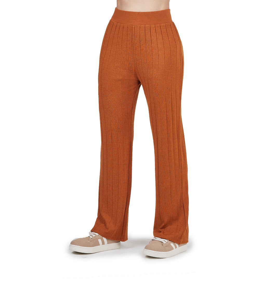 Pantalón café shedrón de punto, pretina elástica de cárdigan, textura de canalé grueso, corte recto.