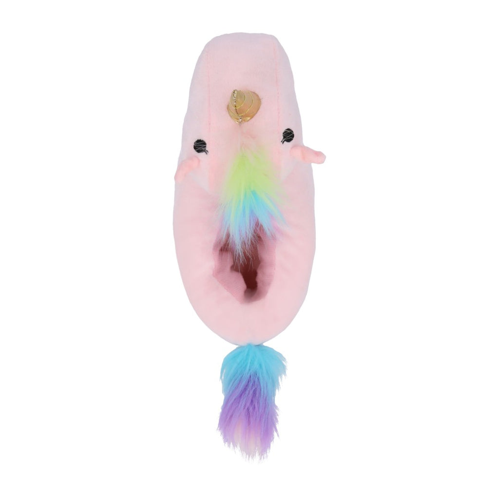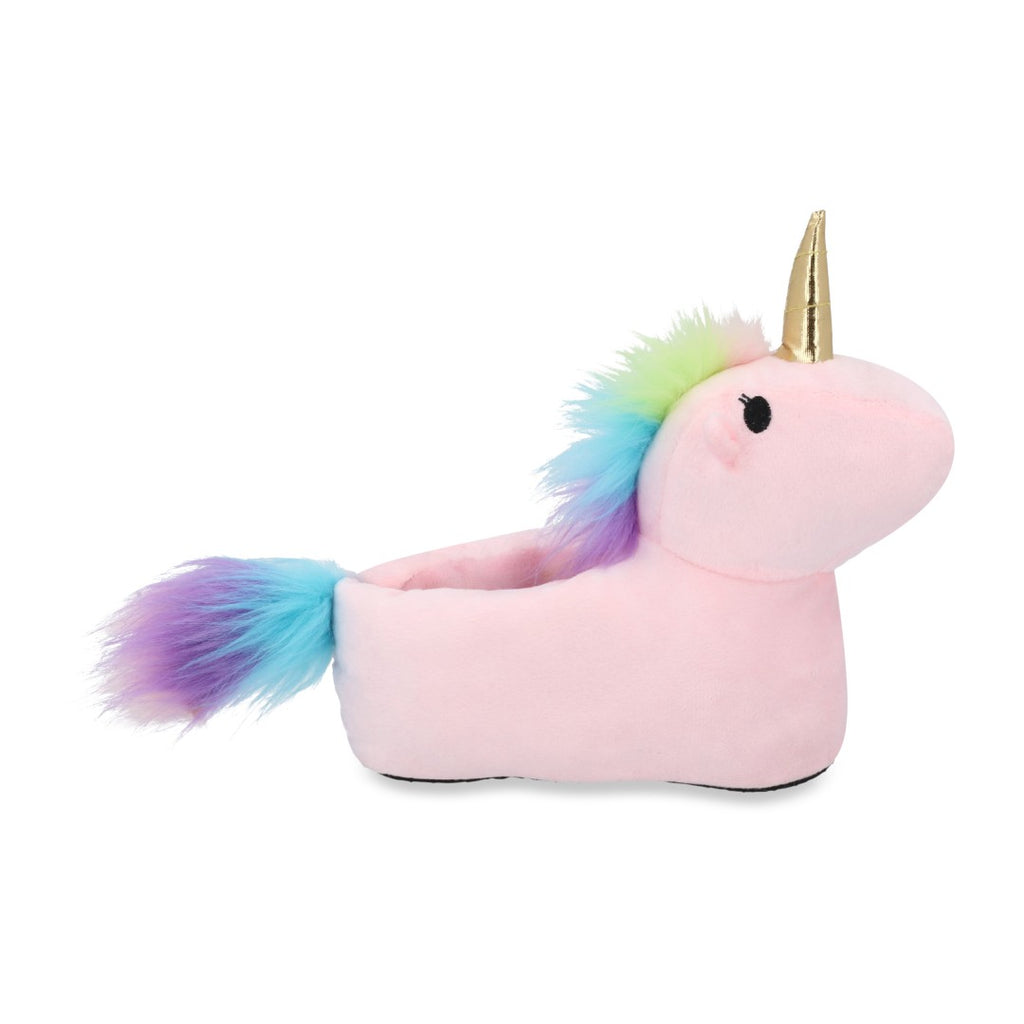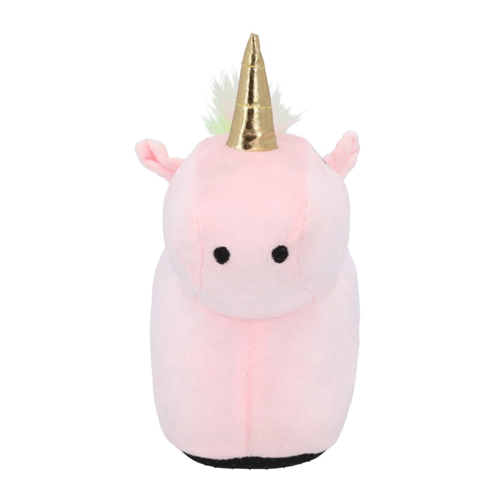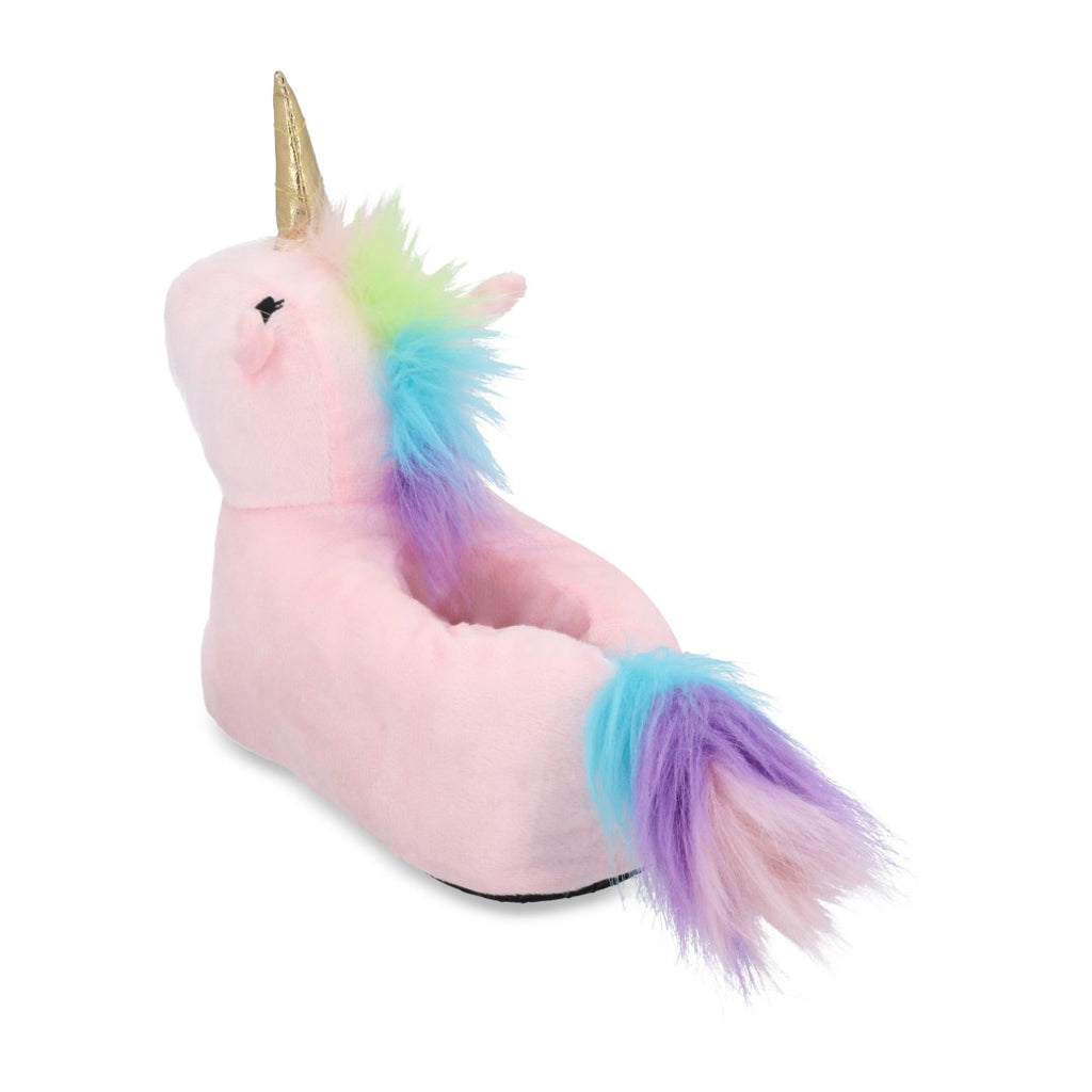 Pantufla de piso color rosa con forma de unicornio. Plantilla: Textil. Material: Textil.