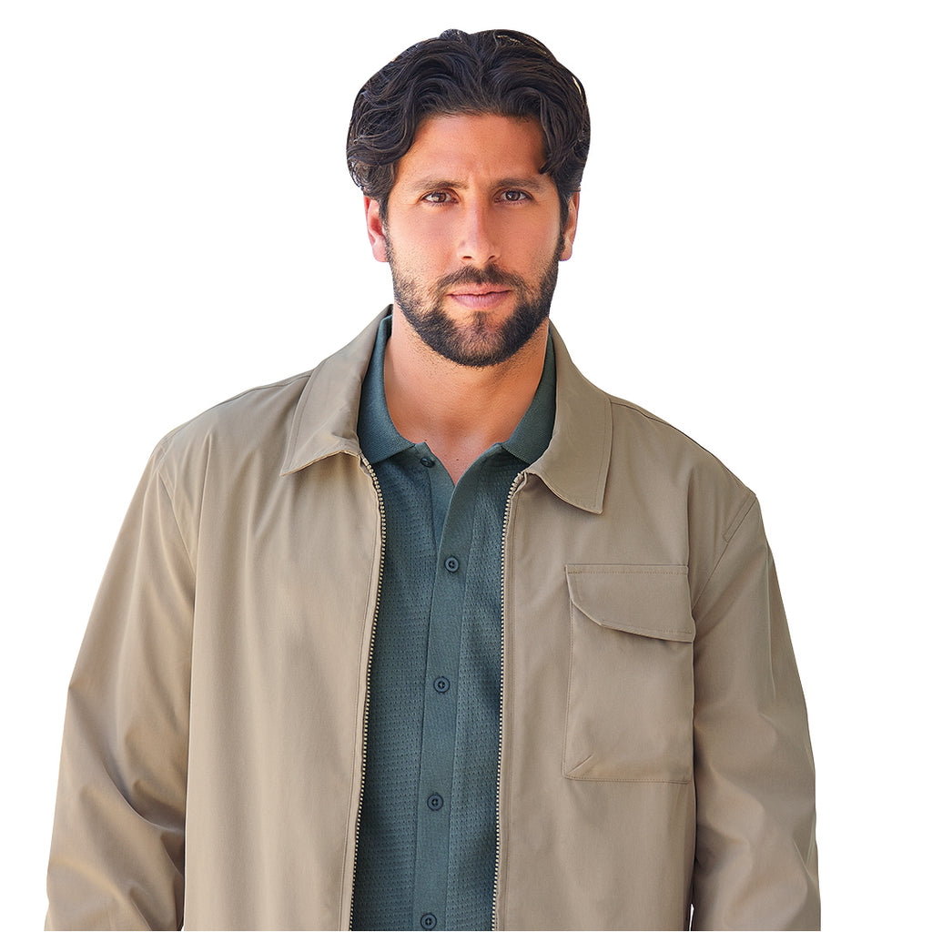 Playera azul polo tipo camisa, con cuello y puños de rib, de manga larga.