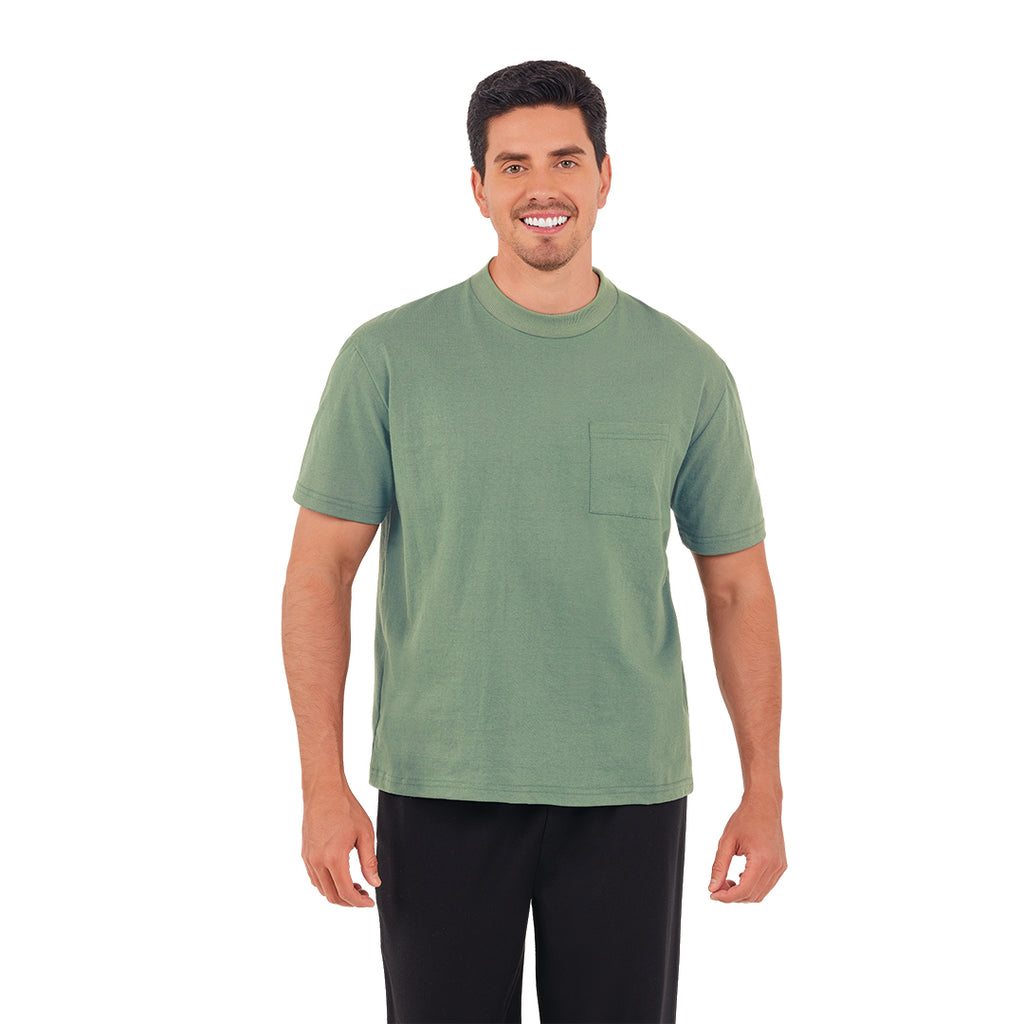 Playera verde de manga corta y cuello redondo, con bolsillo frontal.