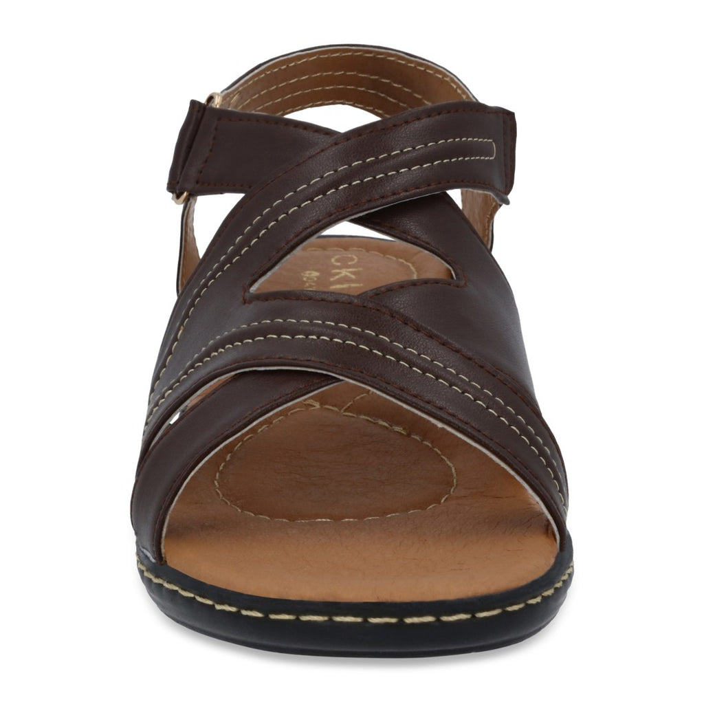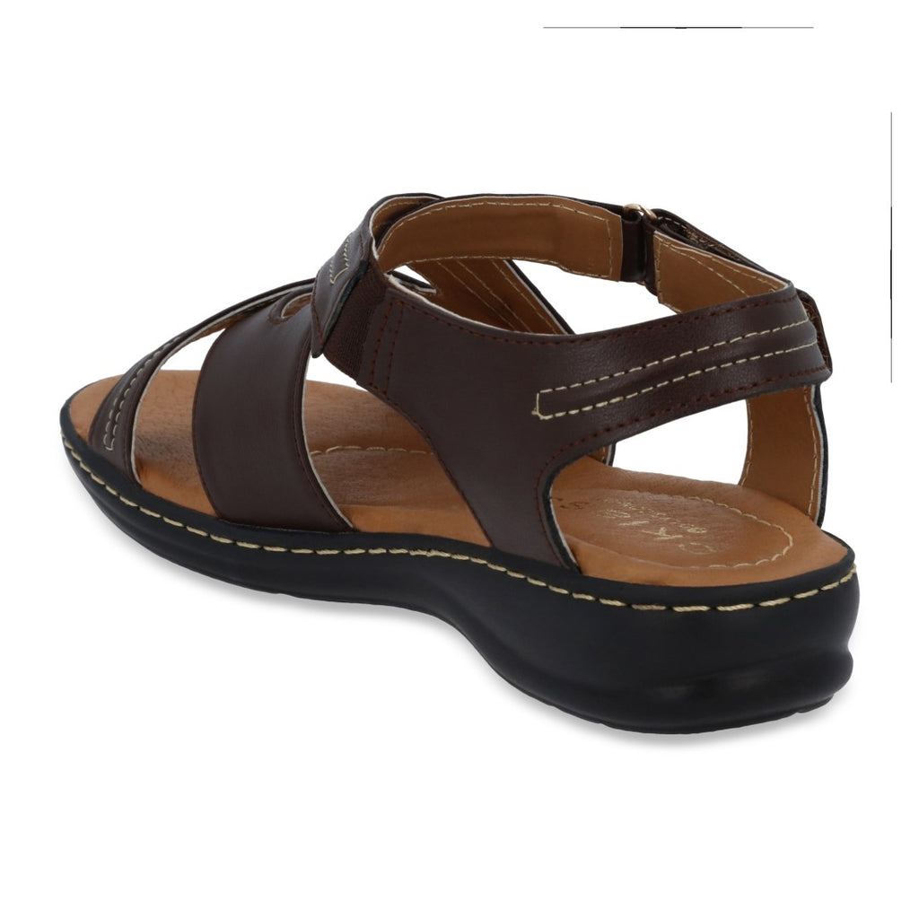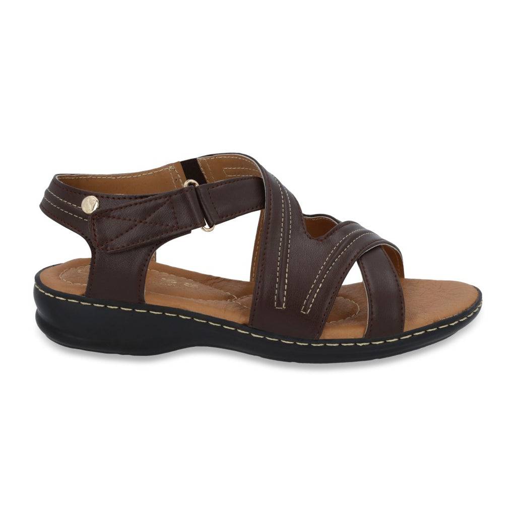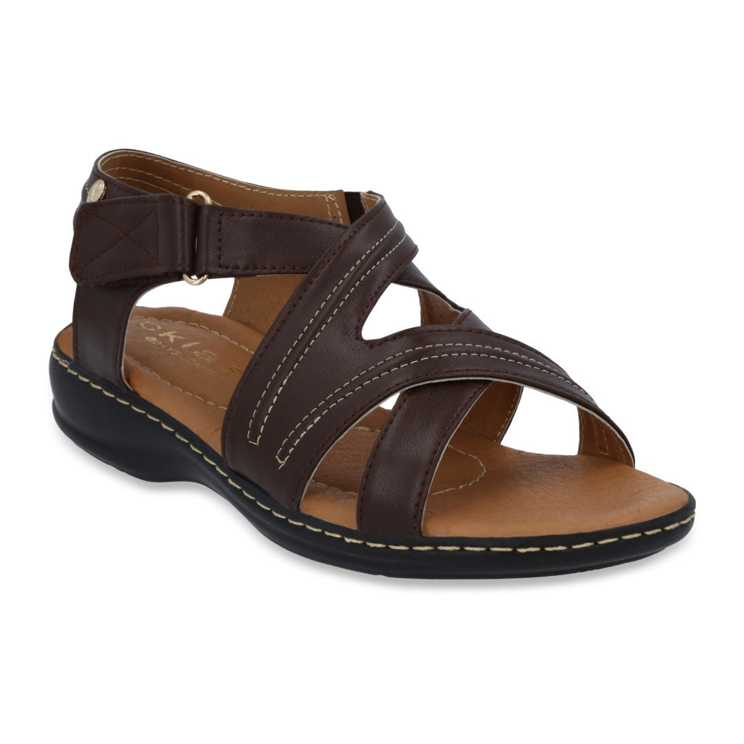 Sandalia de piso color café, con detalle de pespunte ballena, cuenta con argolla y contactel, plantilla de piel. Material: 100% Piel Vacuno.