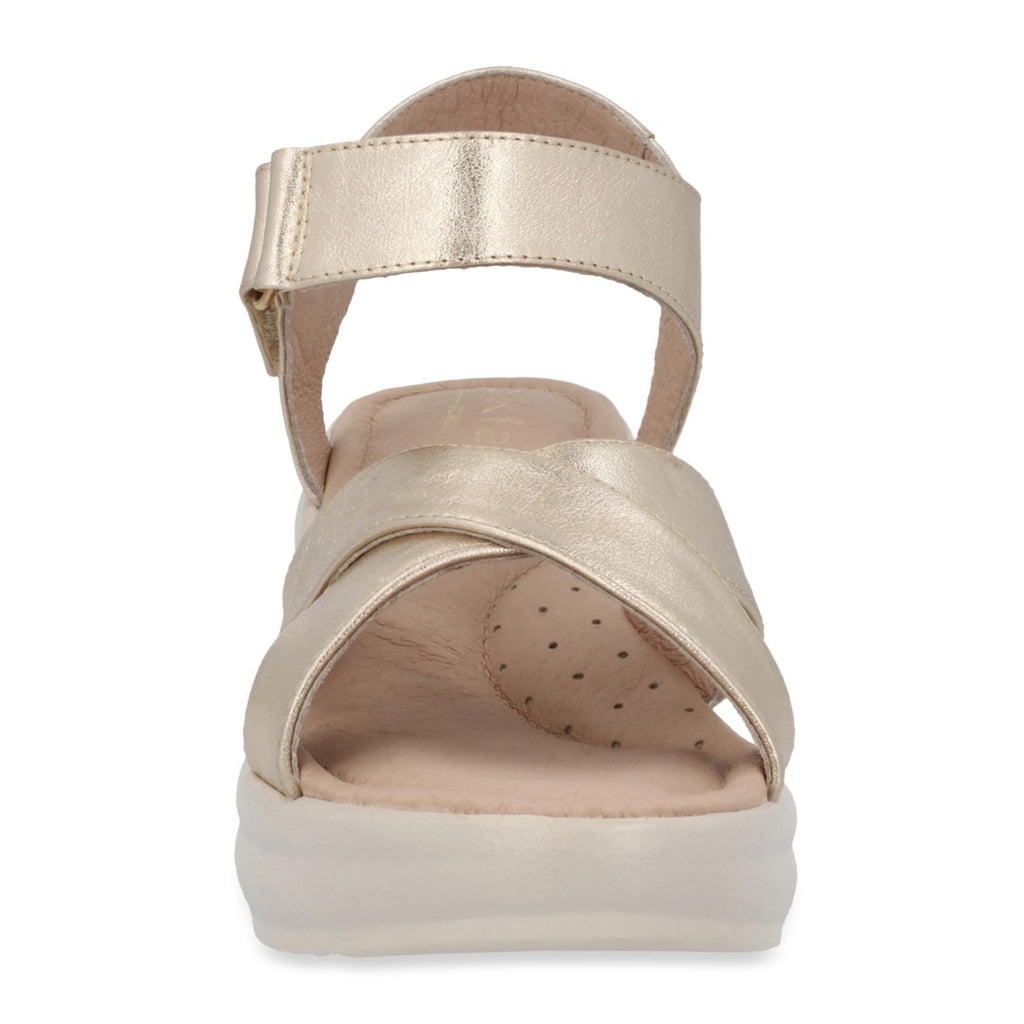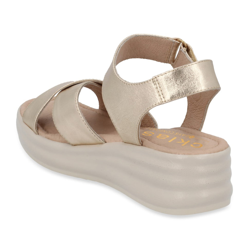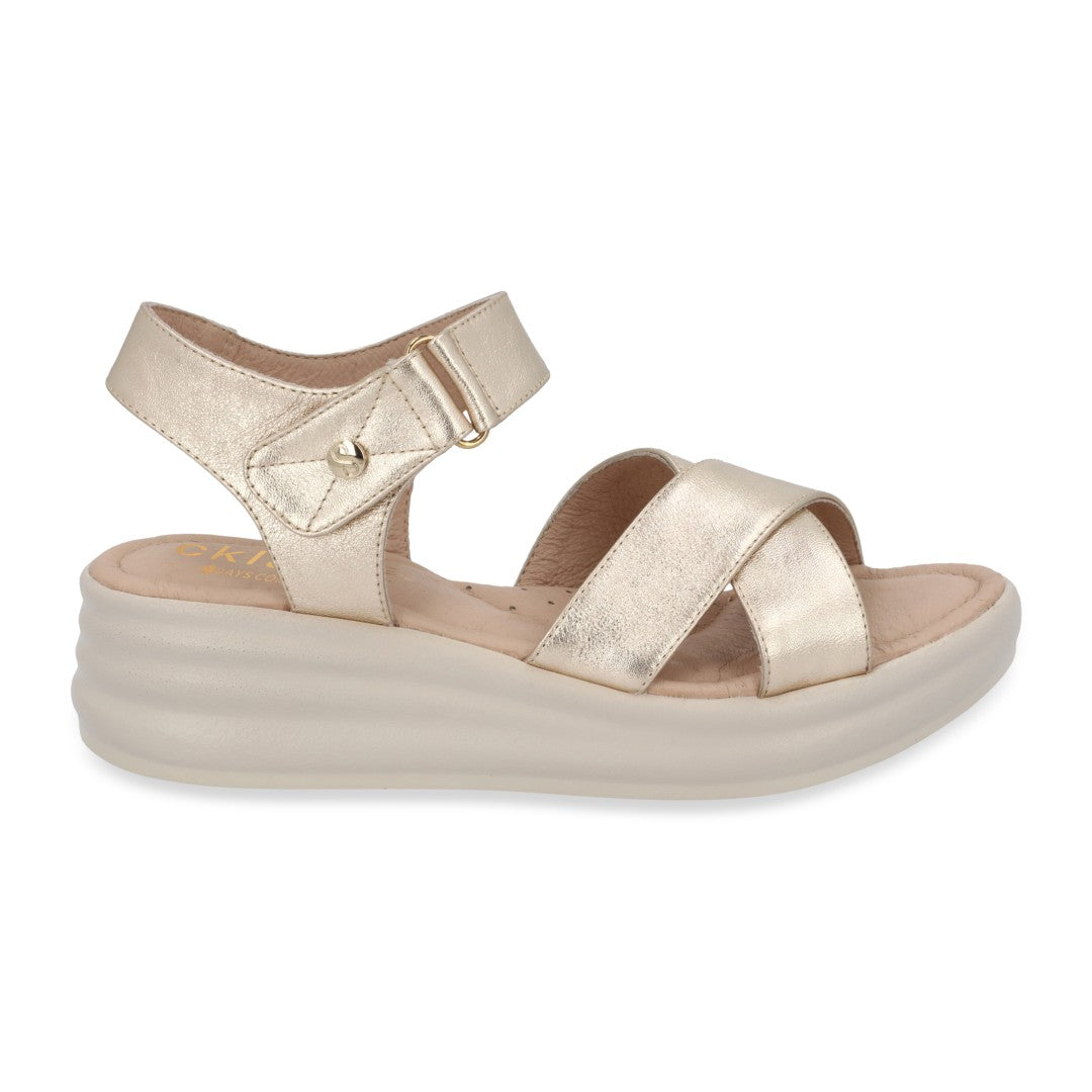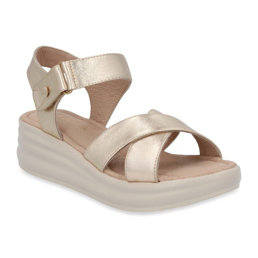 Sandalia de plataforma corrida con altura de 4.5 cm., color oro, con argolla y contactel, plantilla y forro de piel. Material: 100% Piel Vacuno.
