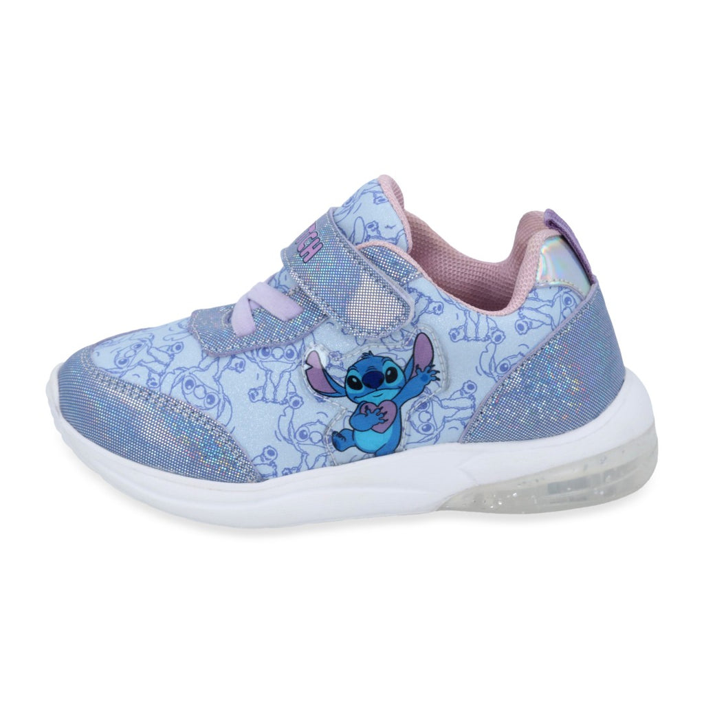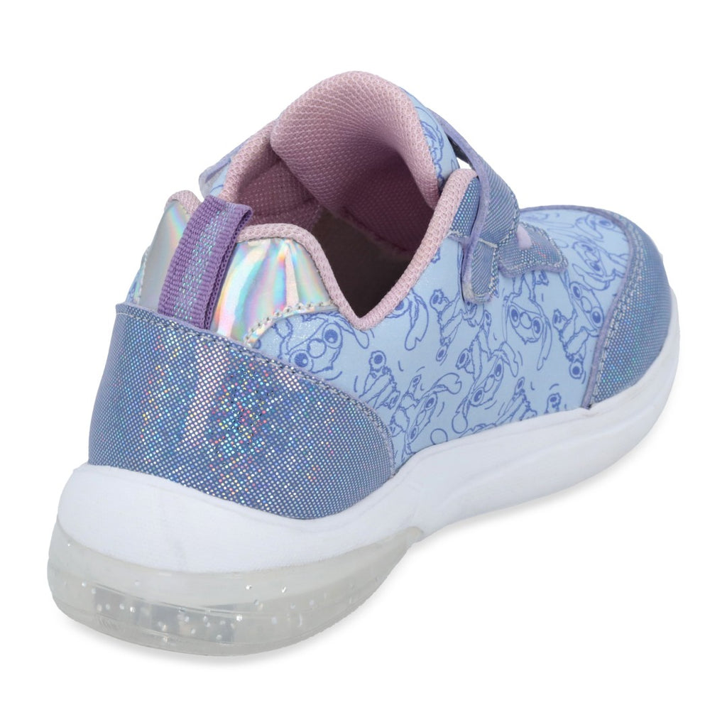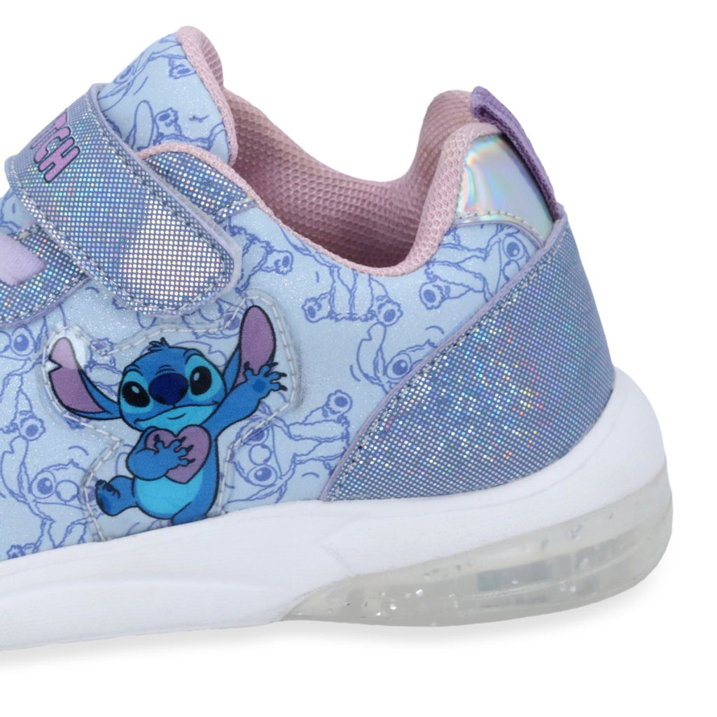 Tenis deportivo color azul, con estampado de STITCH, detalles brillosos, cintas elásticas y contactel, calzado con luces. Plantilla: Textil. Material: Sintético.