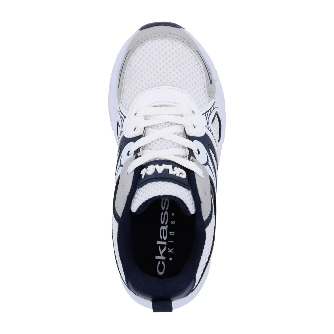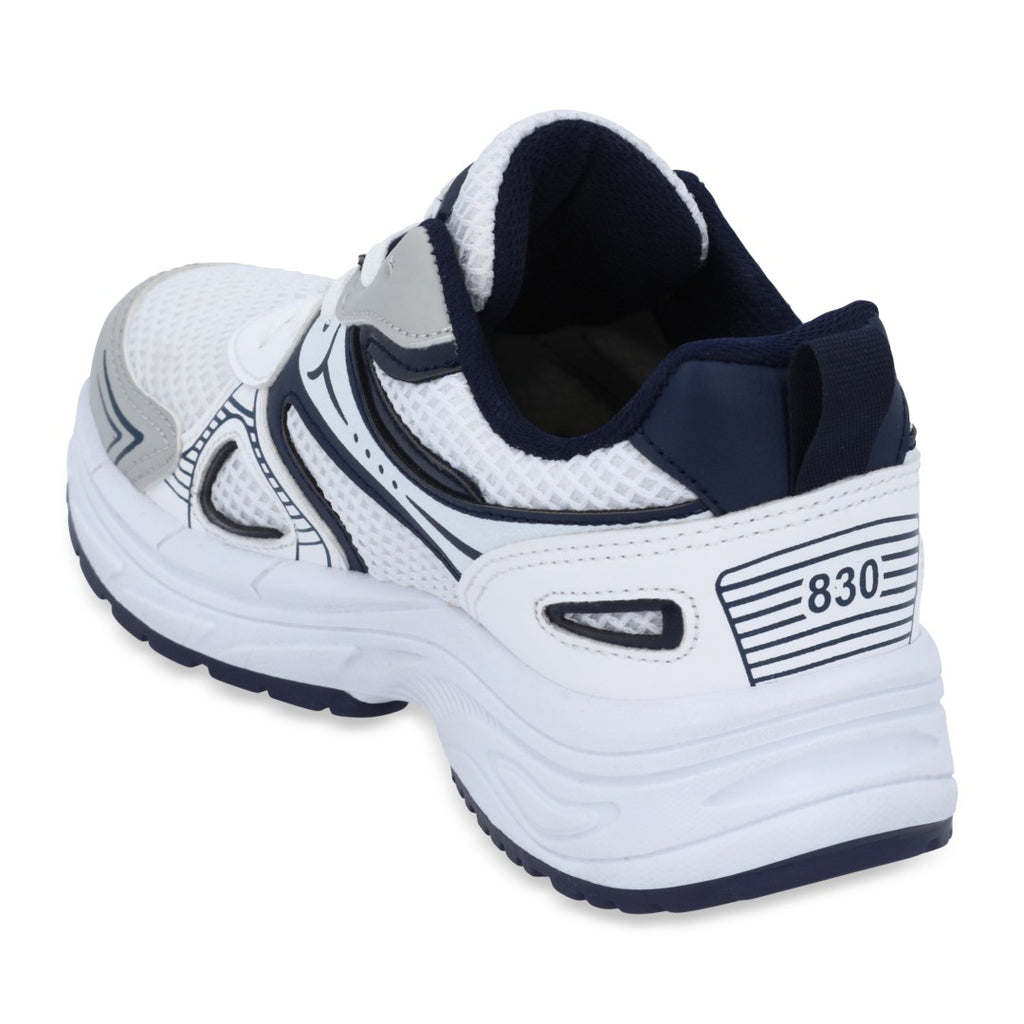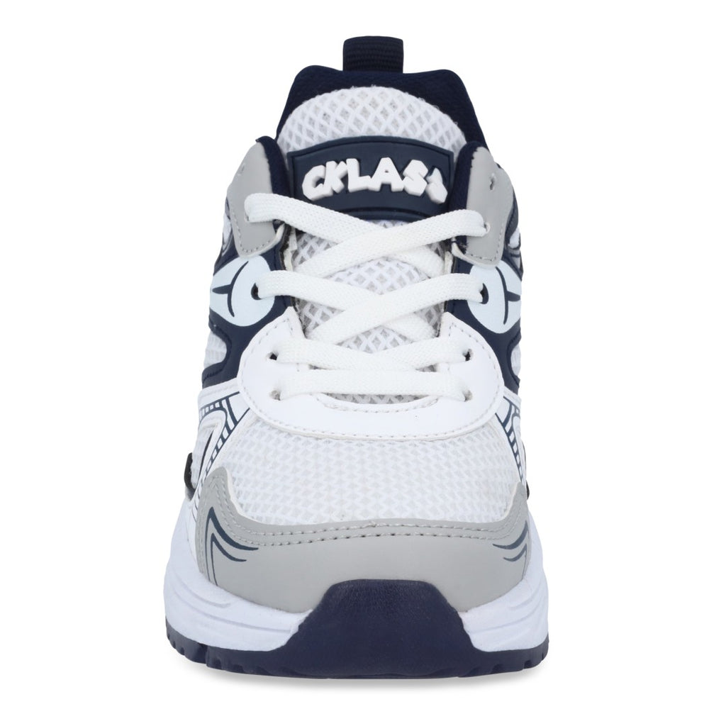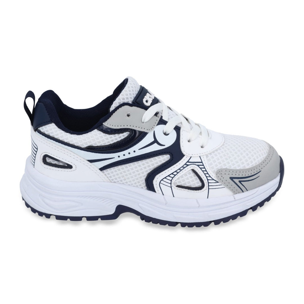 Tenis deportivo color blanco, con detalles en color marino y agujetas. Plantilla: Textil. Material: Sintético/Textil.