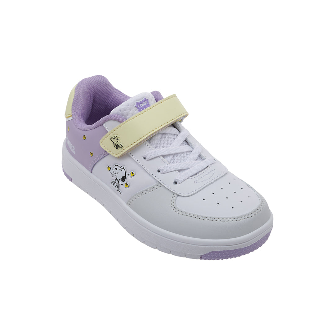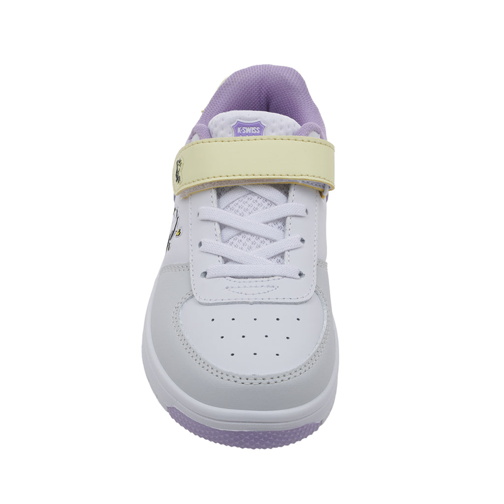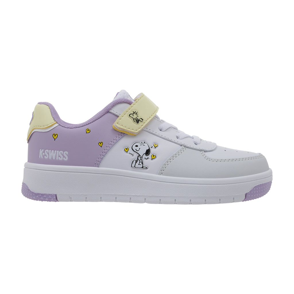 Tenis K-Swiss clásico casual de color blanco licencia Snoopy con contactel y cordones ajustables; detalles de color al contraste. Material: Vacuno.