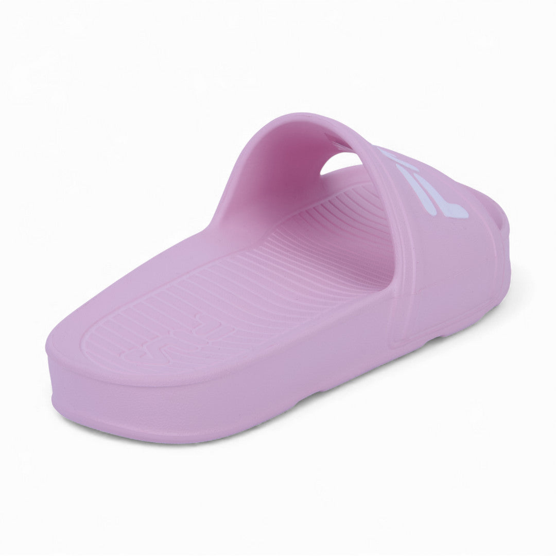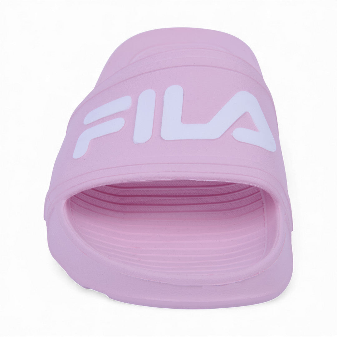 Sandalia Fila rosa estilo slide con banda ancha al frente y logotipo destacado; ligera, cómoda y perfecta para uso diario o descanso. Ideal para clima cálido y outfits casuales relajados.