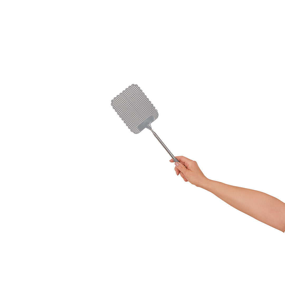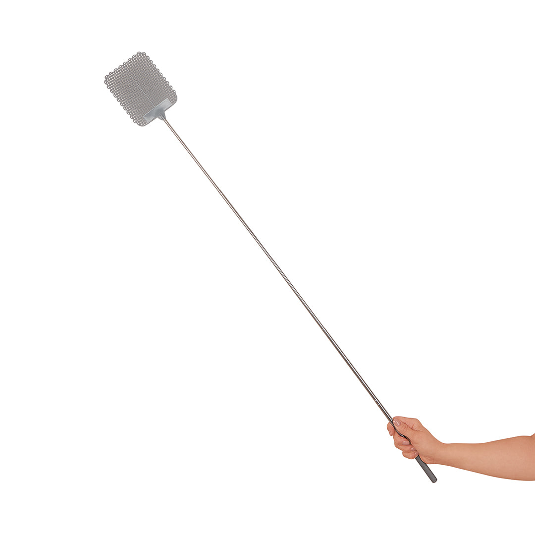 Matamoscas telescópico gris de plástico y acero inoxidable; mango extensible hasta 114 cm, flexible, portátil y resistente.