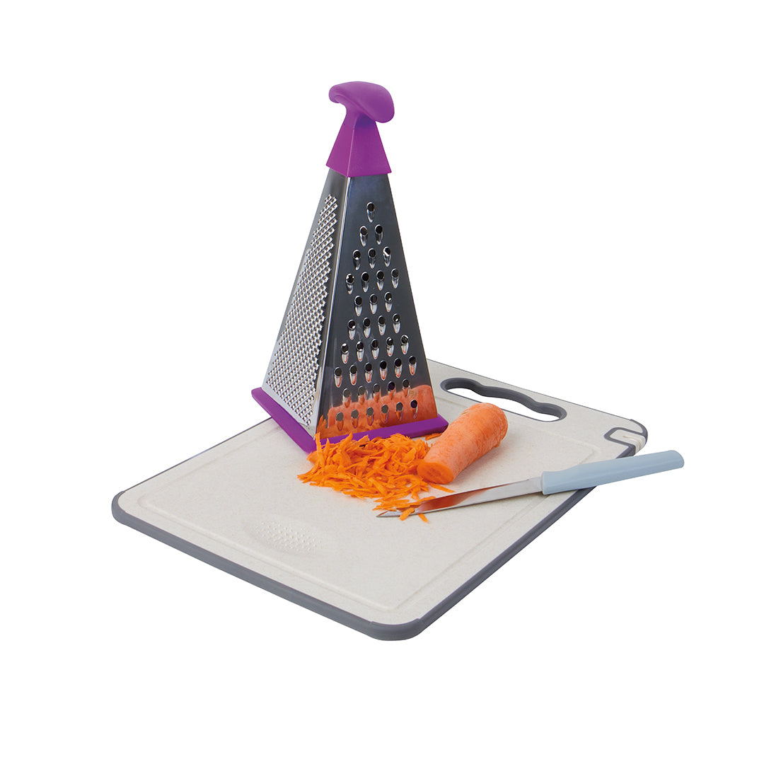 Rallador triangular morado de acero inoxidable con mango ergonómico; práctico, resistente y funcional para distintos tipos de rallado.