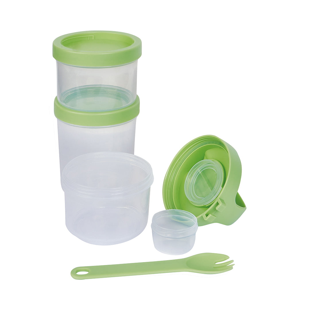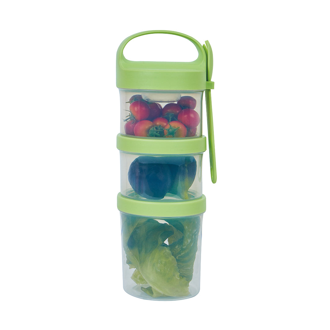 Recipientes verdes portátiles apilables para transportar leche en polvo, snacks y vitaminas; incluyen cubierto y mini recipiente extra. Diseño práctico, seguro y fácil de llevar.
