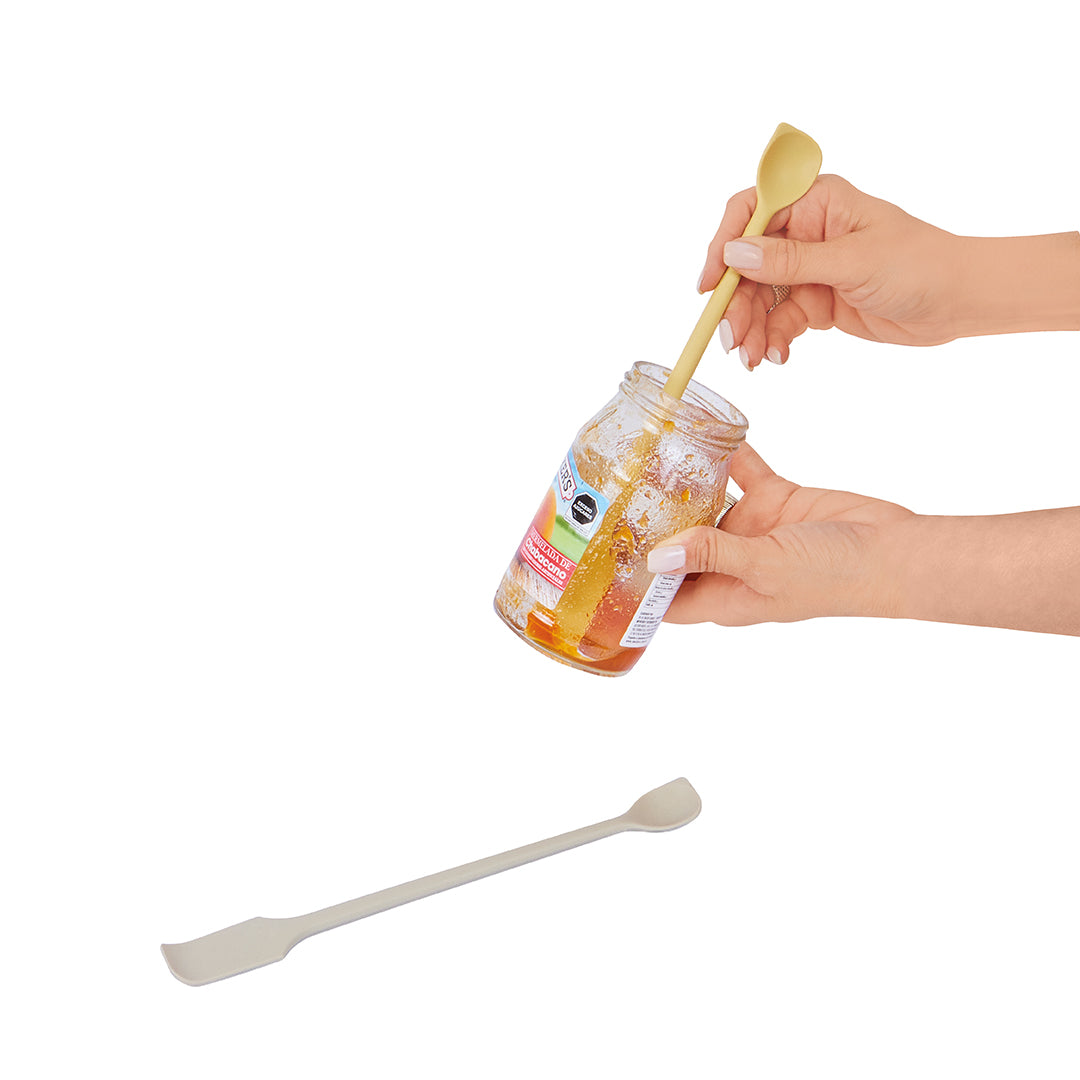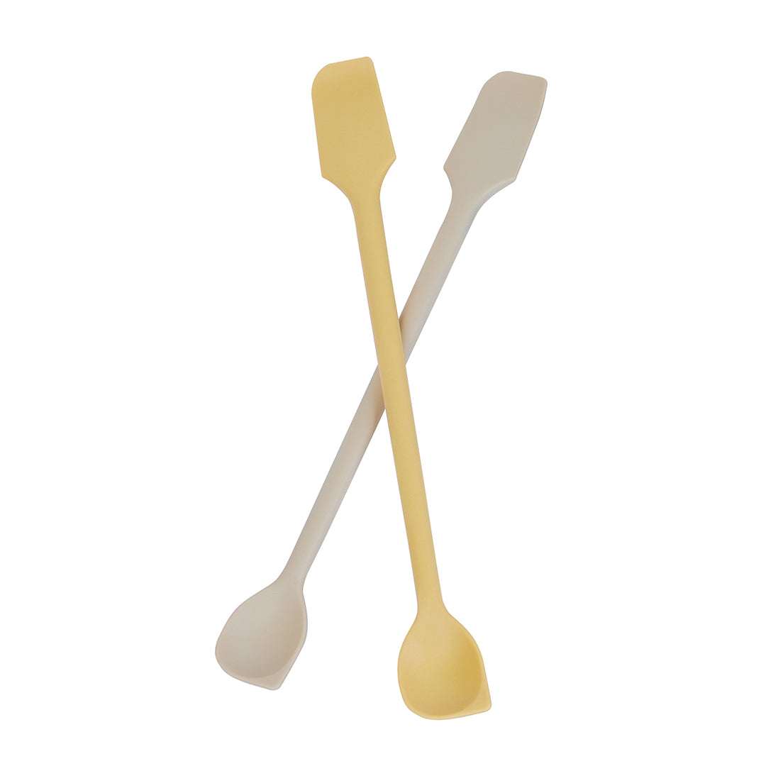 Set de 2 espátulas multicolor 2 en 1 que funcionan como cuchara y espátula; diseño práctico, flexible y fácil de lavar para cocina.
