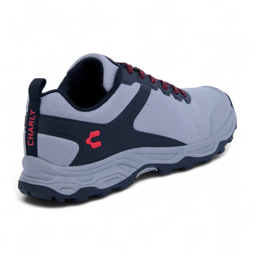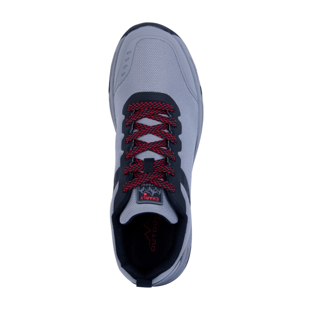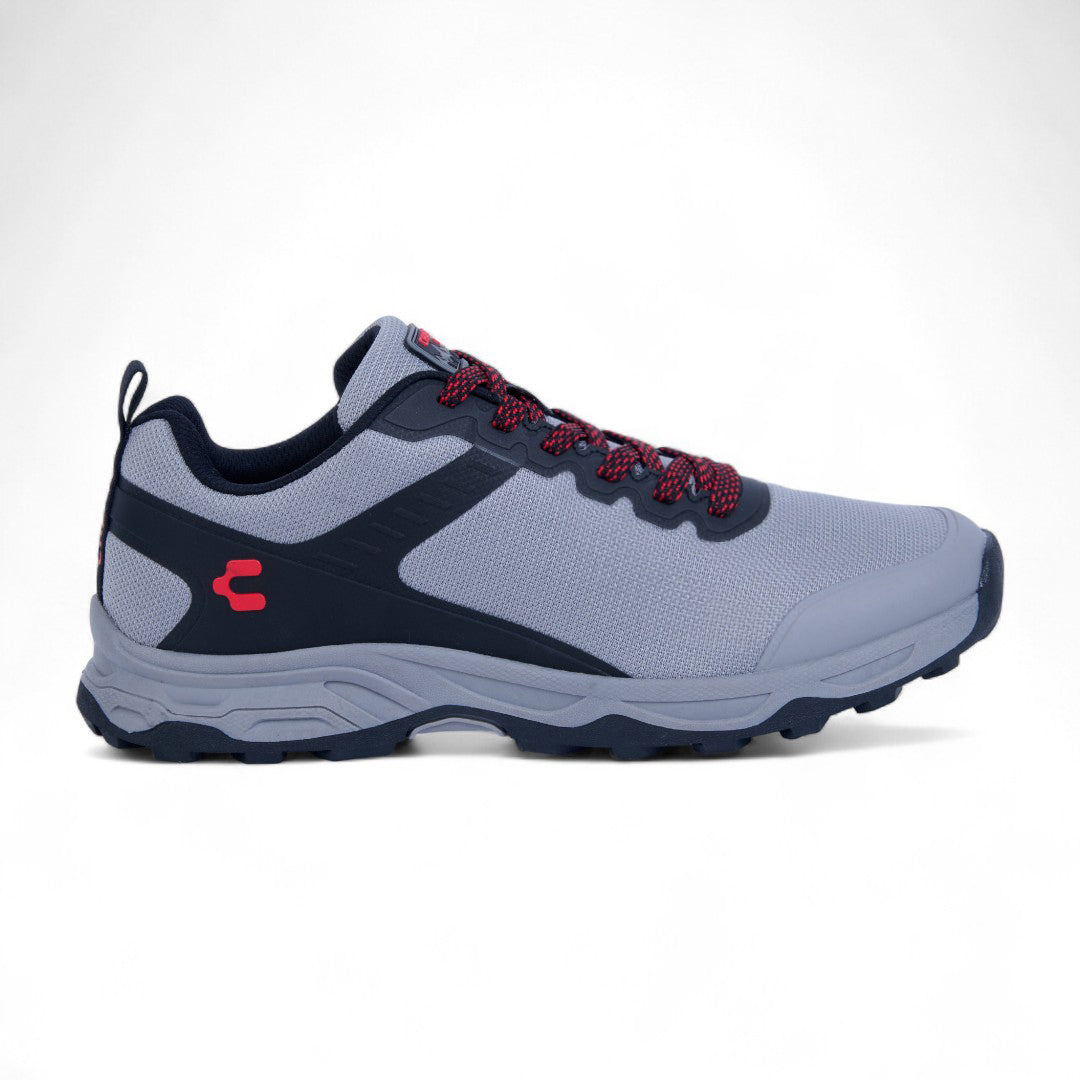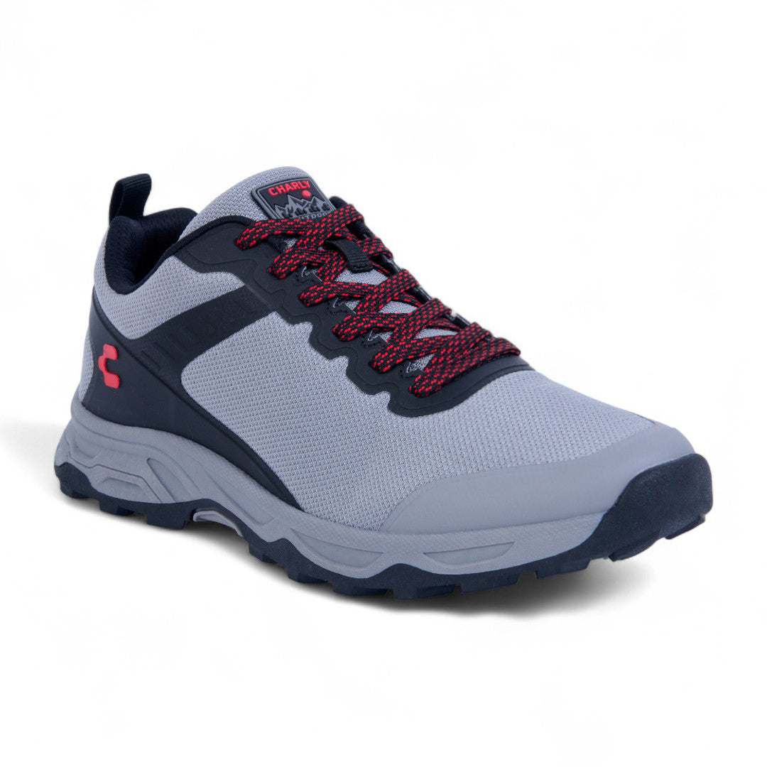 Tenis Charly gris estilo outdoor con cinta ajustable y detalles al contraste; suela antiderrapante y diseño resistente ideal para actividades urbanas.