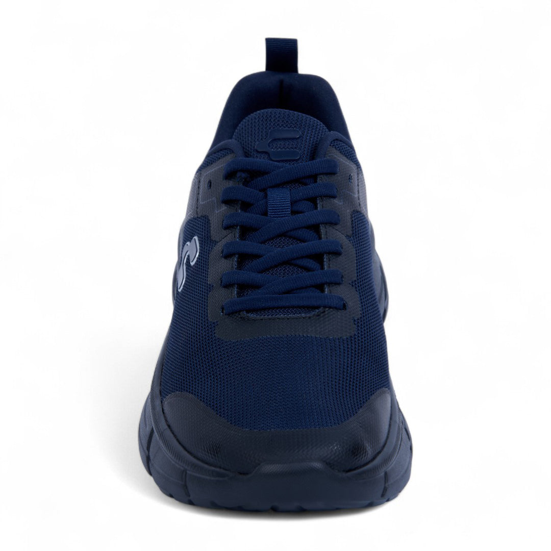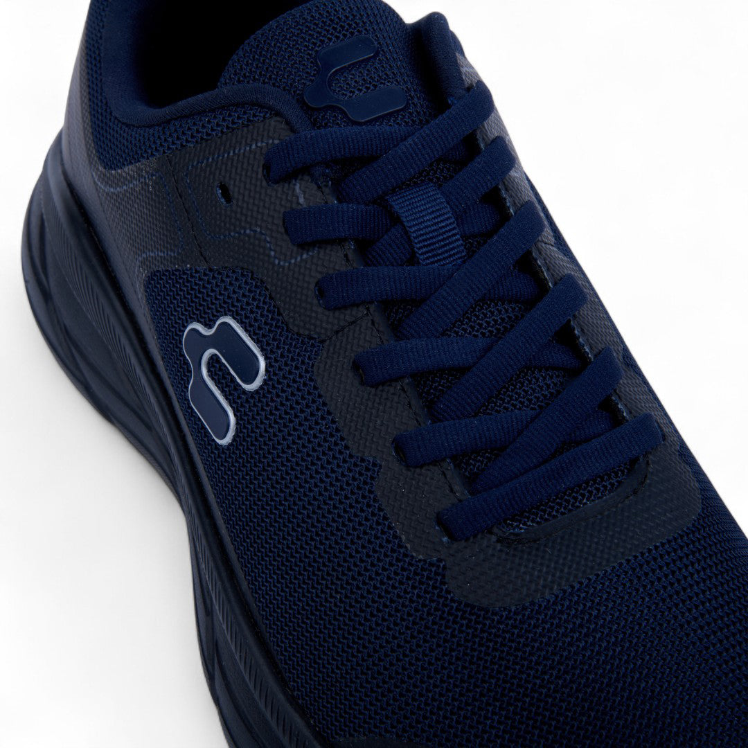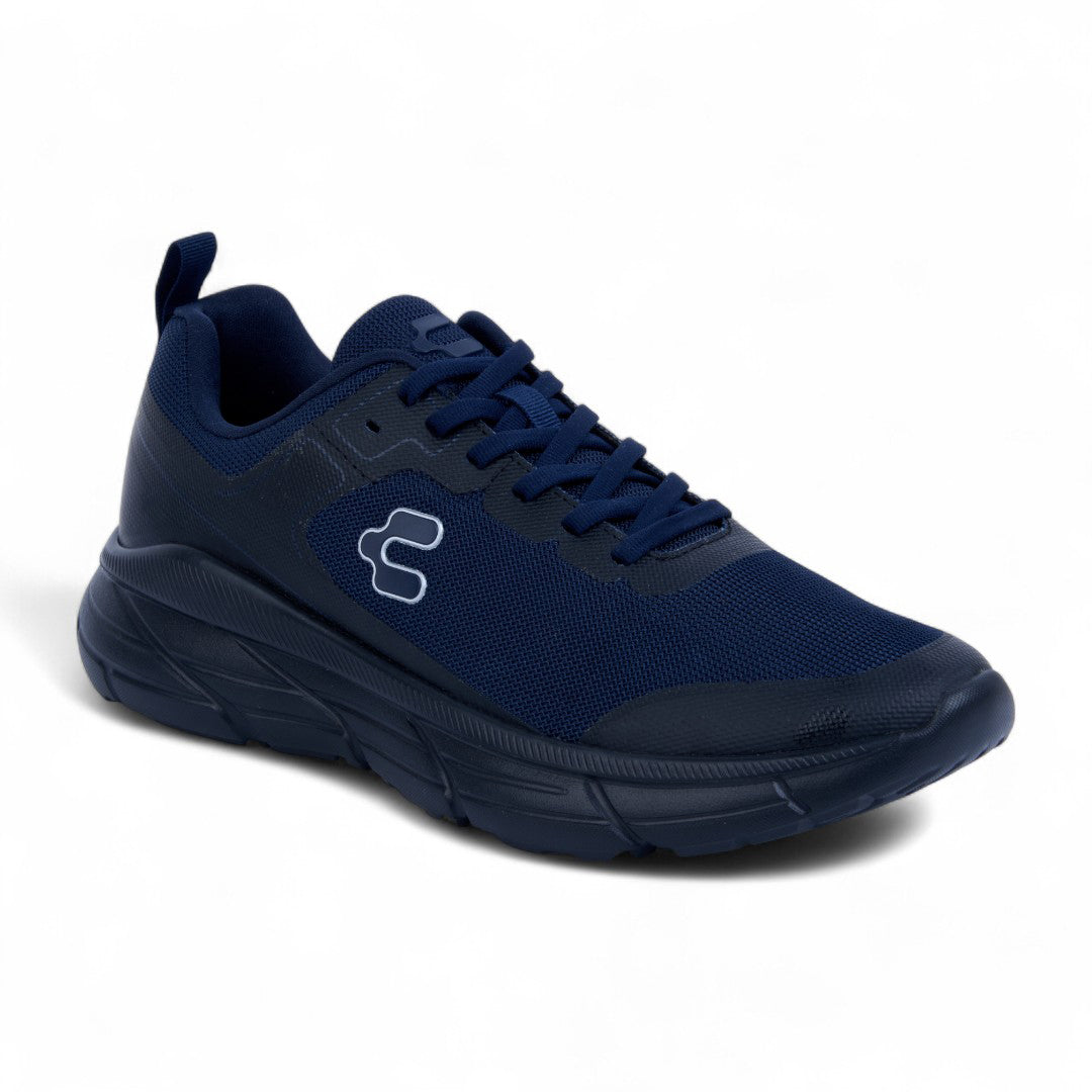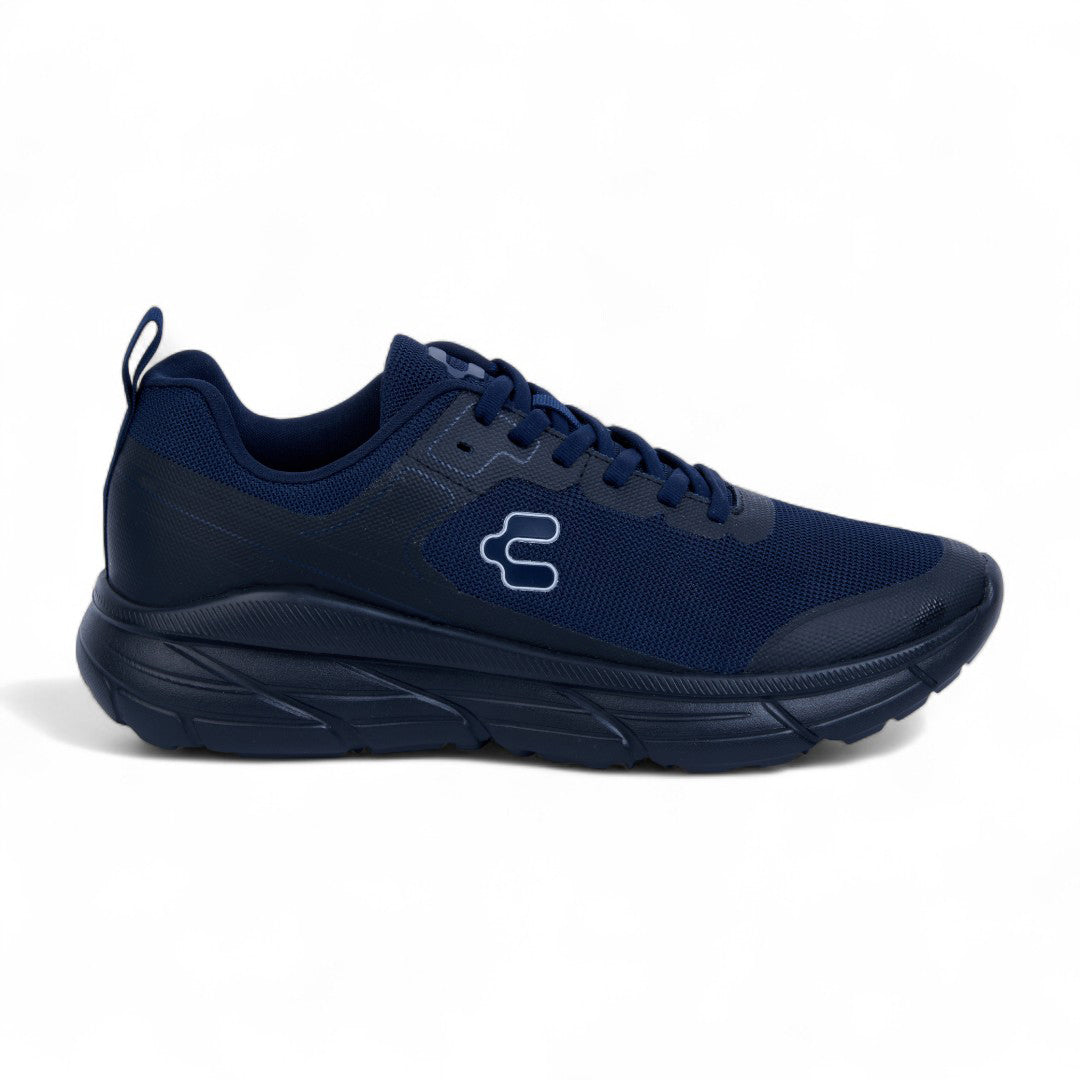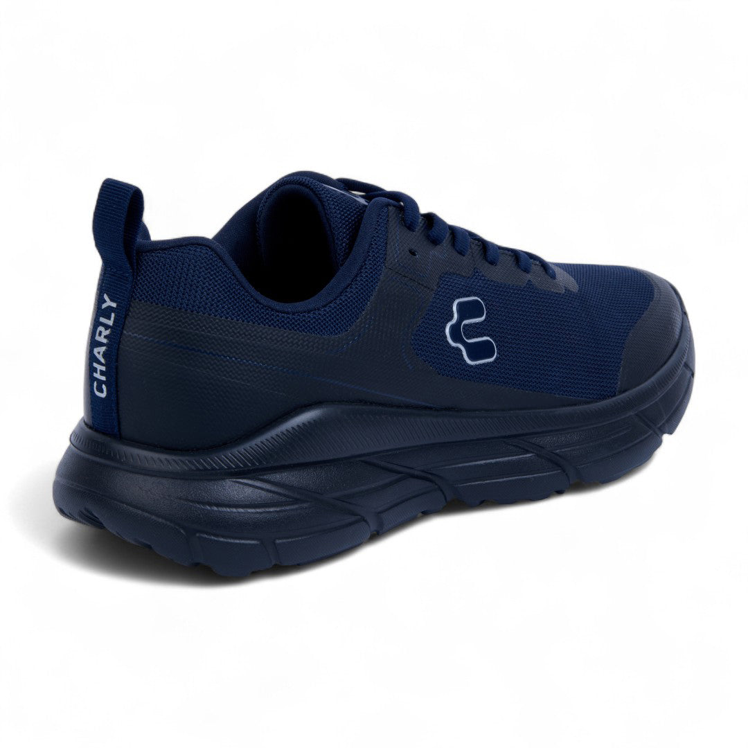 Tenis Charly marino con malla transpirable, cinta ajustable, jalador posterior y aplicaciones al contraste; diseño dinámico con suela ligera antiderrapante ideal para uso urbano diario.