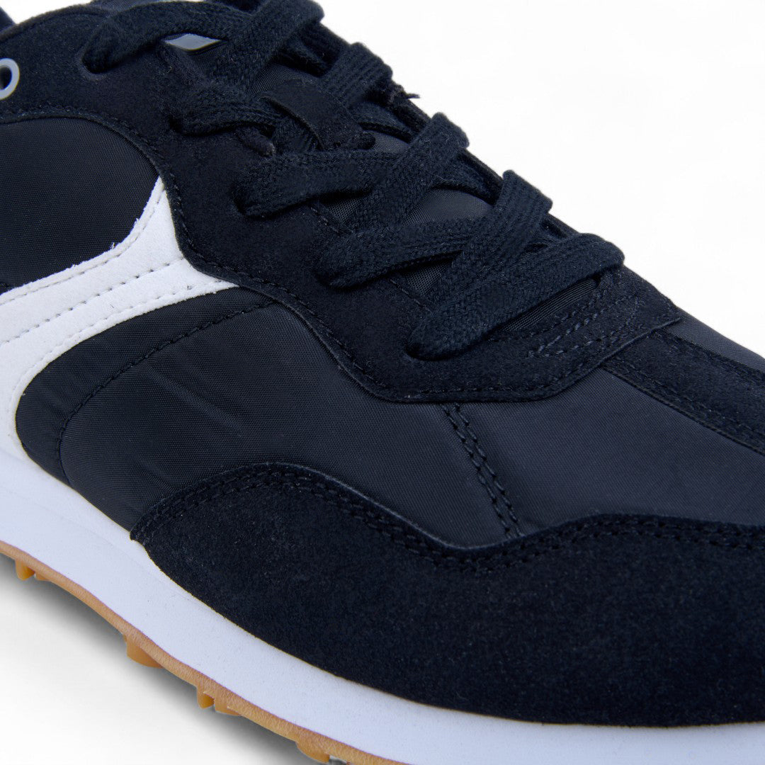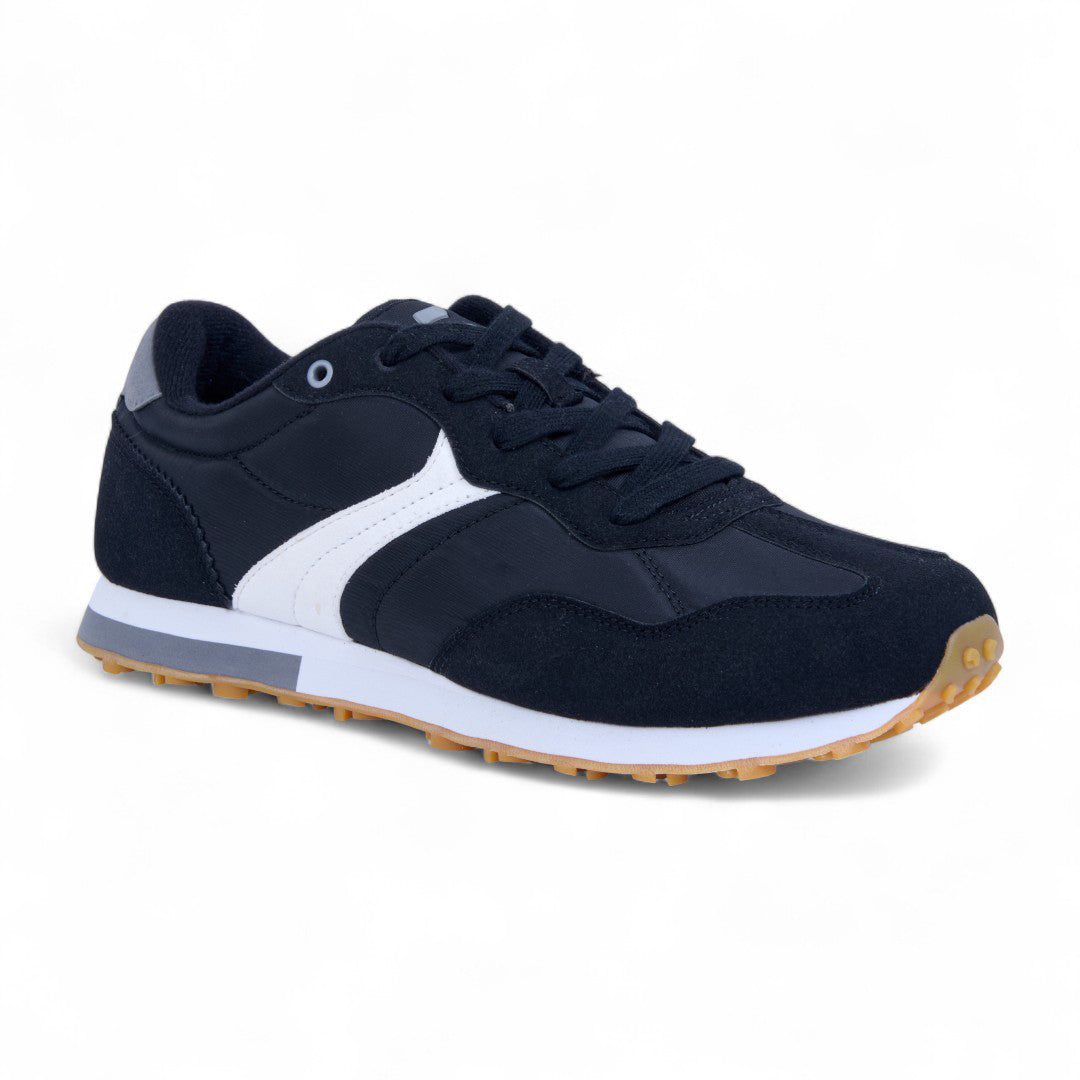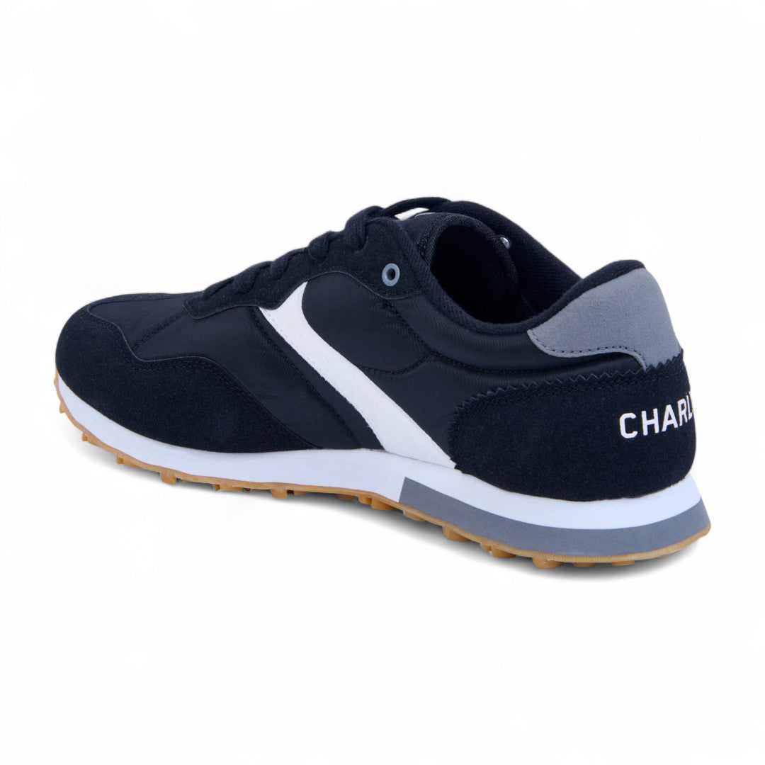 Tenis Charly negro con textil transpirable, cinta ajustable y jalador posterior; suela ligera antiderrapante con detalles en contraste que aportan estilo urbano, comodidad diaria y soporte estable.