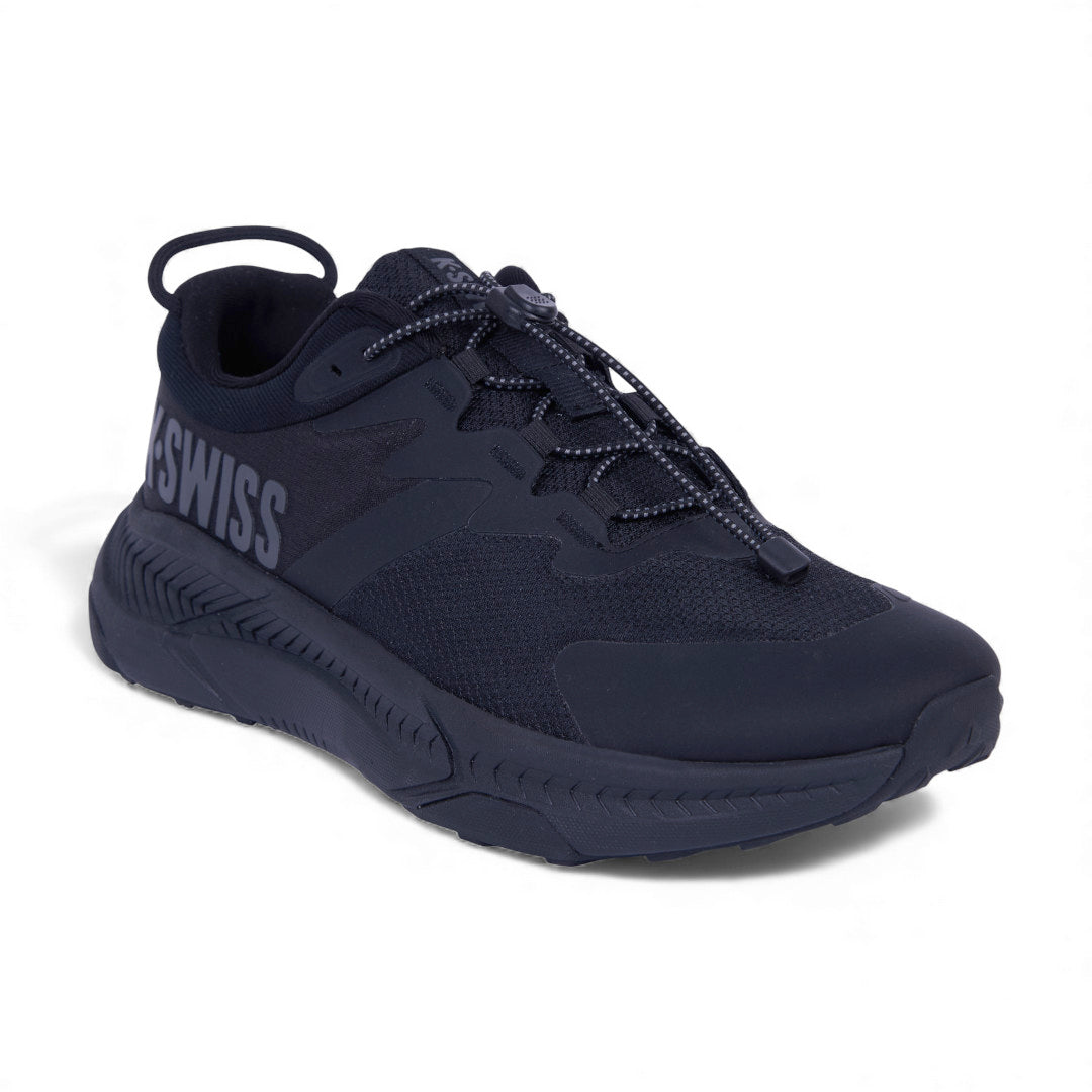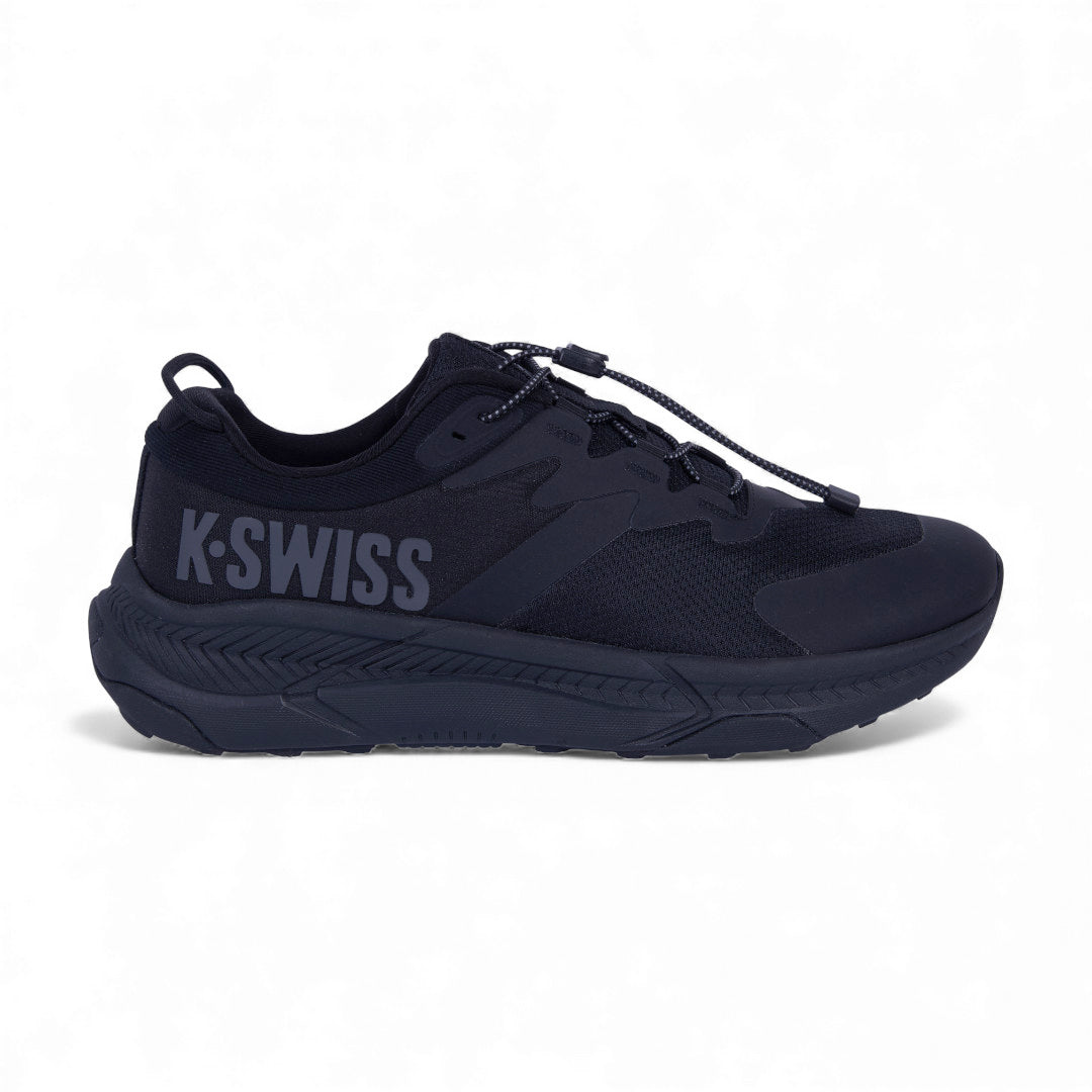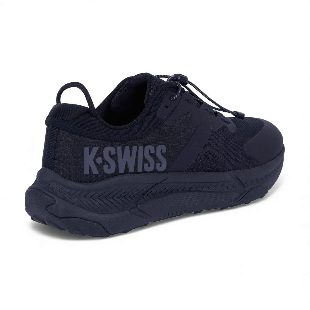 Tenis K-Swiss negros con malla transpirable, cinta ajustable y suela antiderrapante ligera; cómodos, deportivos y versátiles para uso diario.