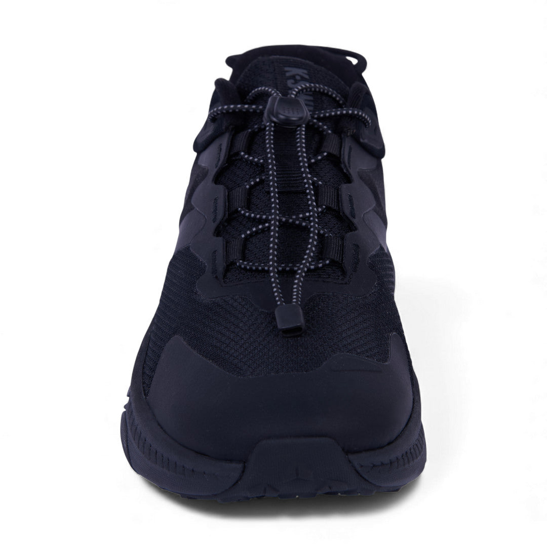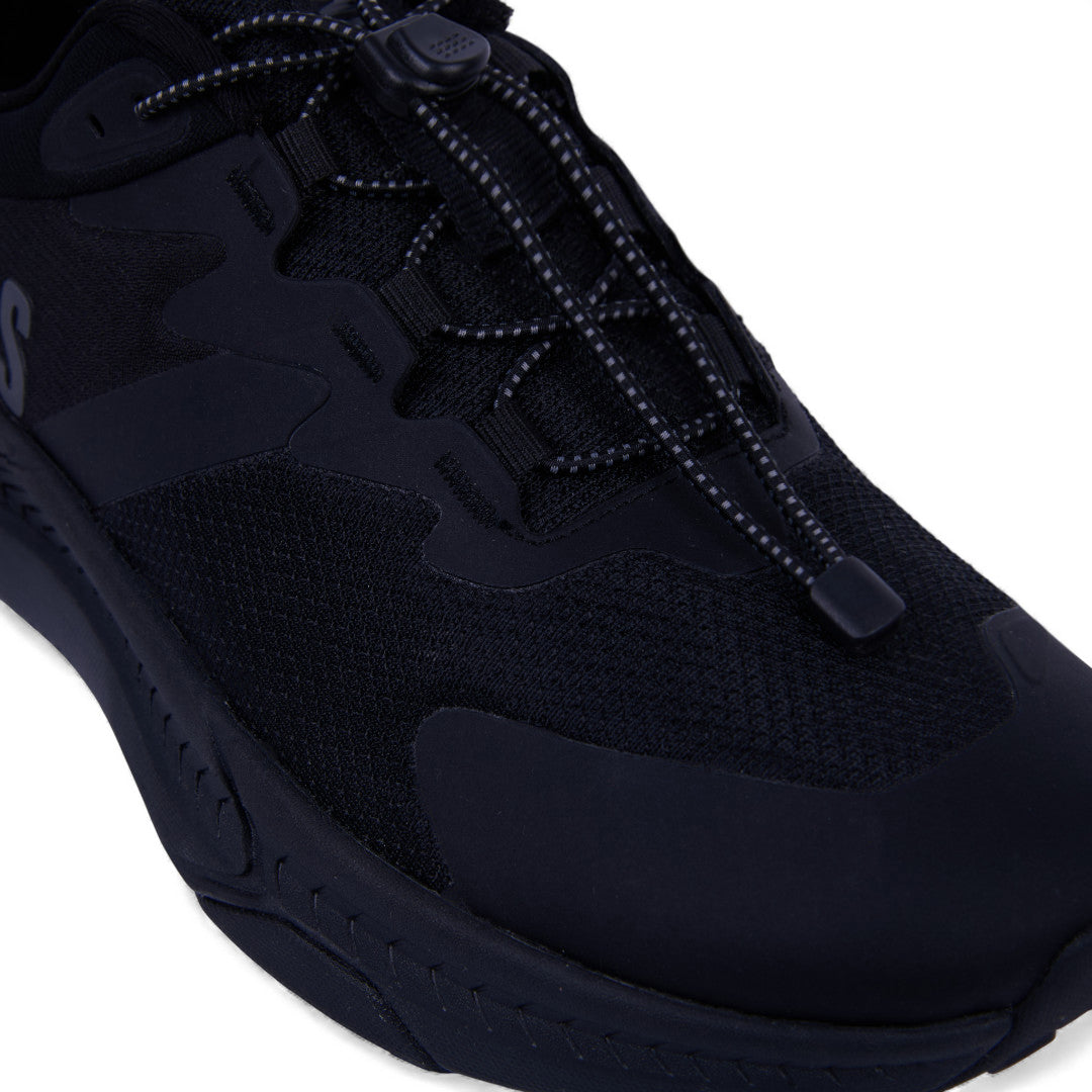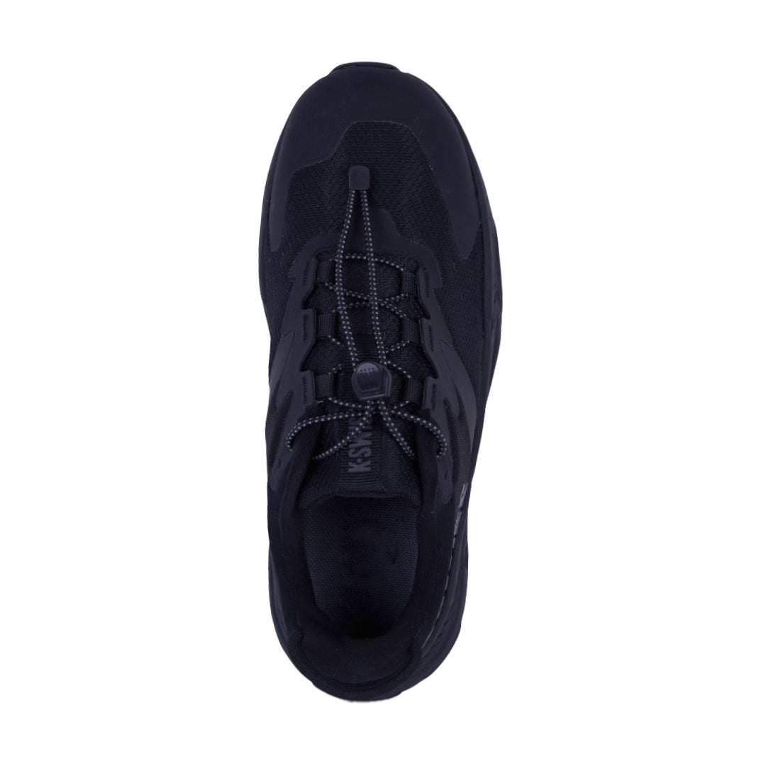Tenis K-Swiss negros con malla transpirable, cinta ajustable y suela antiderrapante ligera; cómodos, deportivos y versátiles para uso diario.