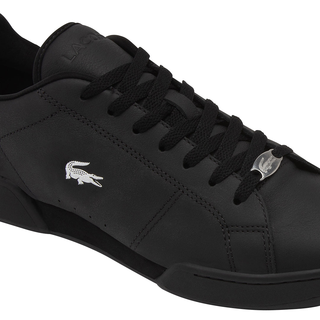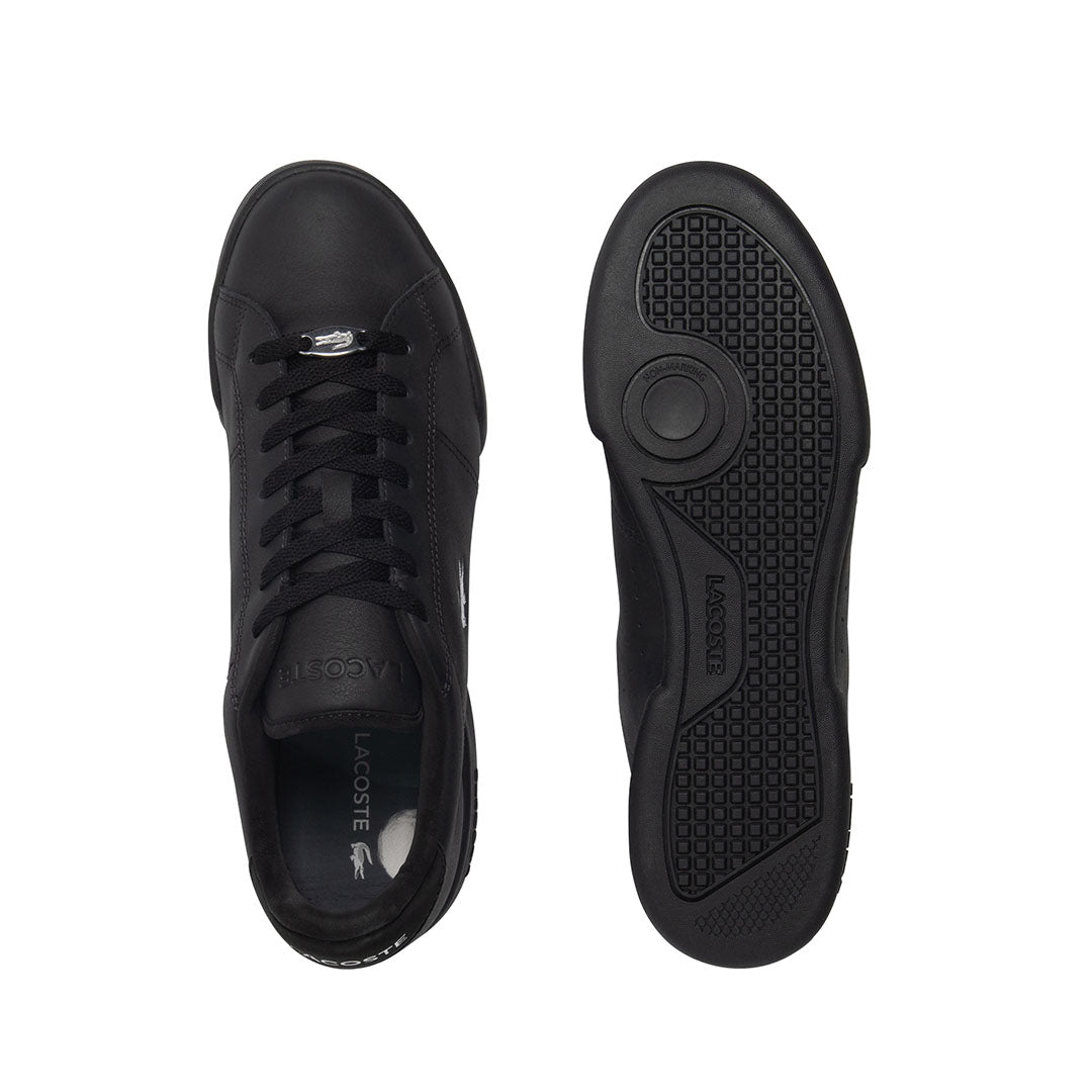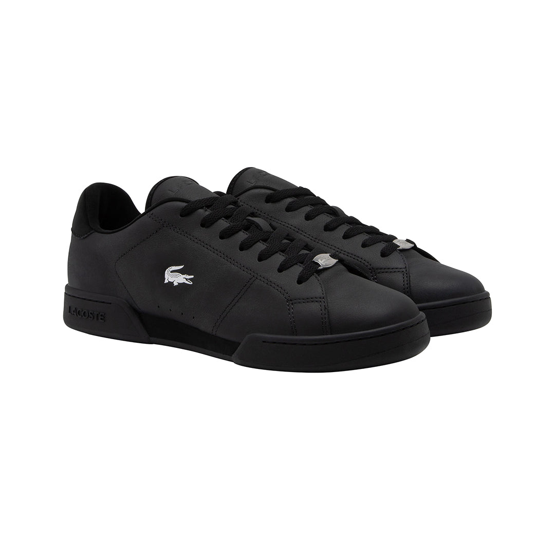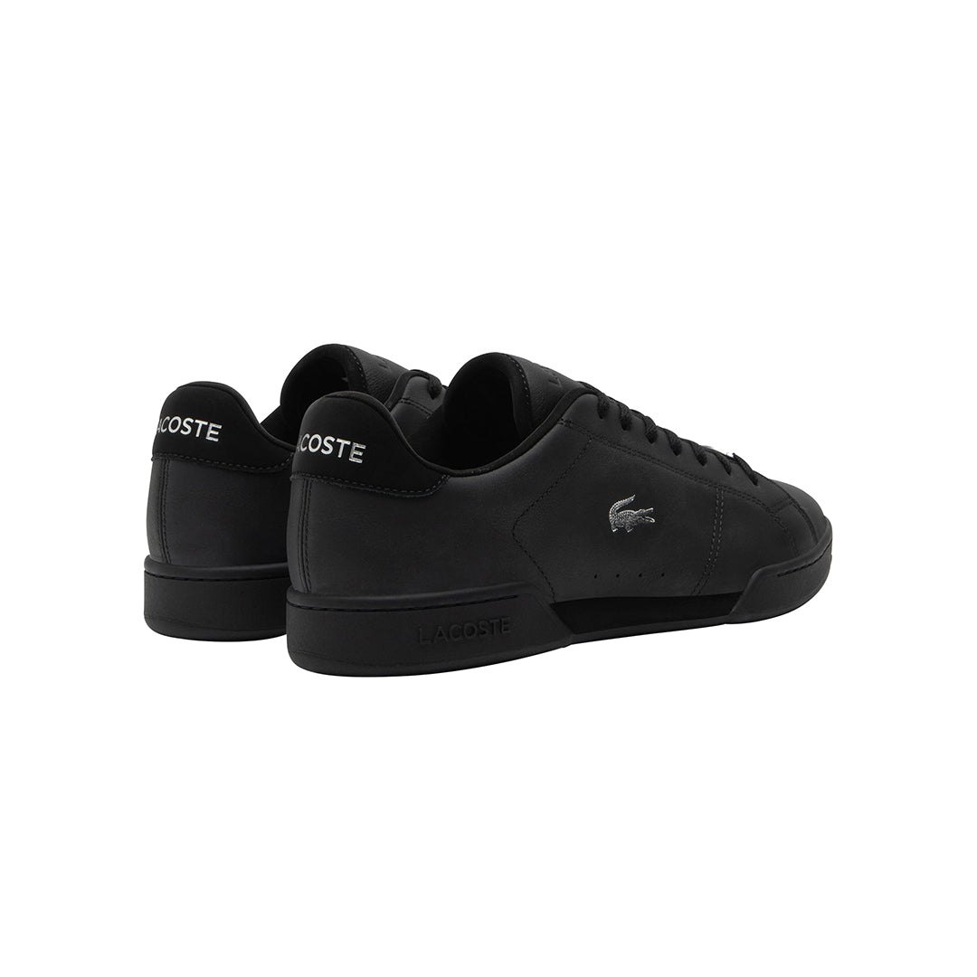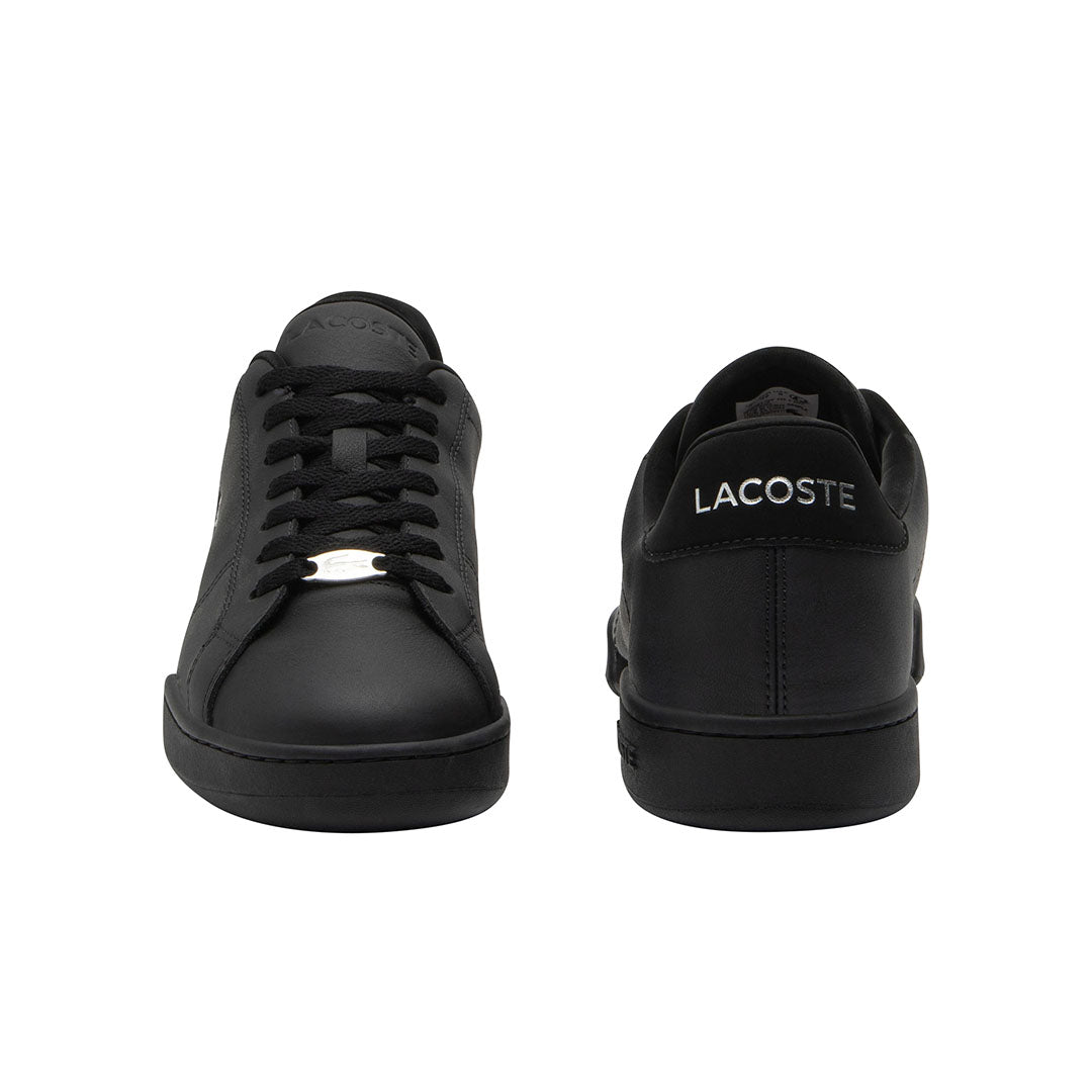 Tenis Lacoste para caballero en color negro, con acabado tipo piel de textura lisa y material sintético resistente. Cuenta con agujeta ajustable en el empeine y suela antiderrapante que brinda seguridad al caminar. Diseño casual, elegante y versátil ideal para looks urbanos, de oficina o uso diario.