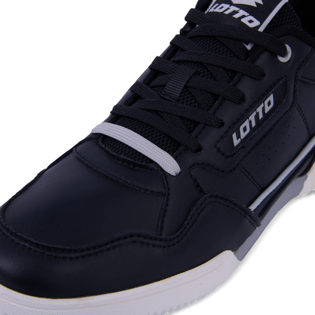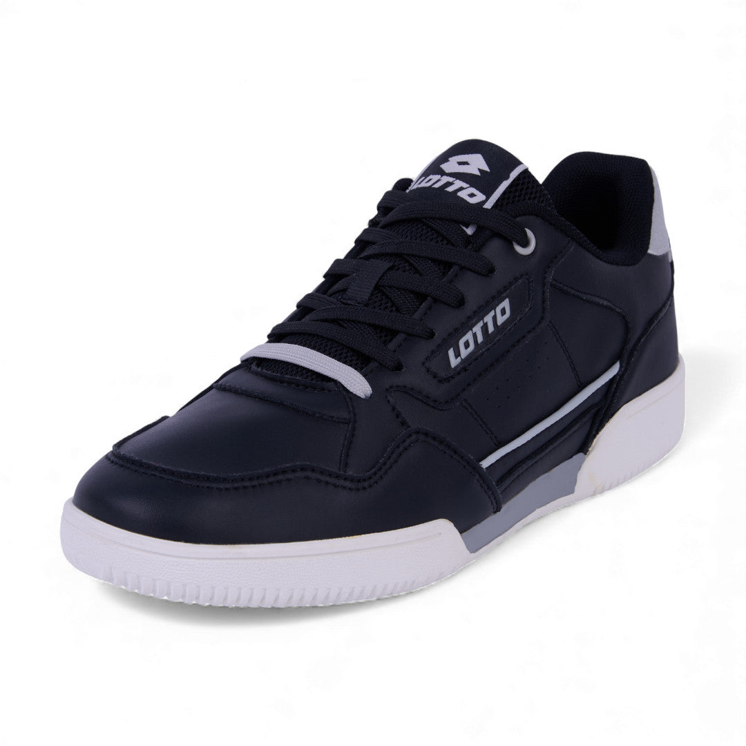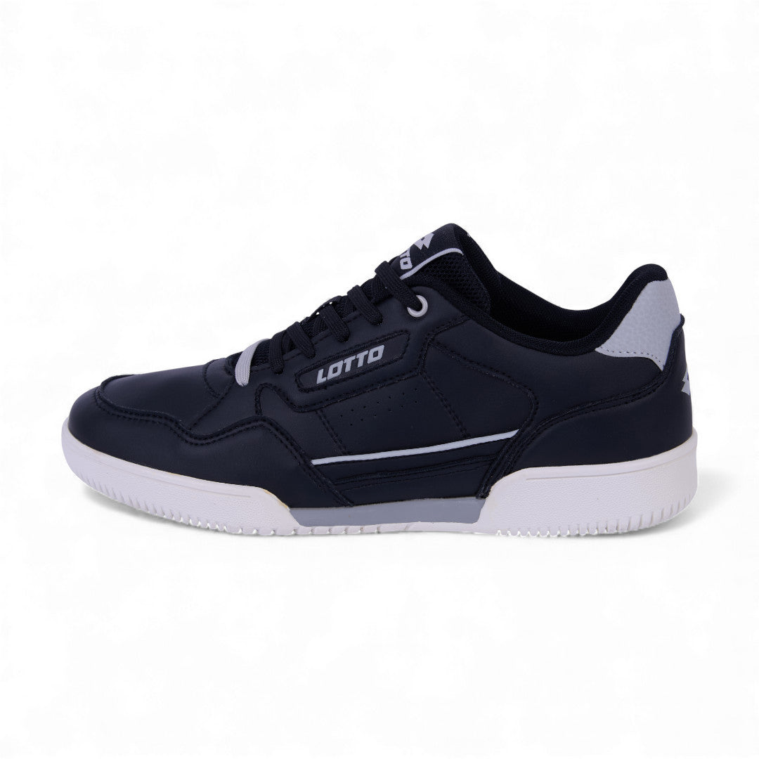 Tenis Lotto negros con cinta ajustable, jalador posterior y suela antiderrapante bicolor; modernos, cómodos y perfectos para uso diario.