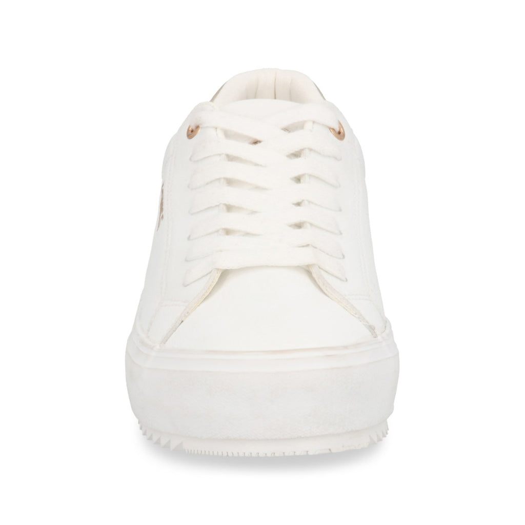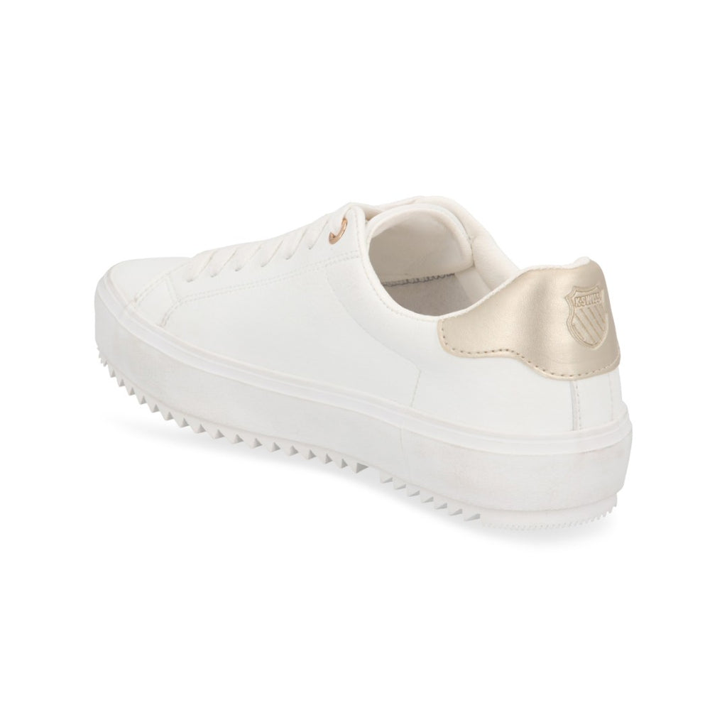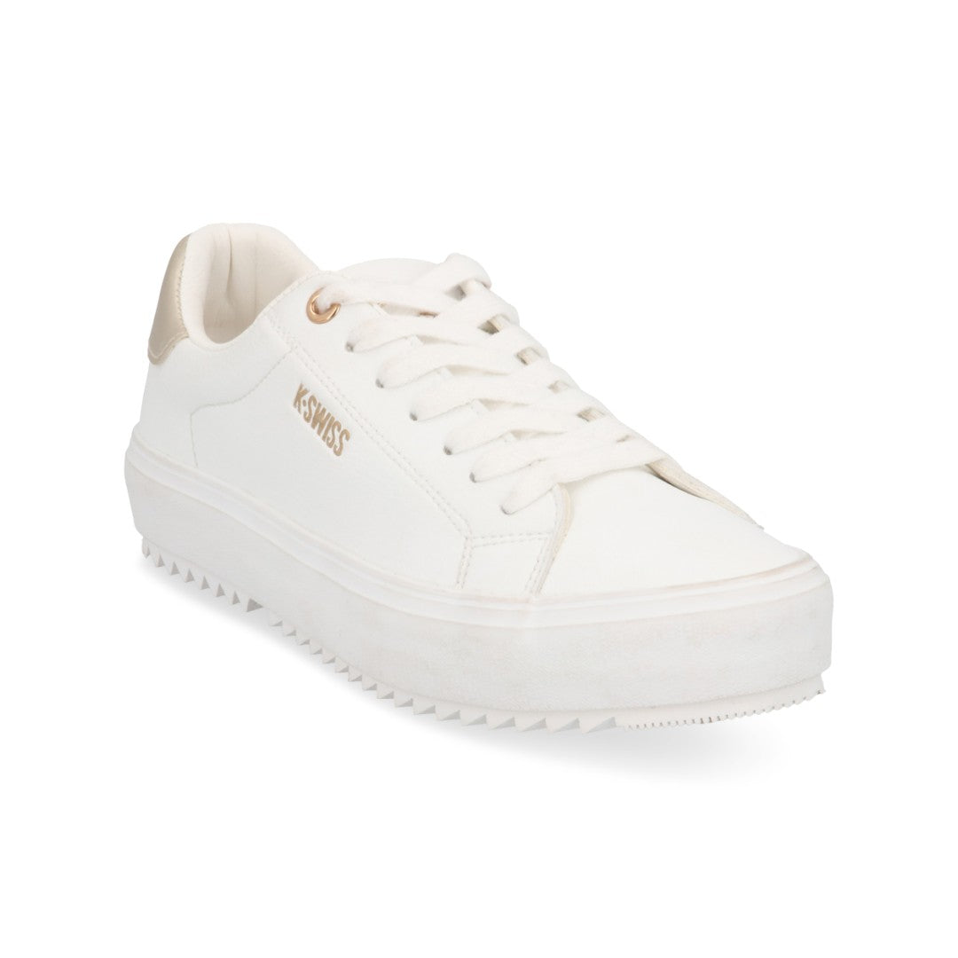 Tenis K-Swiss clásico de color blanco con logo en lateral y cordones ajustables; detalle en talón de color oro. Material: Sintético.