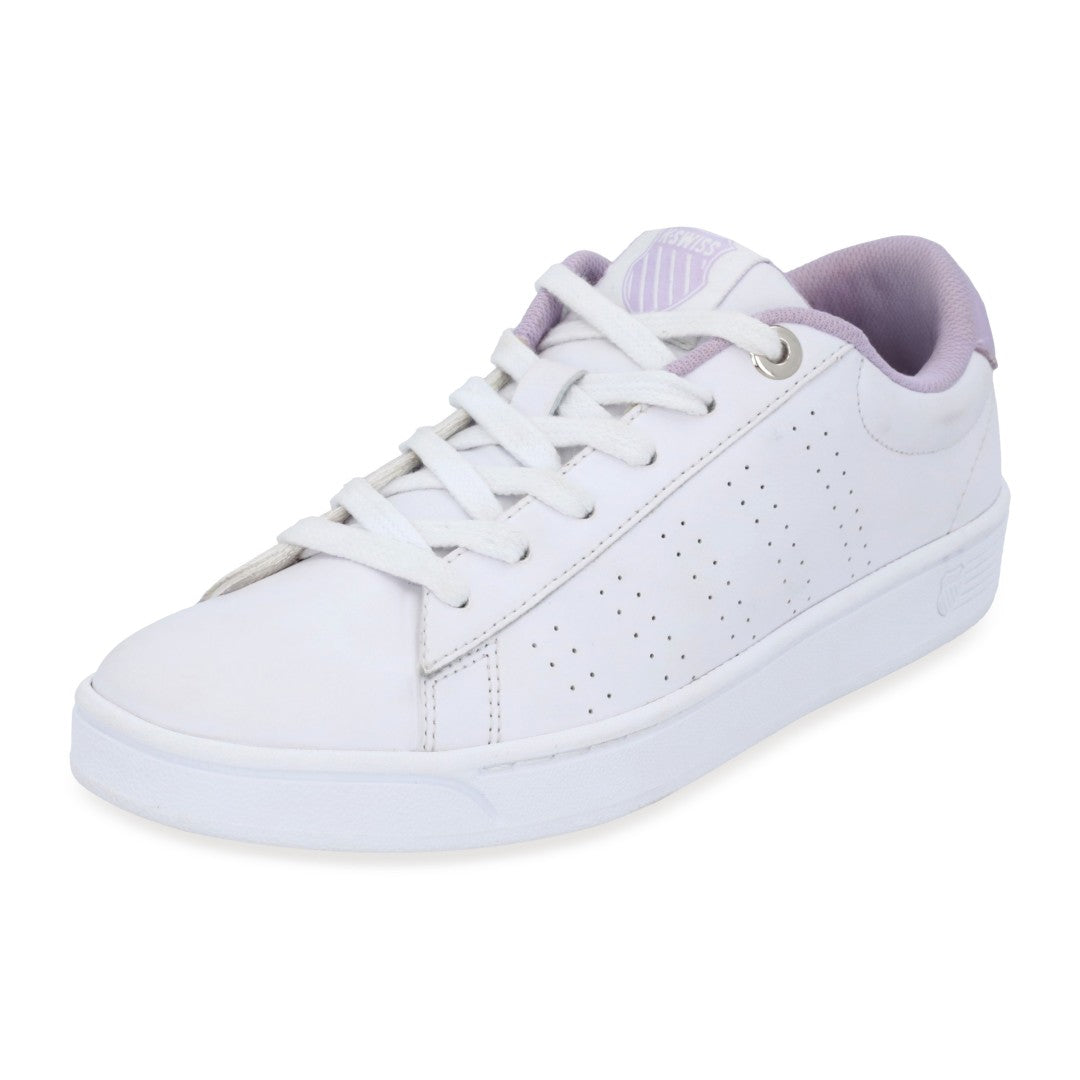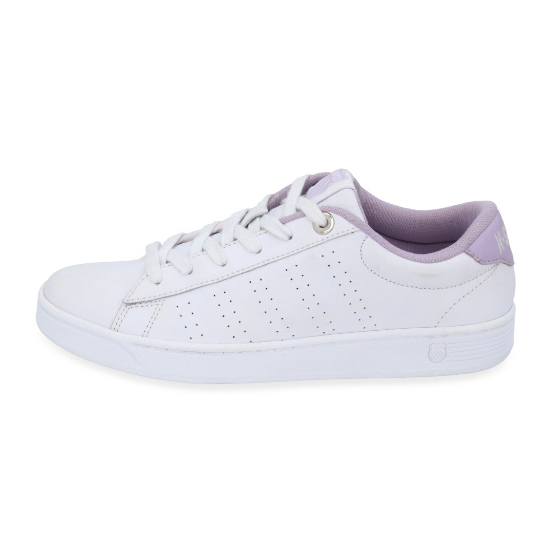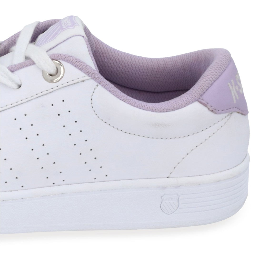 Tenis K-Swiss clásico casual para dama color blanco, con detalles de costura lateral y cordones ajustables. Diseño versátil que combina estilo auténtico y comodidad para el día a día o actividades deportivas ligeras.
