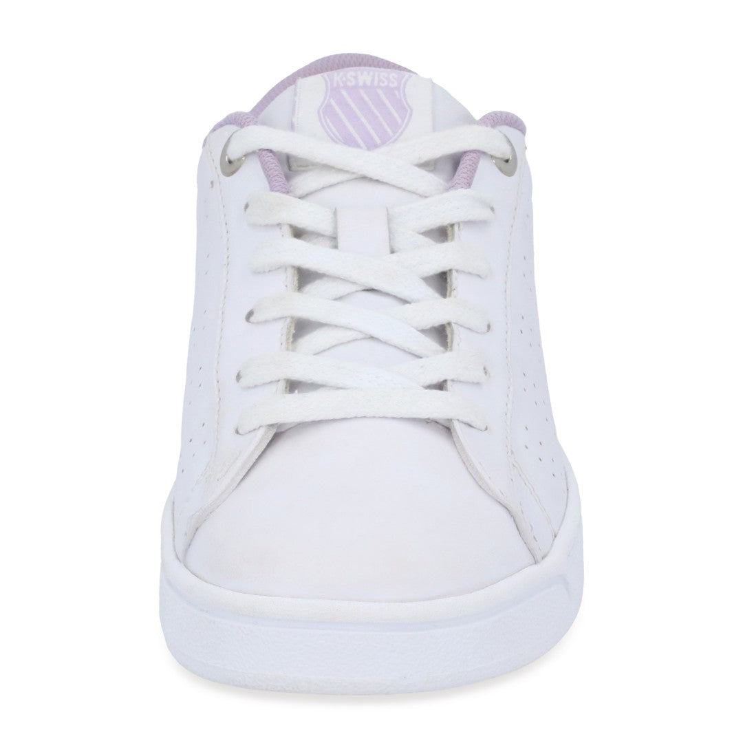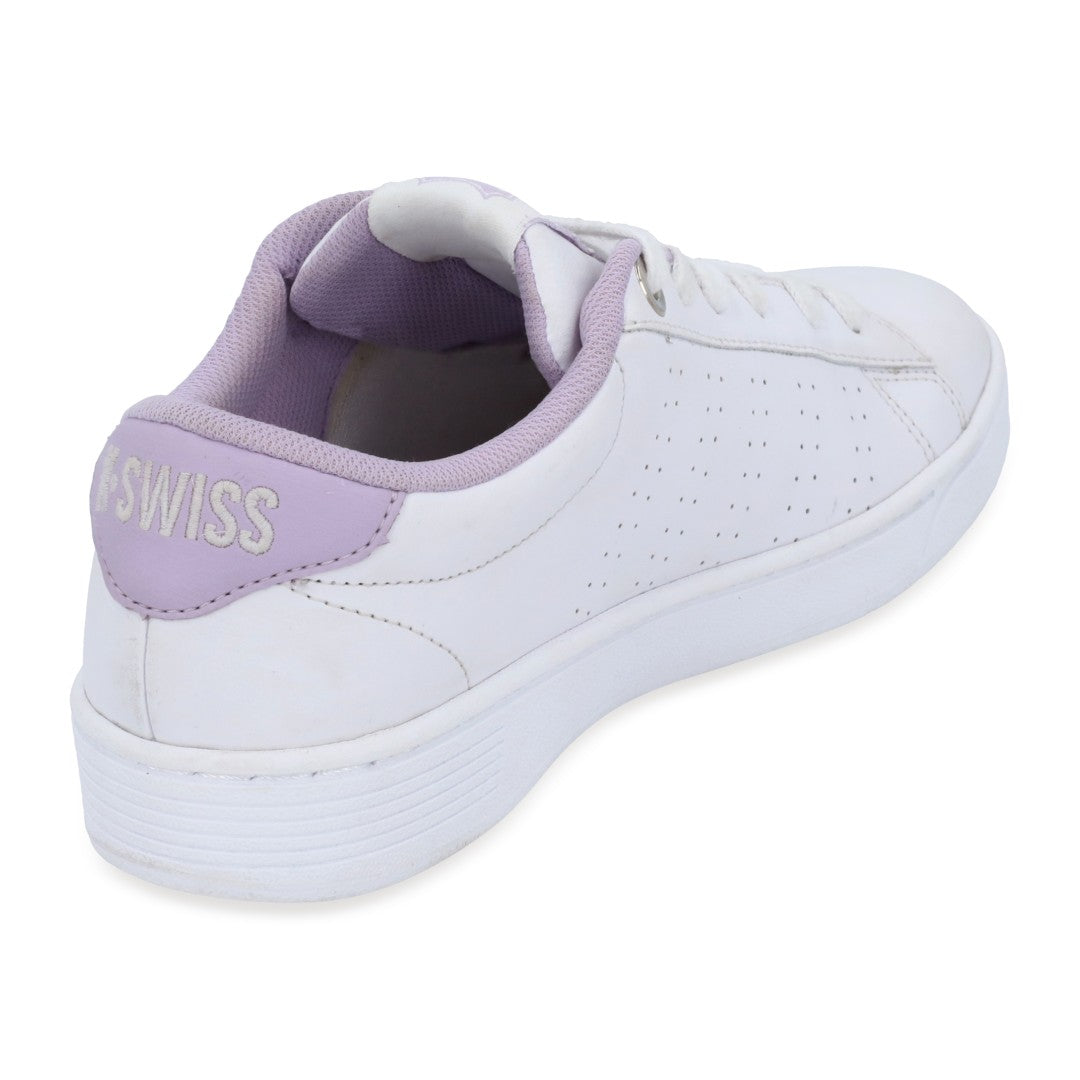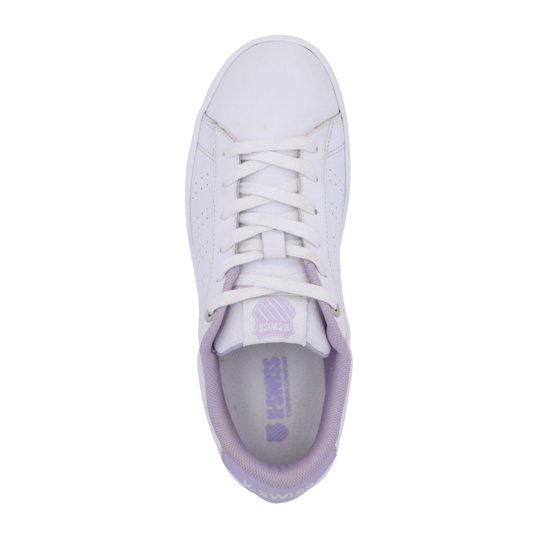 Tenis K-Swiss clásico casual para dama color blanco, con detalles de costura lateral y cordones ajustables. Diseño versátil que combina estilo auténtico y comodidad para el día a día o actividades deportivas ligeras.