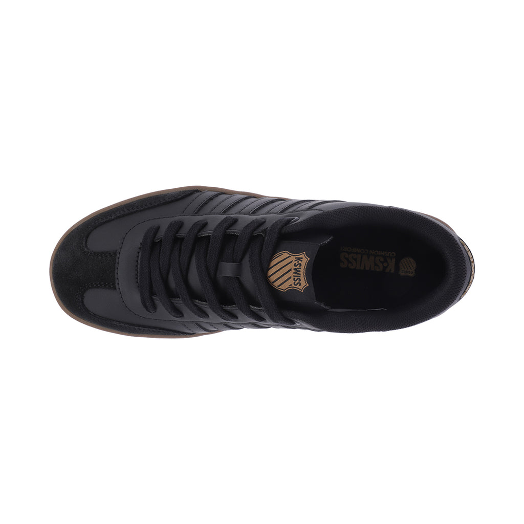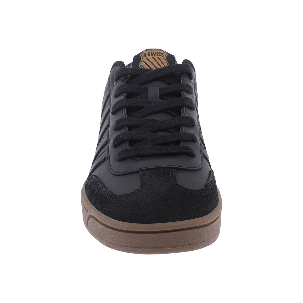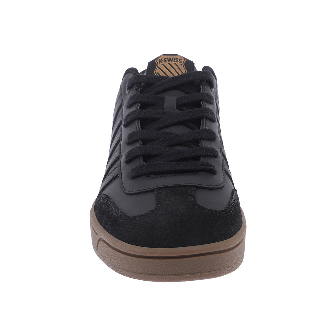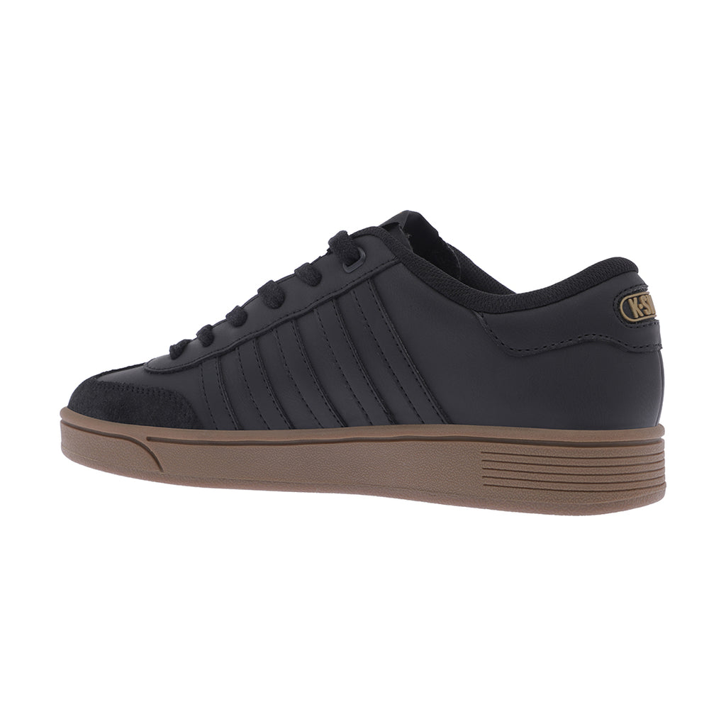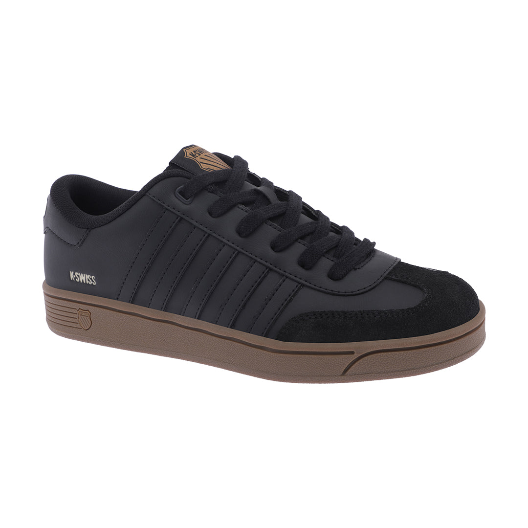 Tenis K-Swiss clásico casual para caballero en color negro, con detalles de costura lateral, cordones ajustables y franjas distintivas. Suela color liga que aporta estabilidad y estilo urbano para uso diario o casual.