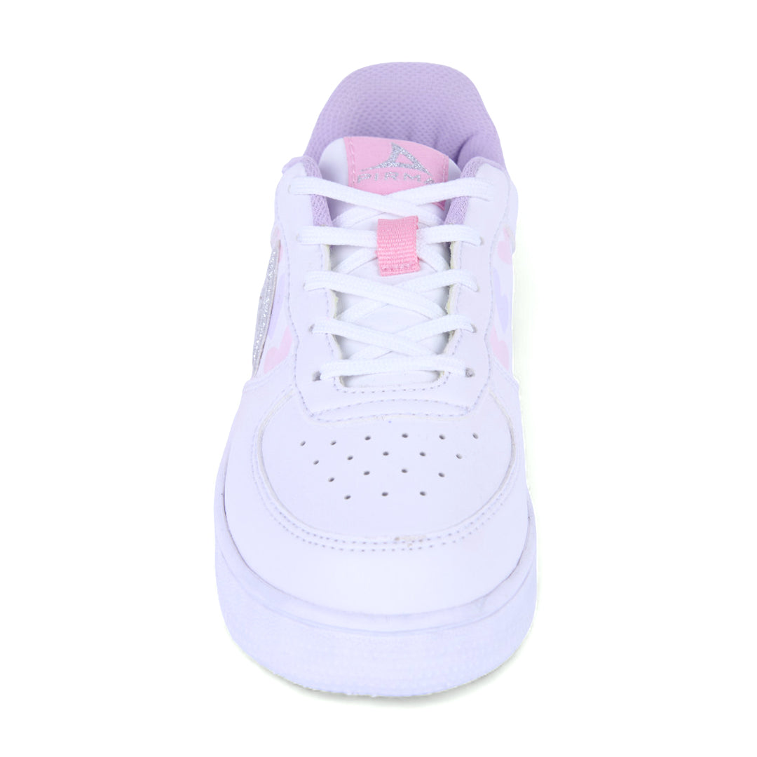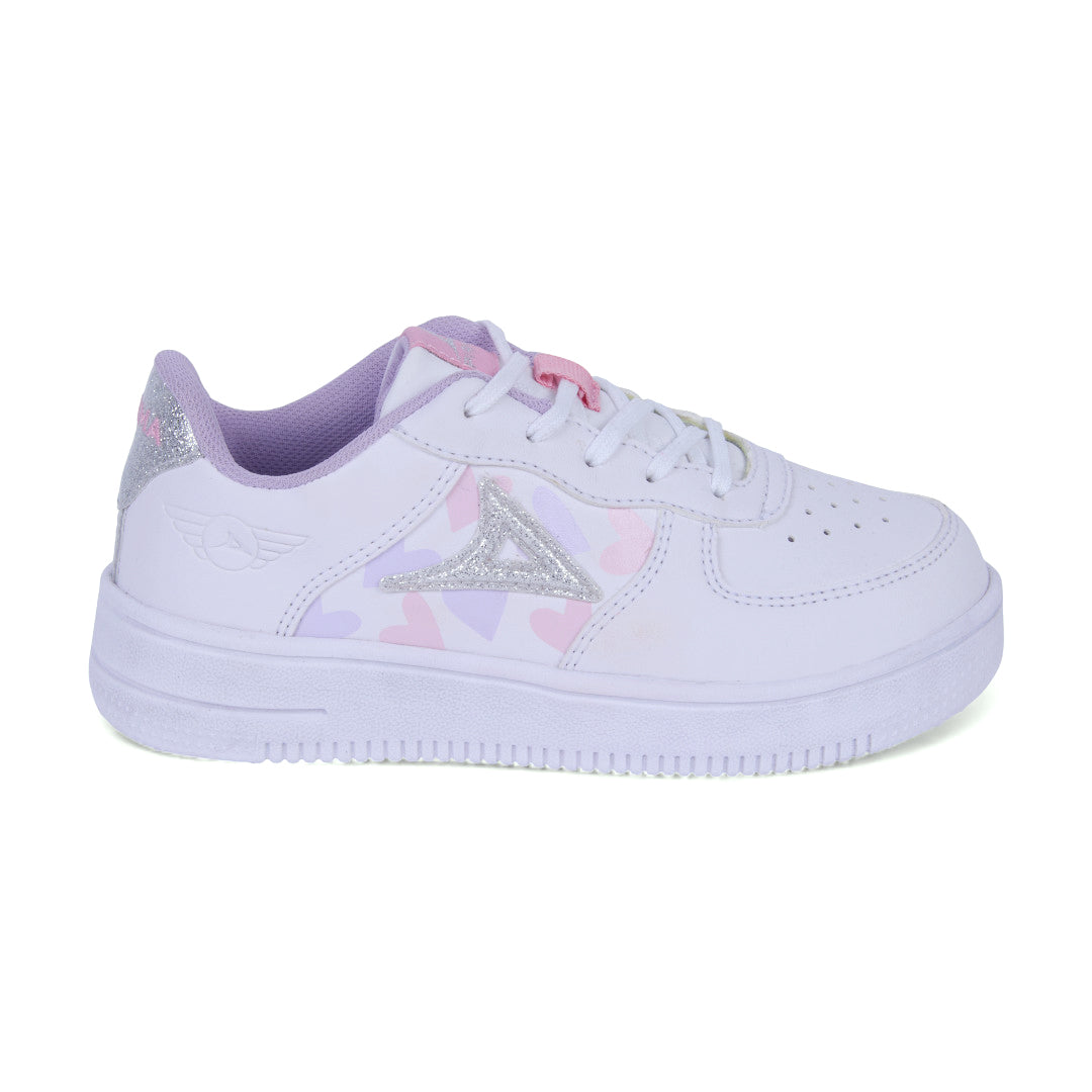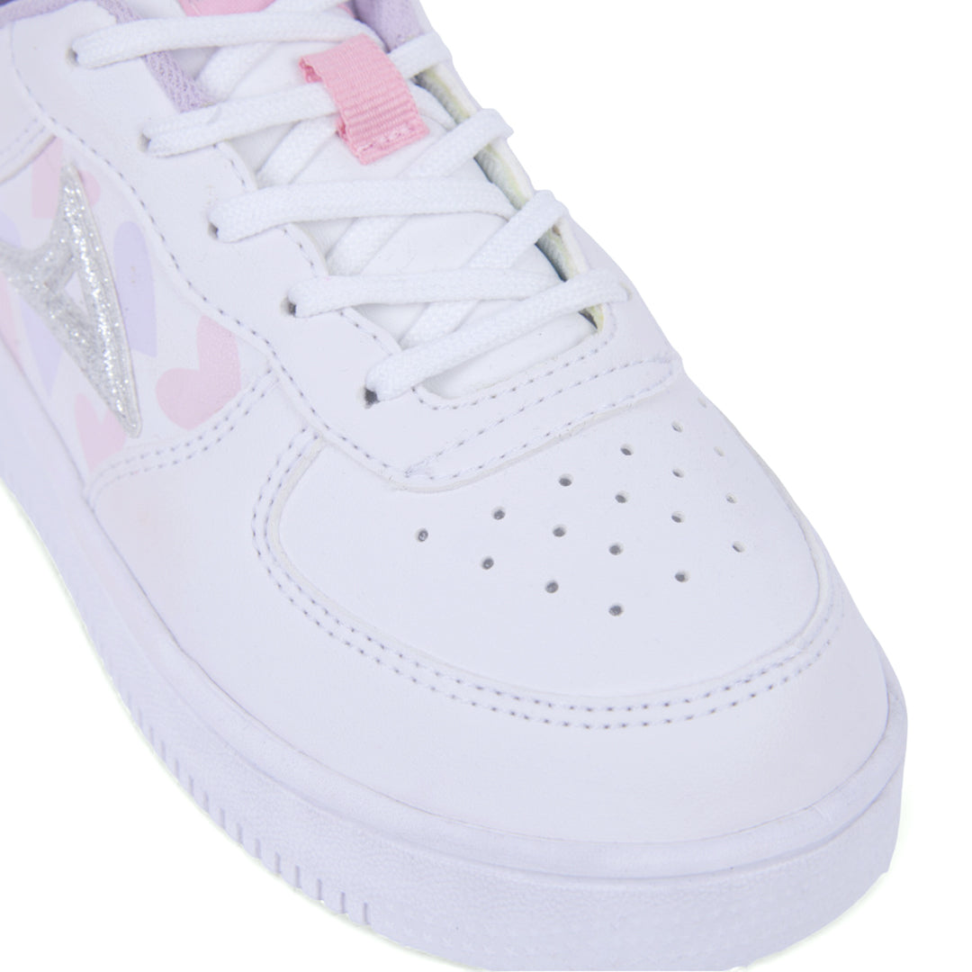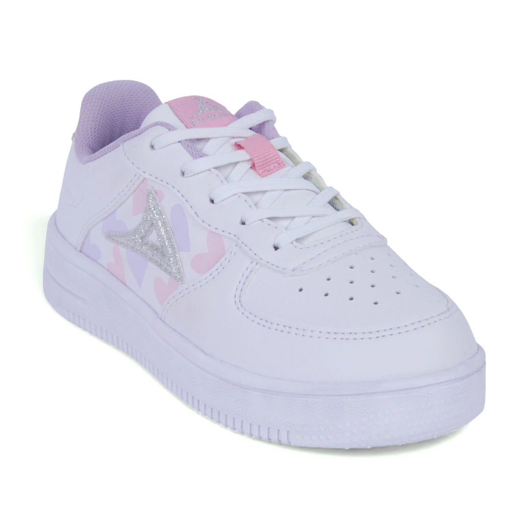 Tenis casual para niña en color blanco con detalles rosa y agujetas ajustables; cómodos, ligeros y perfectos para uso diario.