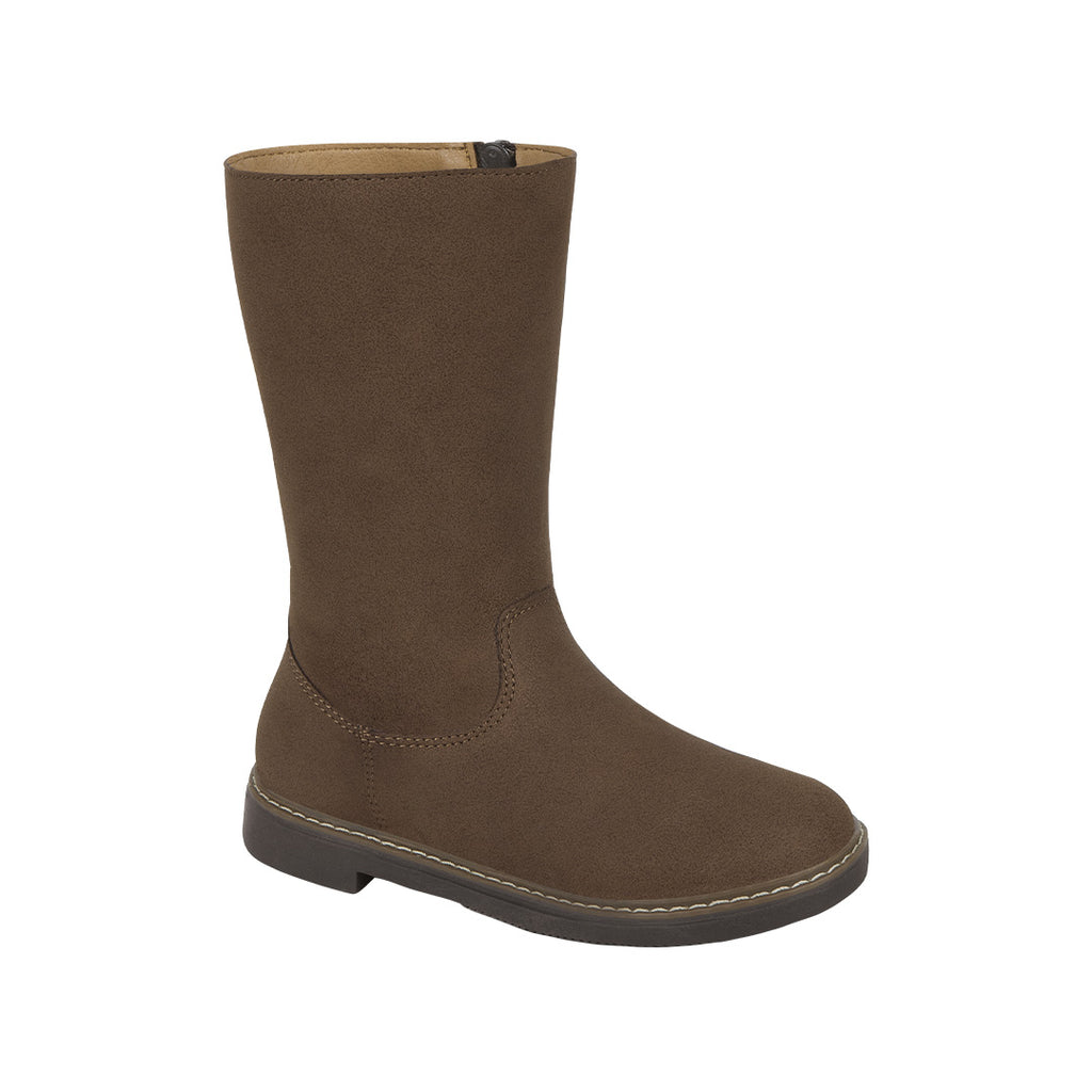Bota de piso en color café con tubo alto de textil tipo gamuza, cierre lateral y punta redonda. Incluye plantilla sintética para mayor comodidad.