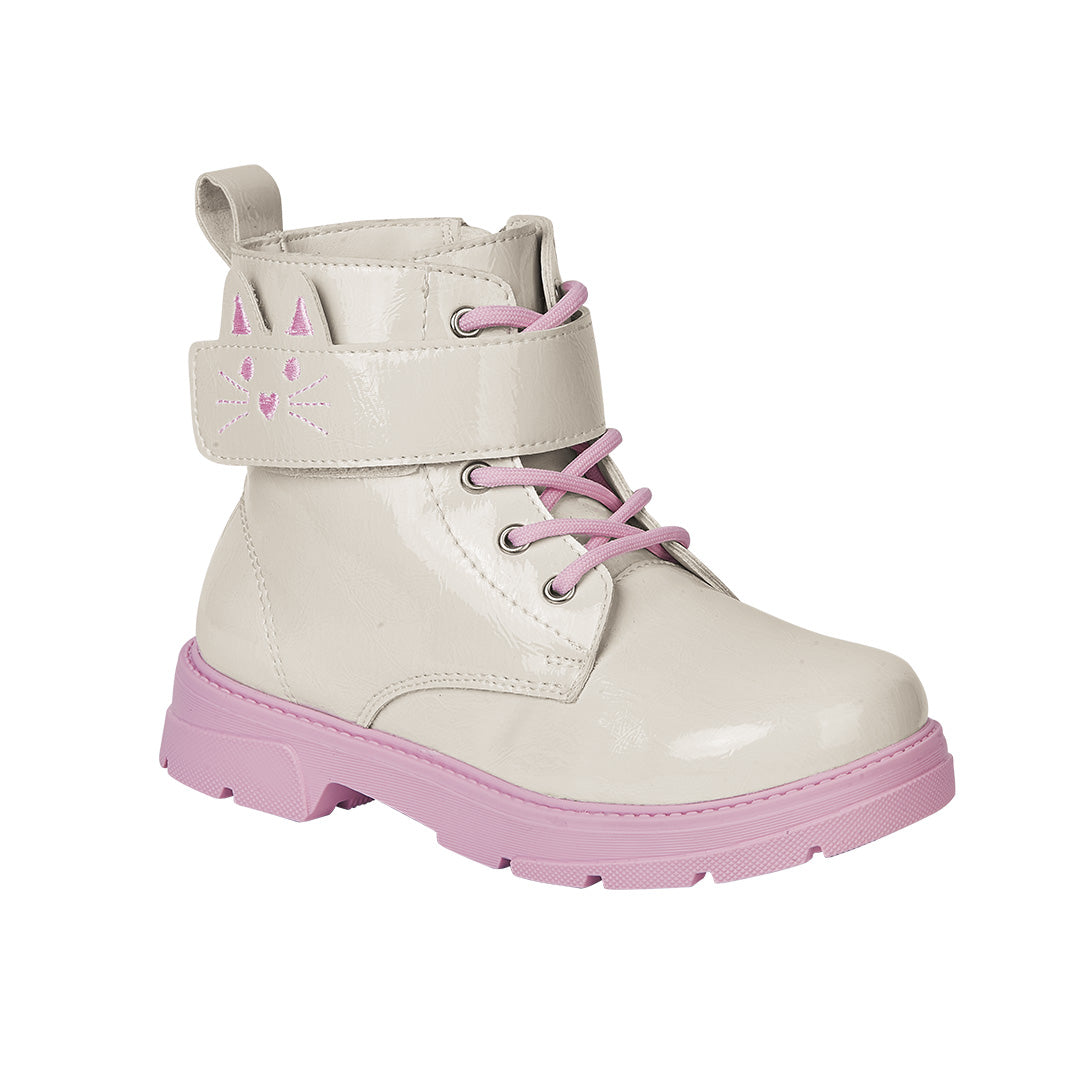 Botín de piso para niñ@s color hueso con cordones, cierre interno y cinta decorativa. Punta redonda y plantilla textil cómoda para uso diario.