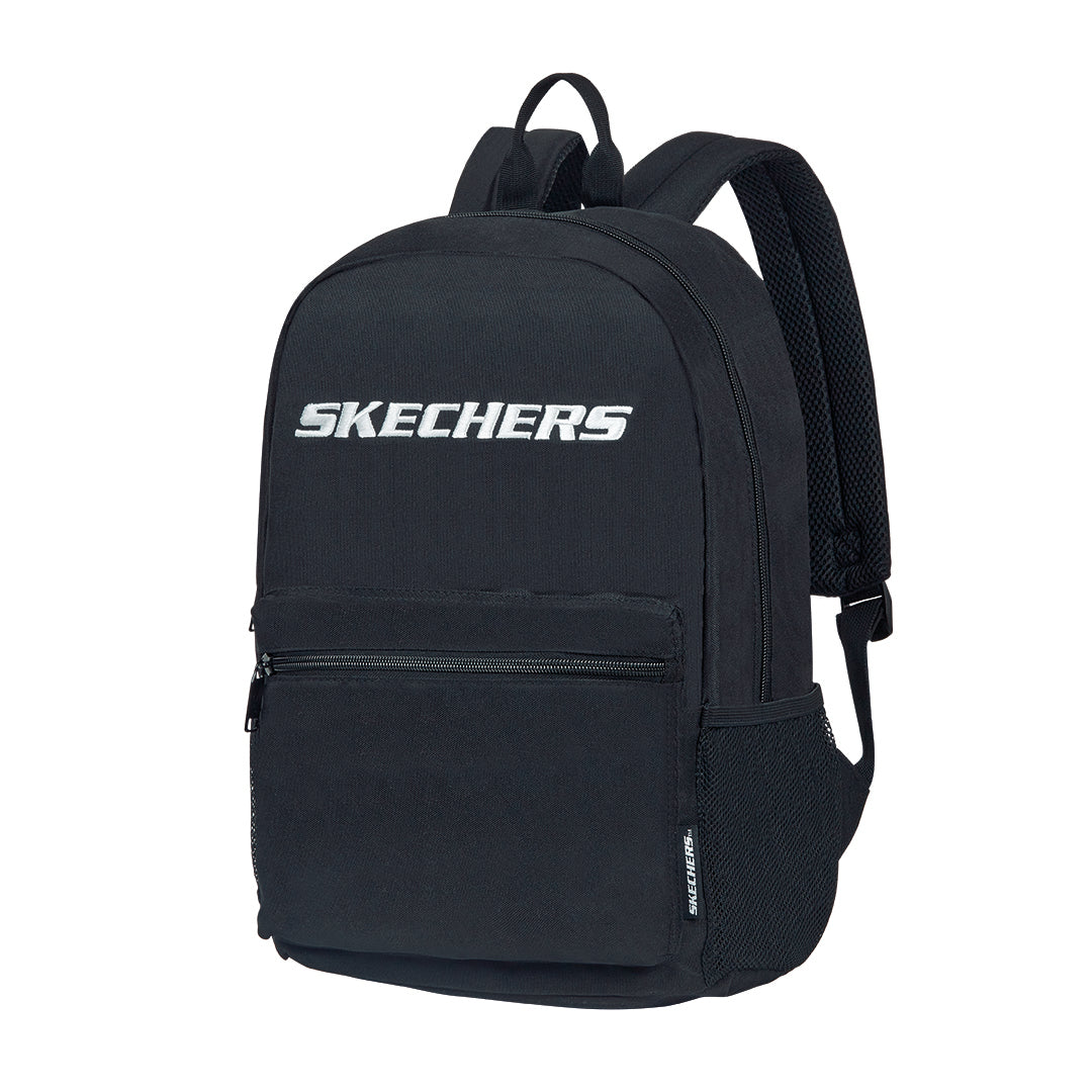 Mochila Skechers negra con bolsa frontal con cierre, compartimento para laptop y logo al frente; resistente, cómoda y lista para uso diario o escolar.