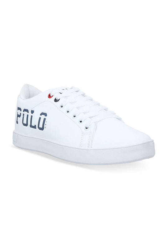 Tenis deportivo polo club by cklass de color blanco con corte sintético y de suela color blanco; detalle de nombre de la marca en lateral con cinta ajustable.