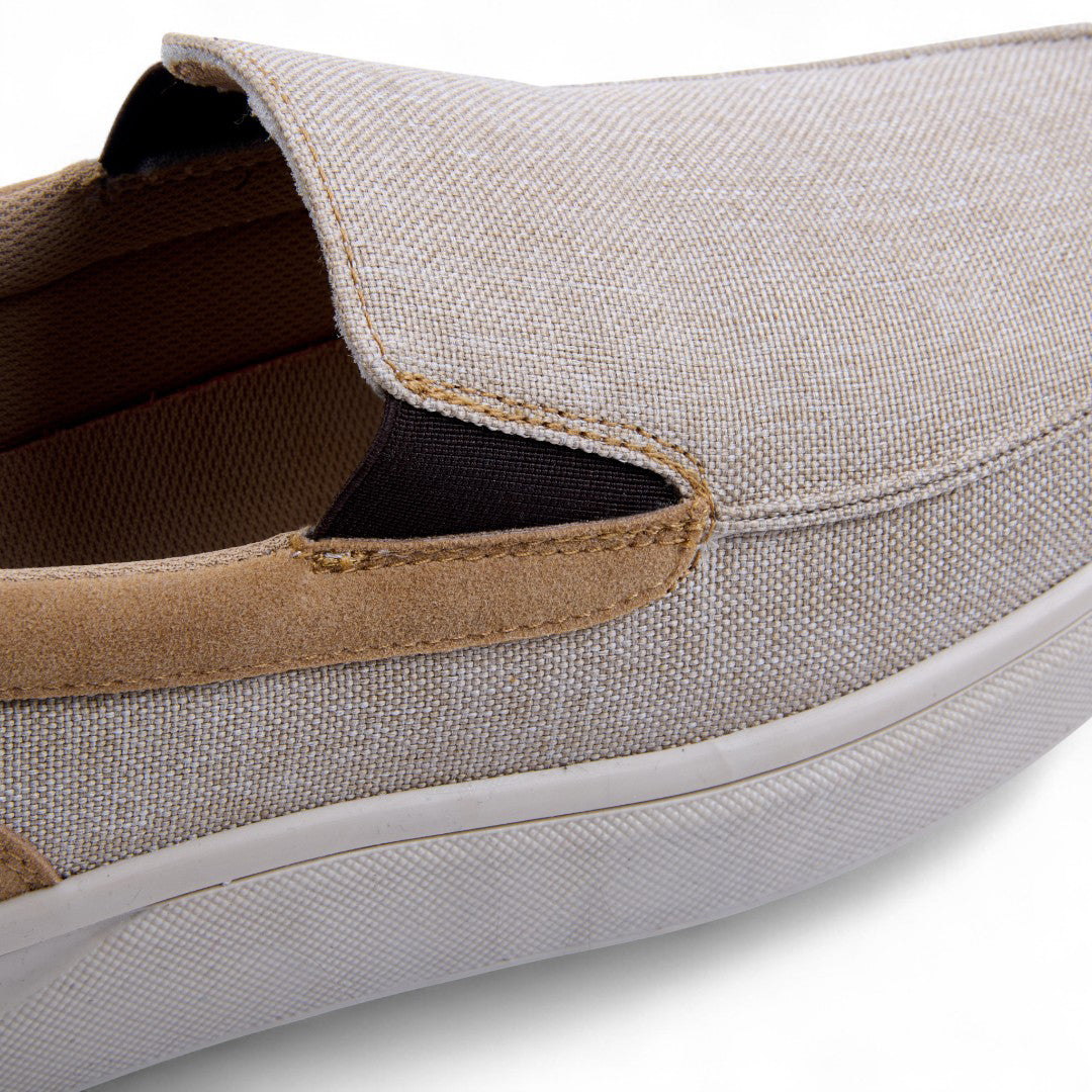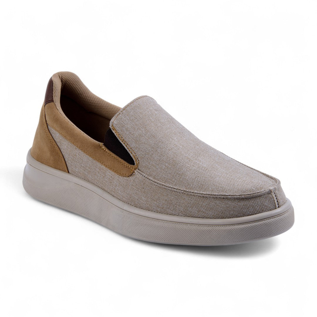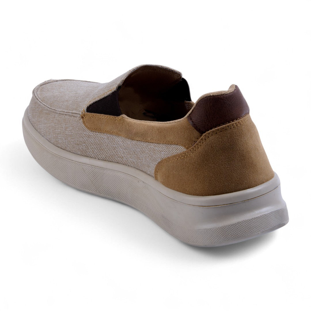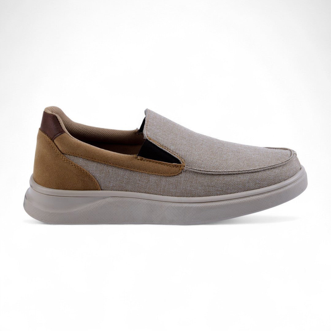 Mocasín de piso tipo slip-on con elástico lateral y plantilla acolchada. Color beige versátil que combina con cualquier look casual o de oficina. Plantilla textil para máxima comodidad y suela estable para uso diario, garantizando estilo y confort durante todo el día.