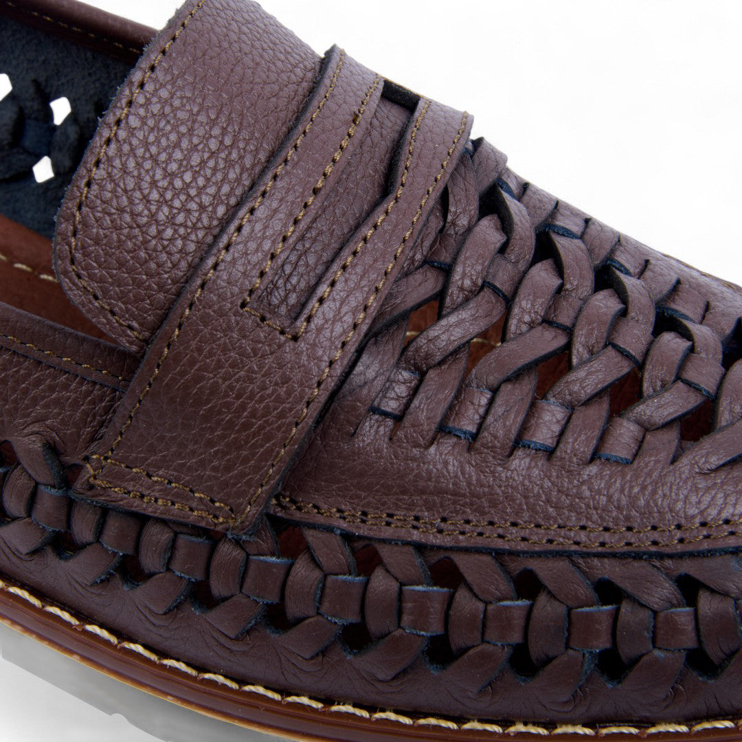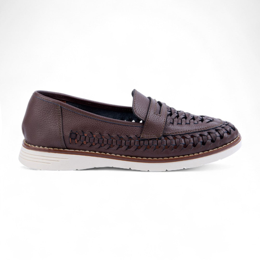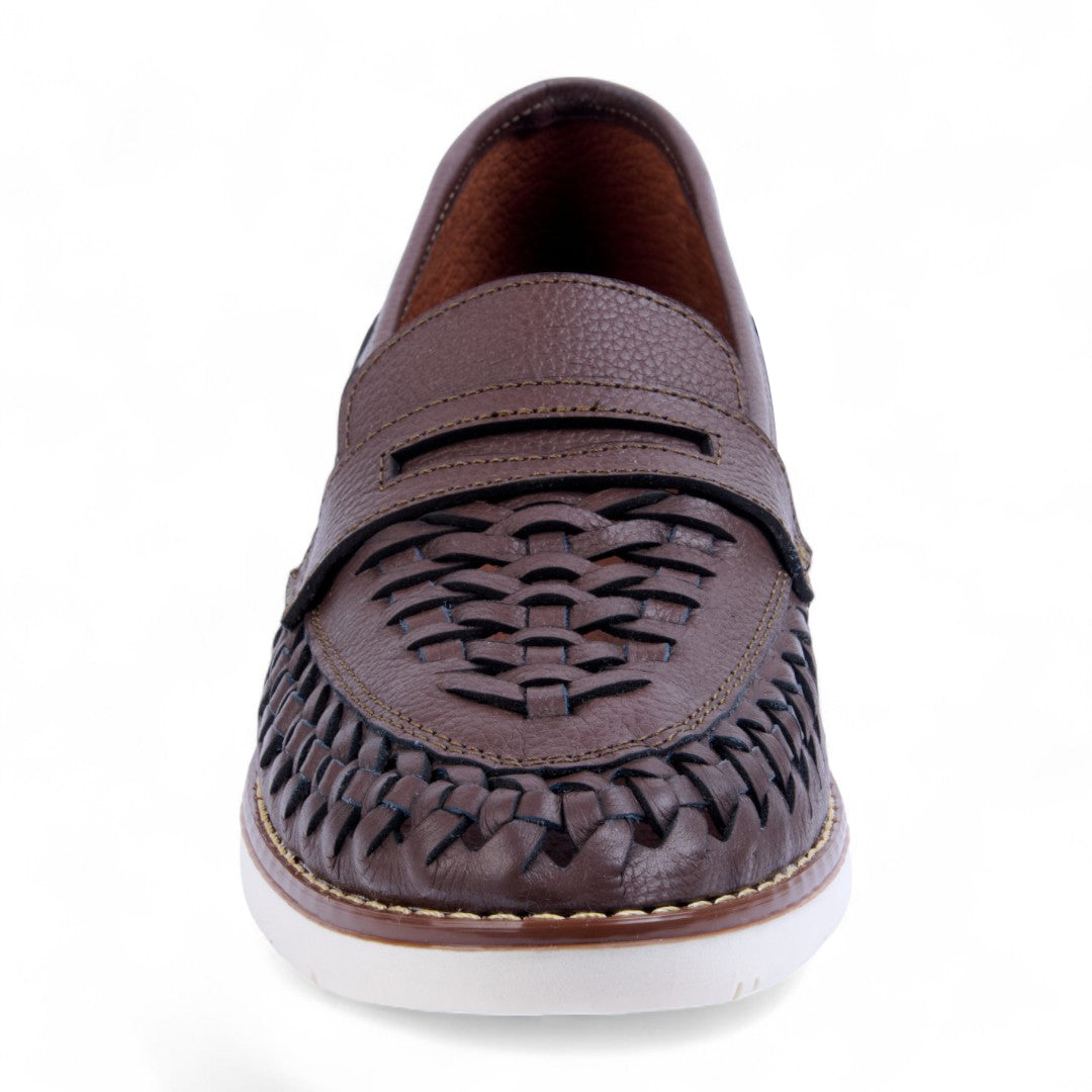 Mocasín de piso elaborado en piel vacuno color café con diseño trenzado y antifaz clásico. Incluye plantilla acolchada de cerdo que proporciona suavidad y confort en cada paso. Un modelo elegante y versátil ideal para looks formales o casuales con estilo sofisticado.