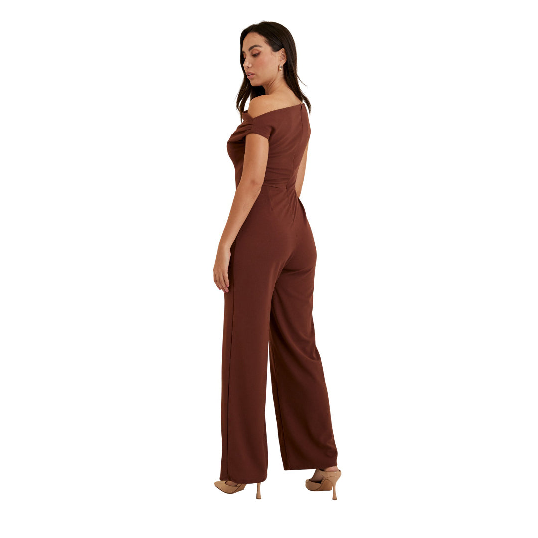 Jumpsuit color café con elegante escote asimétrico y delicados pliegues en el busto. Corte definido a la cintura que realza la figura y pantalón de pierna ancha que aporta movimiento y sofisticación. Confeccionado en poliéster con elastano para un ajuste cómodo y flexible. Ideal para eventos formales o looks modernos con estilo minimalista.