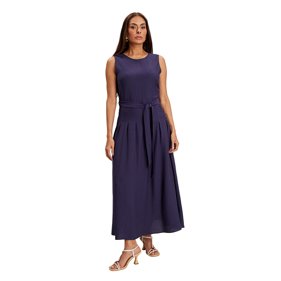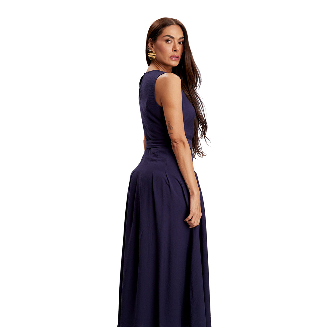 Jumpsuit azul mezclilla sin mangas, cuello camisero y botones frontales; pantalón de pata ancha con pinzas, bolsillos y cinturón a juego. Moderno, cómodo y favorecedor.