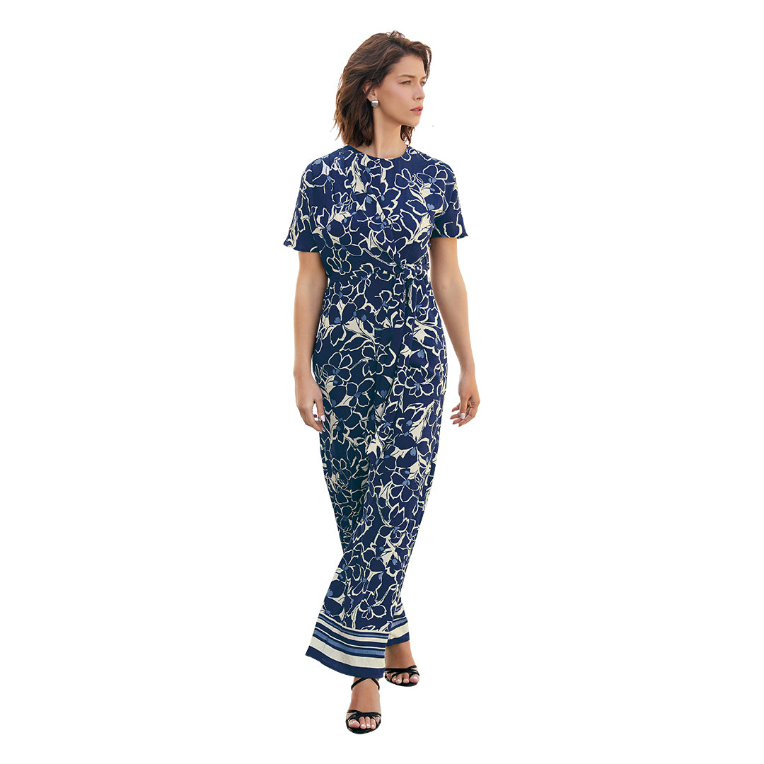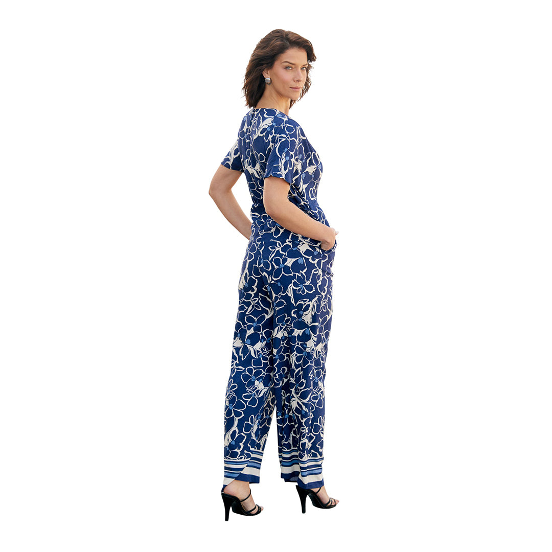 Jumpsuit floral multicolor con blusa de cuello redondo, manga corta, pliegues en hombros, lazo en cintura y pantalón ancho con cenefa; fresco, moderno y perfecto para días casuales o salidas especiales.