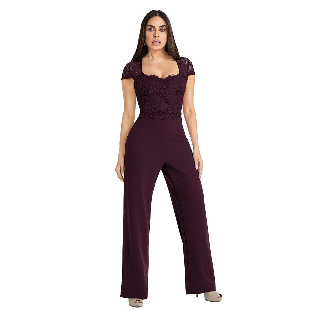 Jumpsuit de color tinto con blusa de encaje, escote en forma de corazón, manga tipo casquillo y cierre en la parte trasera.