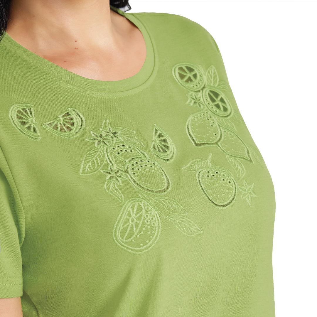 Playera verde limón. Escote redondo, terminado en bies. Manga corta. Detalle de bordado de limones al color. Corte regular.