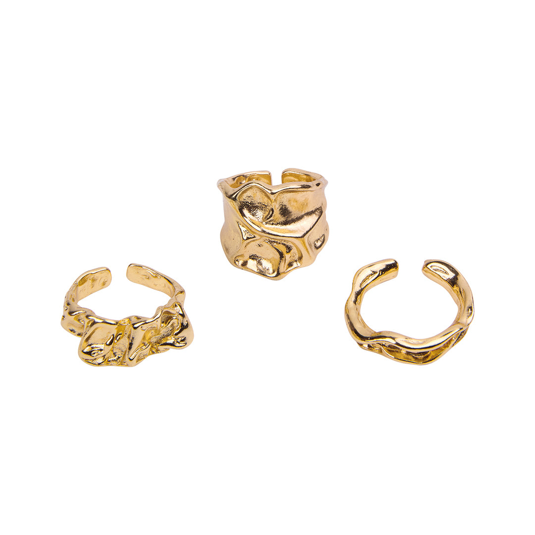 Set de tres anillos dorados ajustables con textura; modernos, elegantes y perfectos para complementar cualquier look.