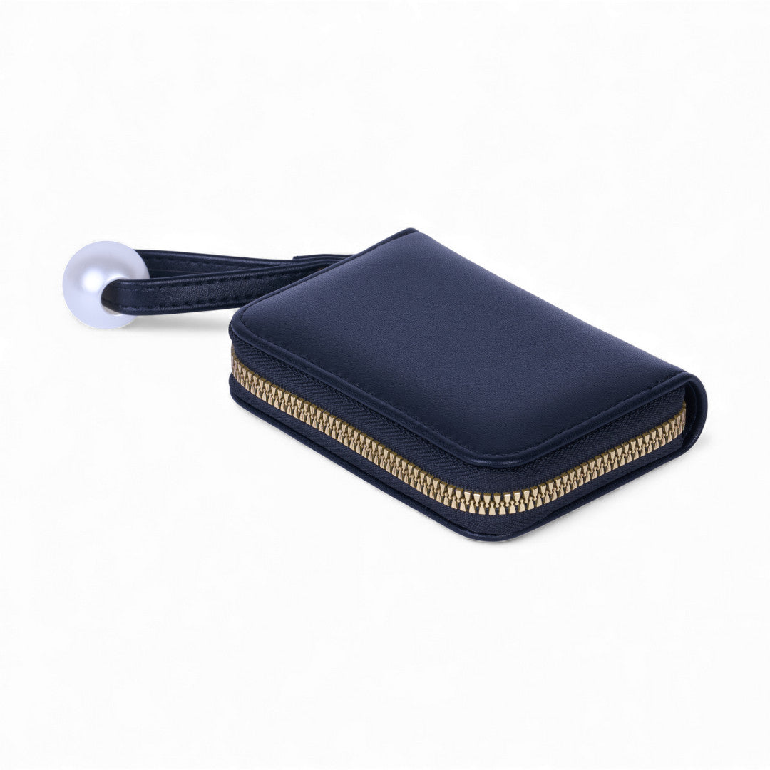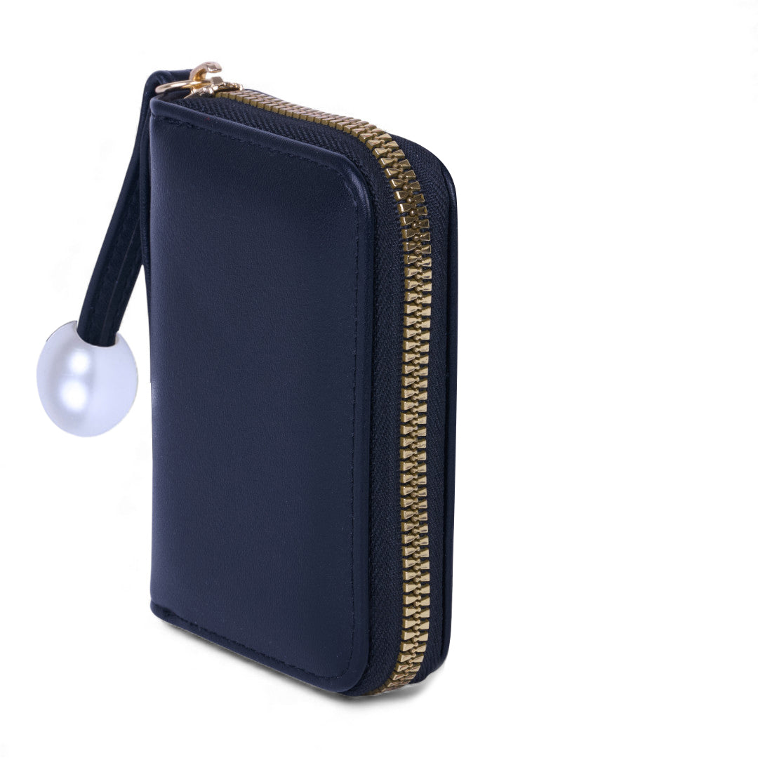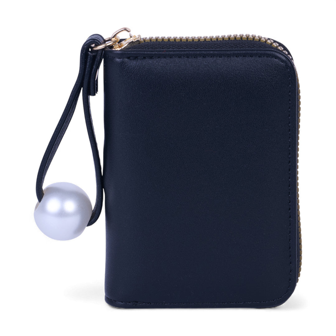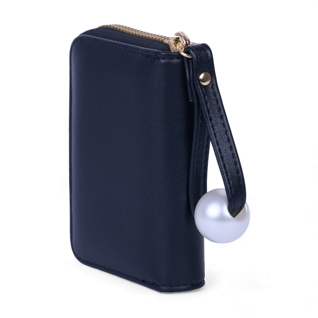 Tarjetero color negro con 11 compartimentos para tarjeta. Perla blanca decorativa en látigo.