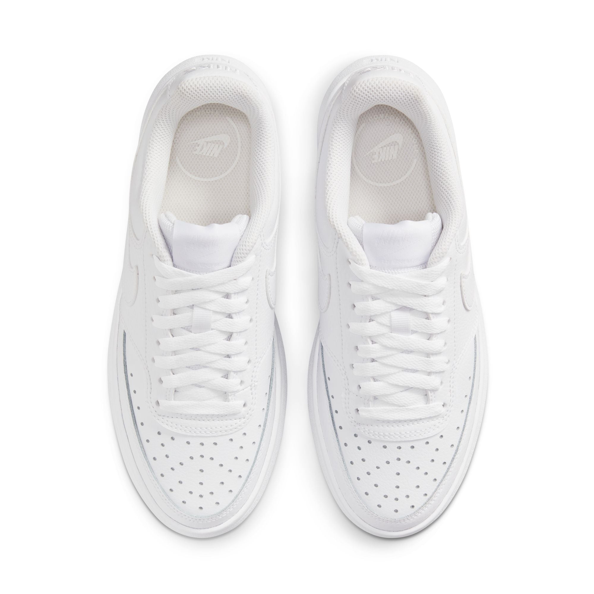 Tenis Nike Court Vision Alta para dama en color blanco, corte sintético con perforaciones en la punta, entresuela de espuma y lengüeta acolchada.