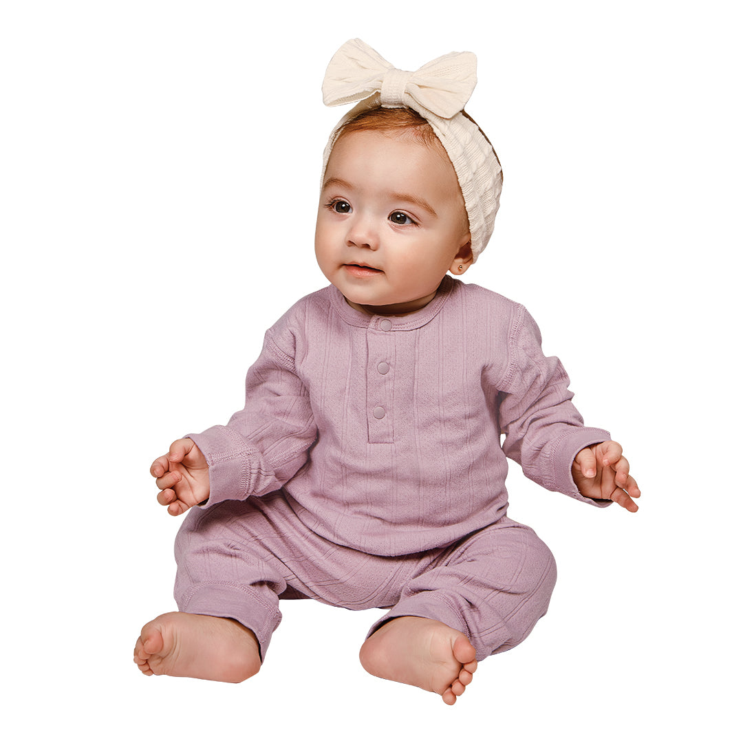 Conjunto rosa mauve de 2 piezas para bebé elaborado en algodón con textura de canalé. Playera de manga larga con puños anchos y botones de presión. Pantalón con cintura elástica y puños en tobillos. Suave, cómodo y perfecto para el día a día.