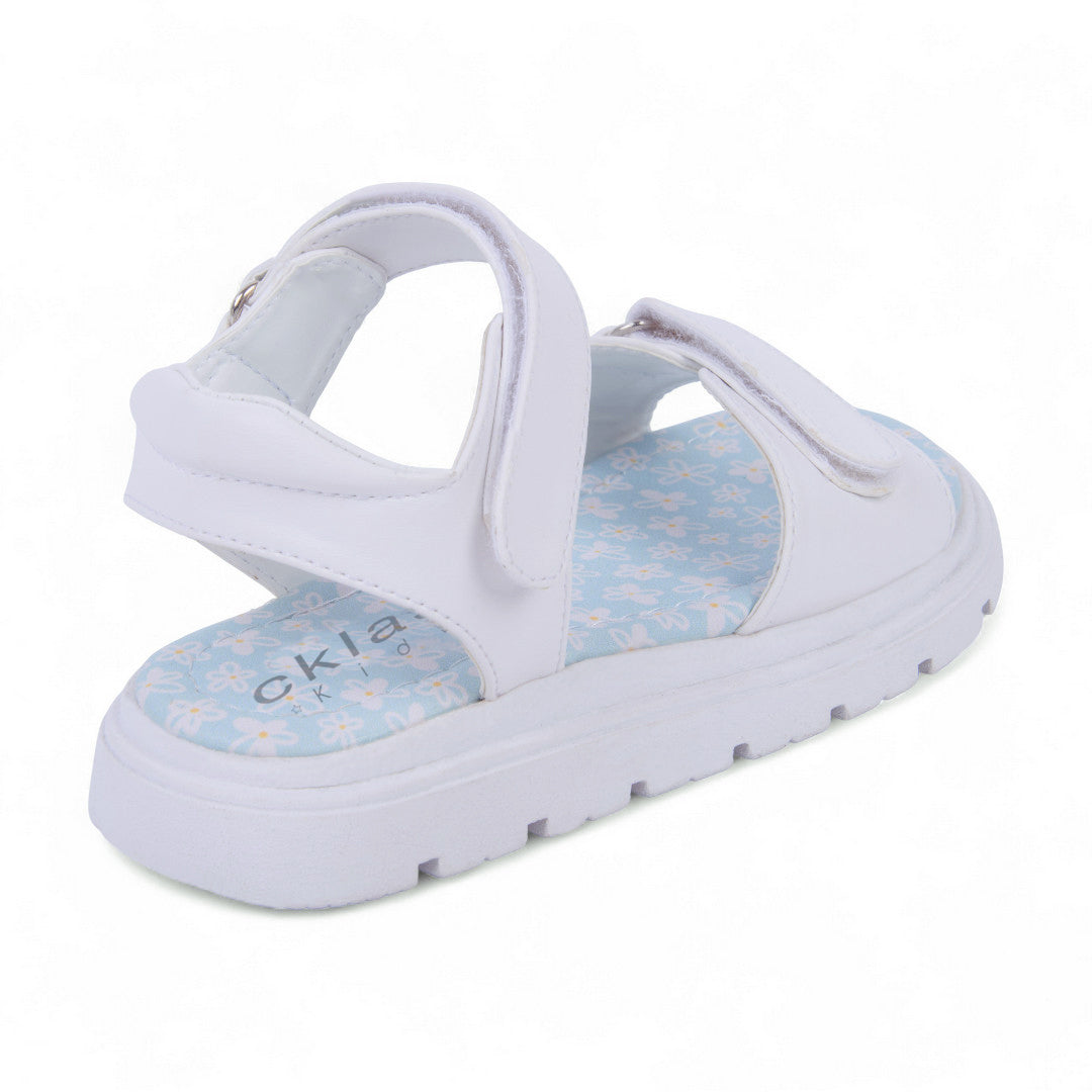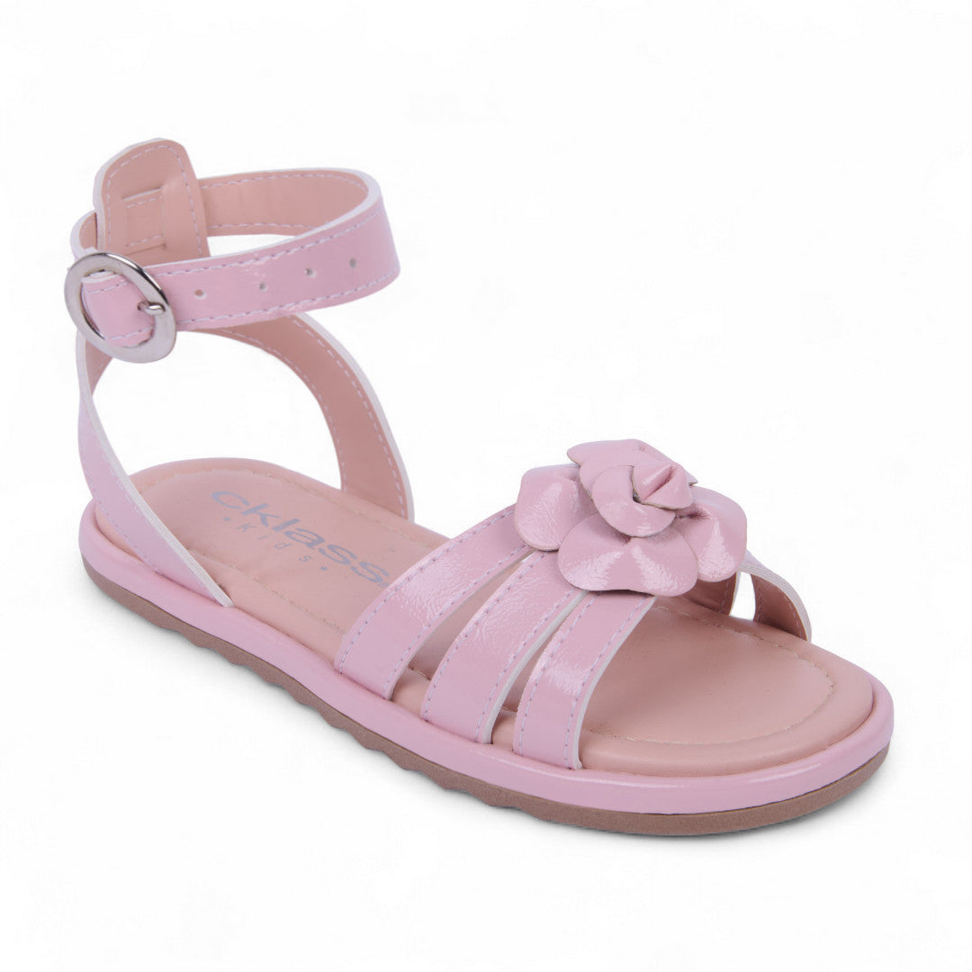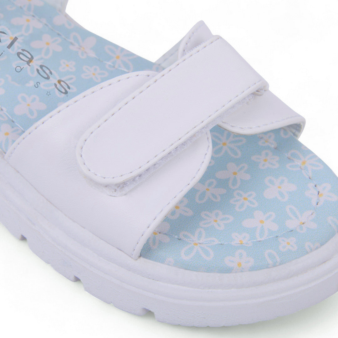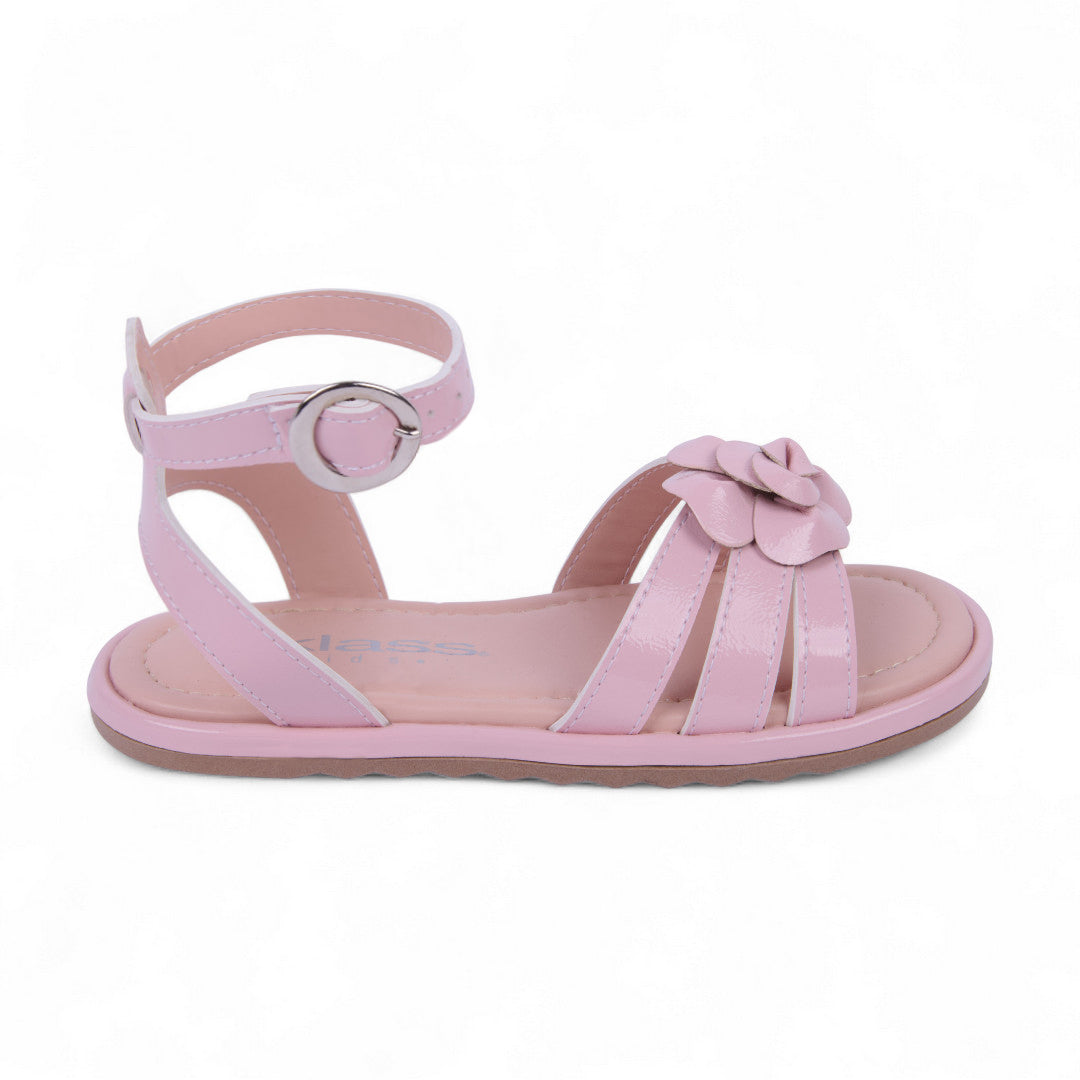Dúo de sandalias de piso en tonos rosa y blanco con diseños encantadores. El modelo blanco cuenta con látigos ajustables con cierre de contactel, mientras que el modelo rosa incluye un delicado detalle floral y pulsera con hebilla metálica. Fabricadas en material sintético con plantilla suave, ideales para niñas que buscan comodidad y estilo todos los días.