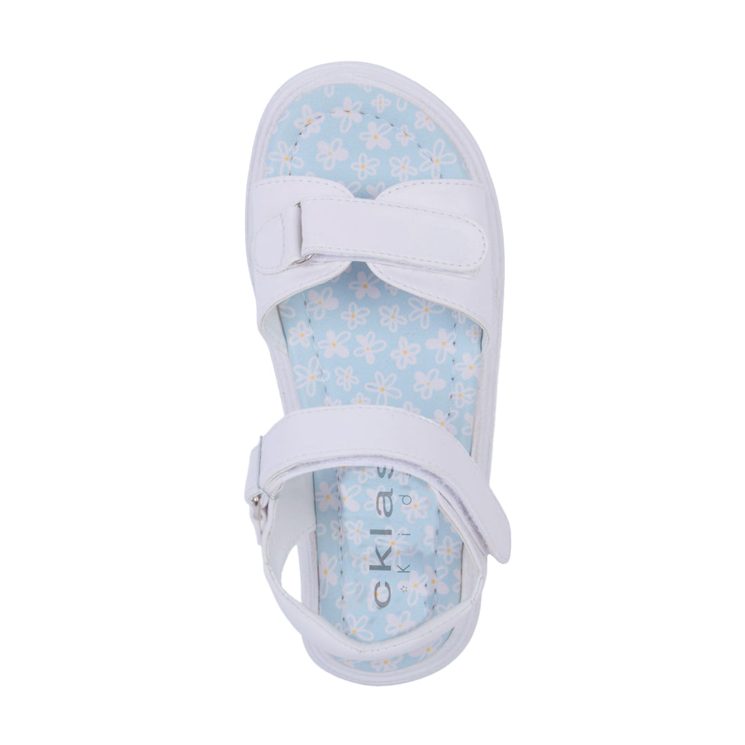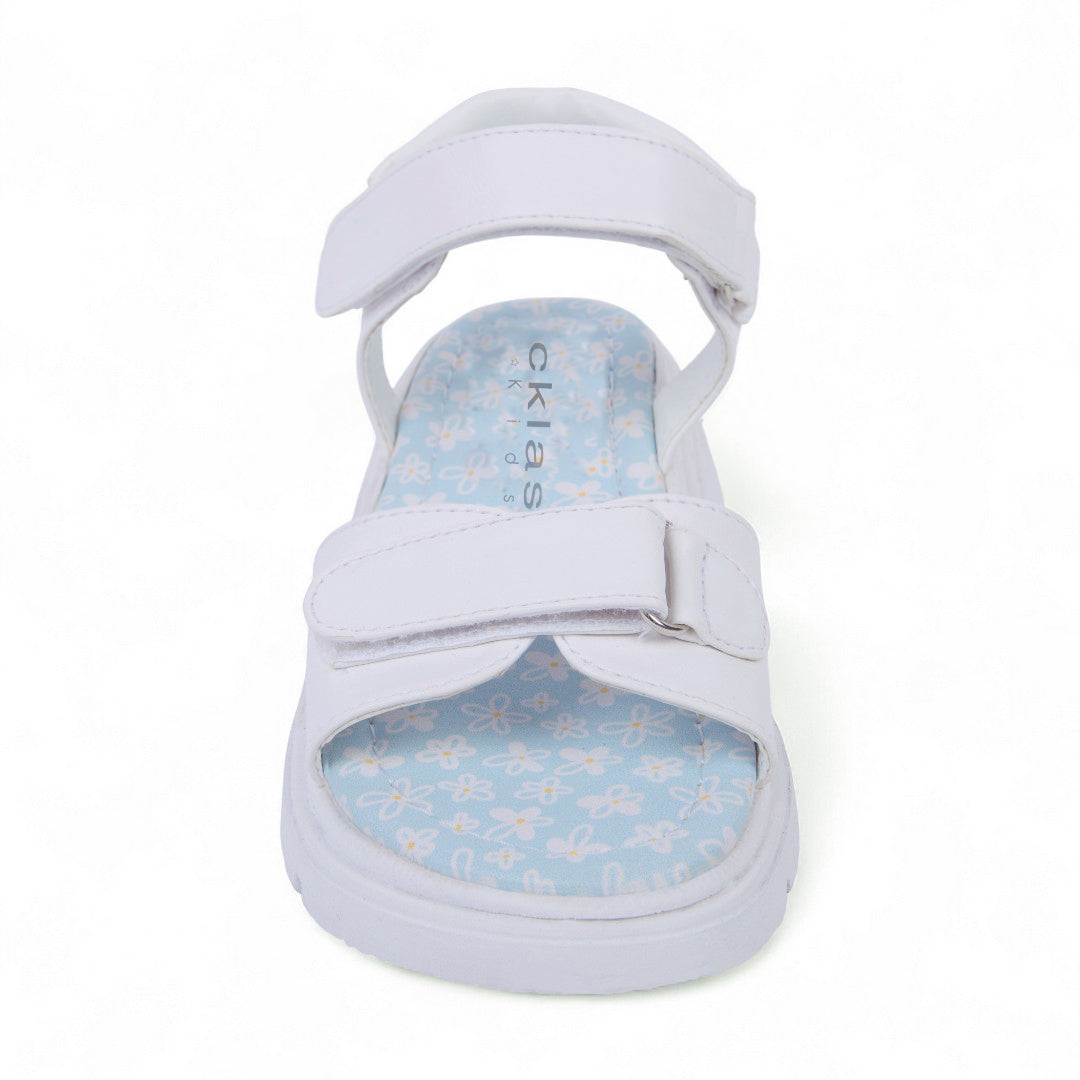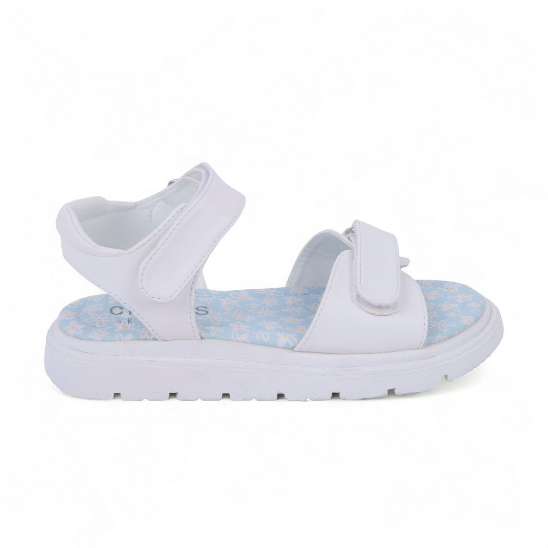 Dúo de sandalias de piso en tonos rosa y blanco con diseños encantadores. El modelo blanco cuenta con látigos ajustables con cierre de contactel, mientras que el modelo rosa incluye un delicado detalle floral y pulsera con hebilla metálica. Fabricadas en material sintético con plantilla suave, ideales para niñas que buscan comodidad y estilo todos los días.