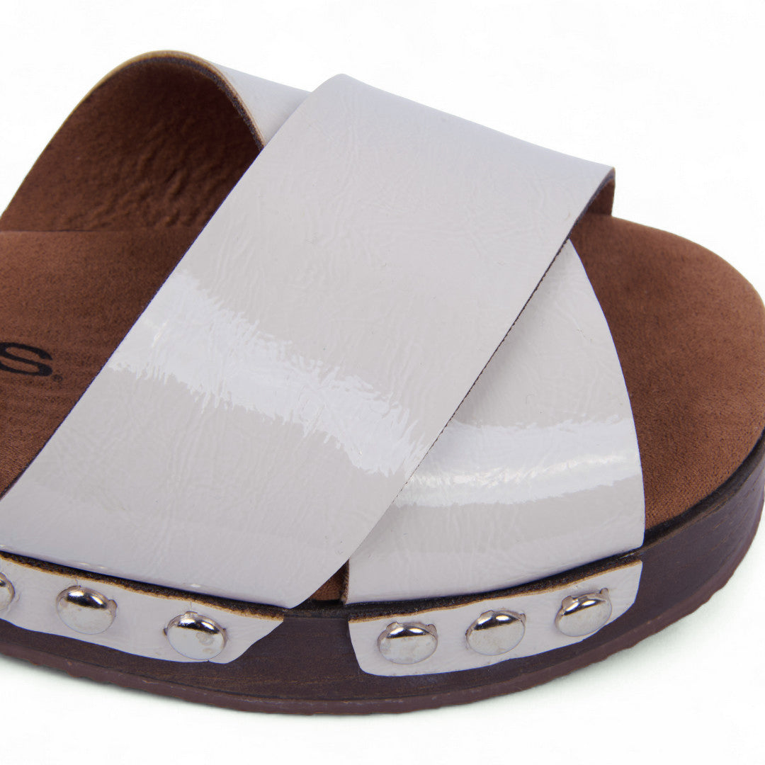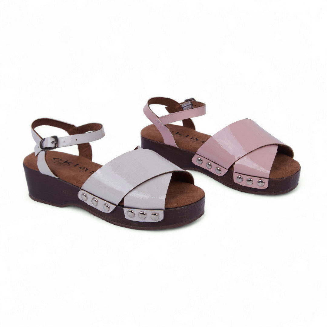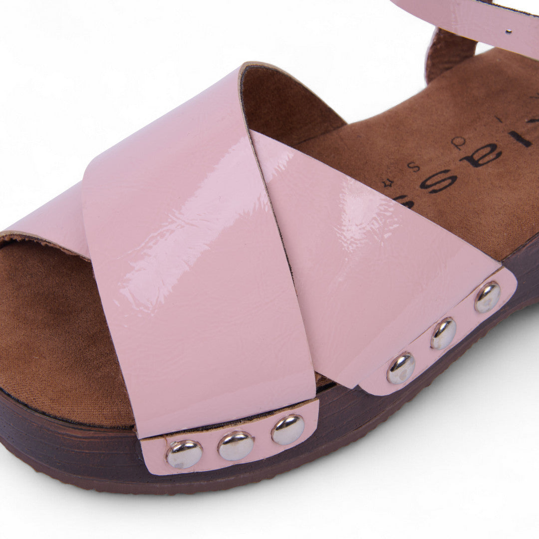 Dúo de sandalias de piso en tonos rosa e ivory con tiras cruzadas y aplicaciones de estoperoles decorativos. Incluyen pulsera ajustable para un ajuste seguro y plantilla textil que ofrece suavidad y comodidad. Fabricadas en material sintético, perfectas para crear looks frescos, modernos y femeninos durante todo el día.