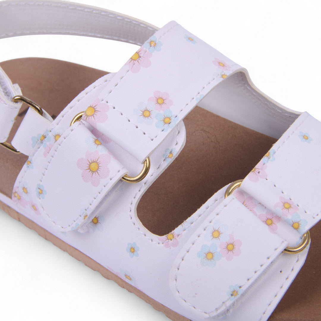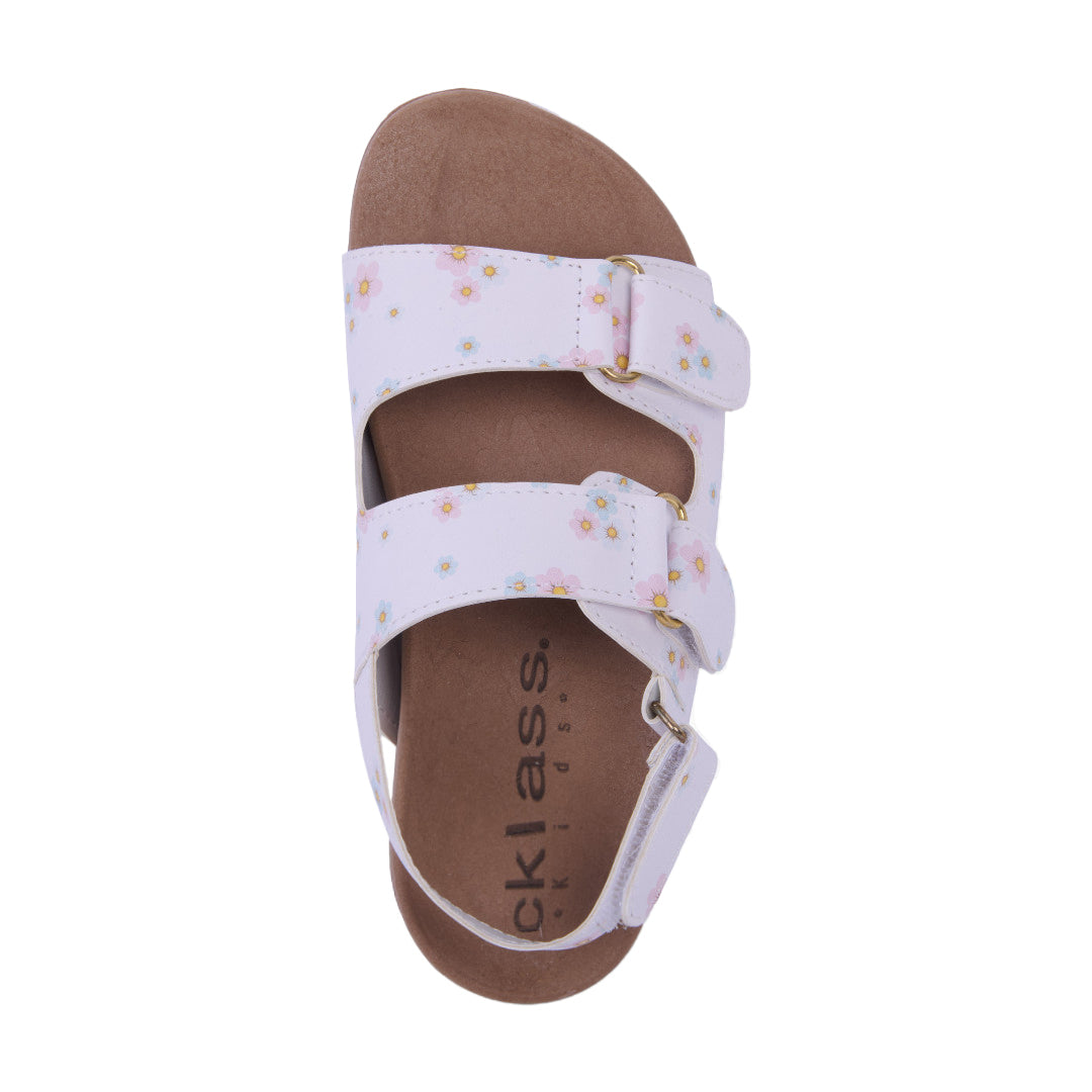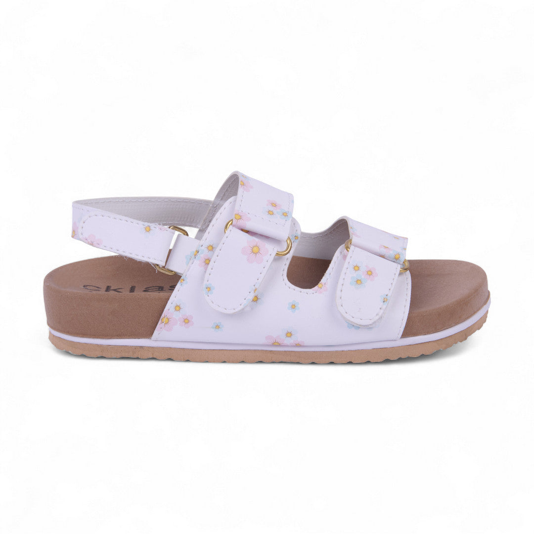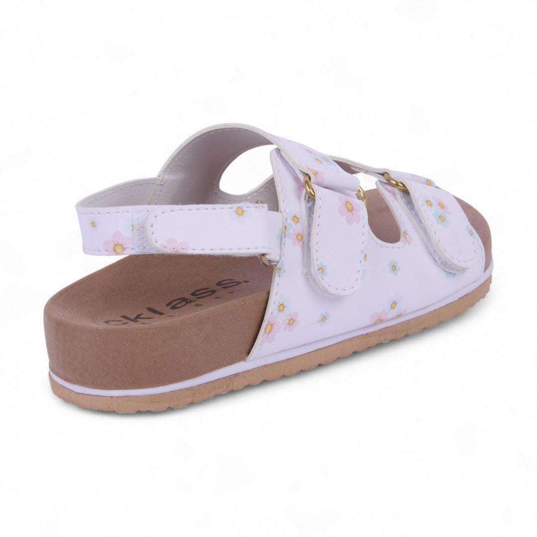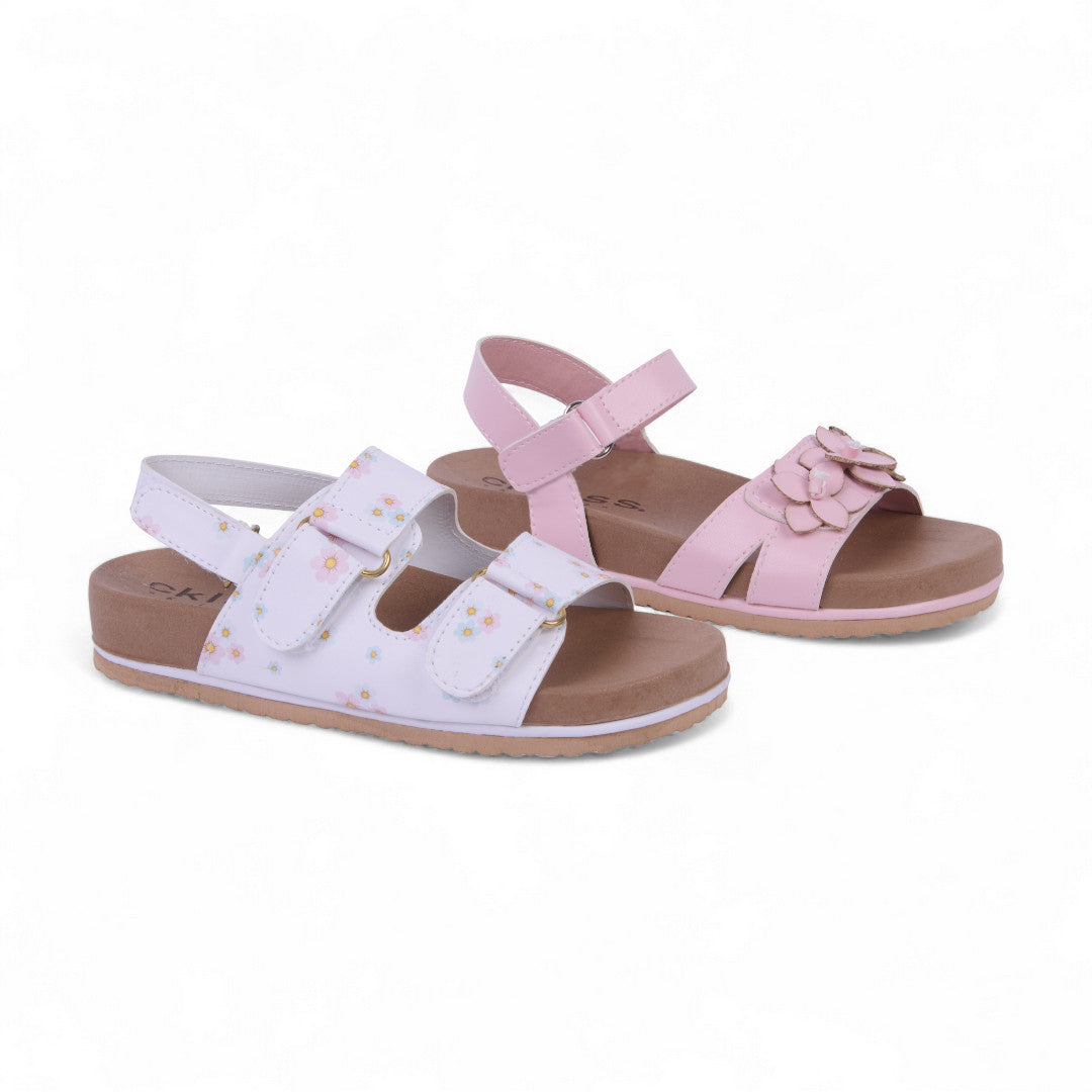 Dúo de sandalias de piso en rosa y blanco con detalle floral, látigos y pulseras ajustables con contactel; ligeras, cómodas y perfectas para uso diario infantil.